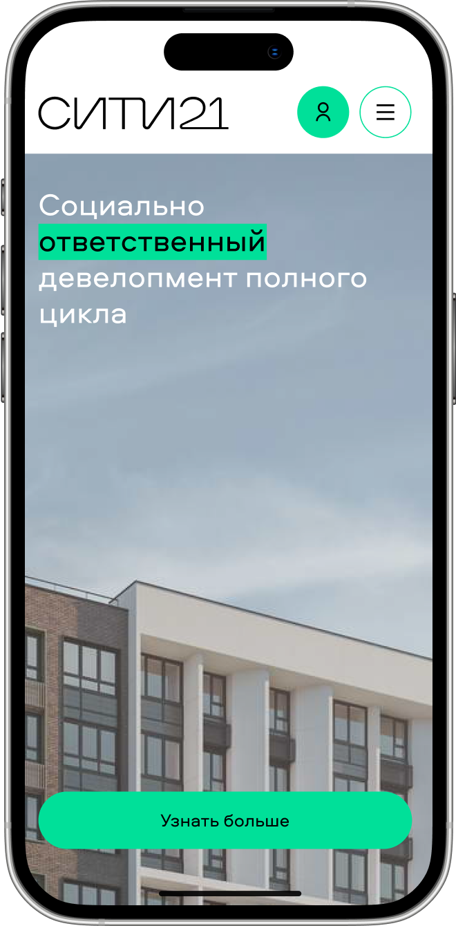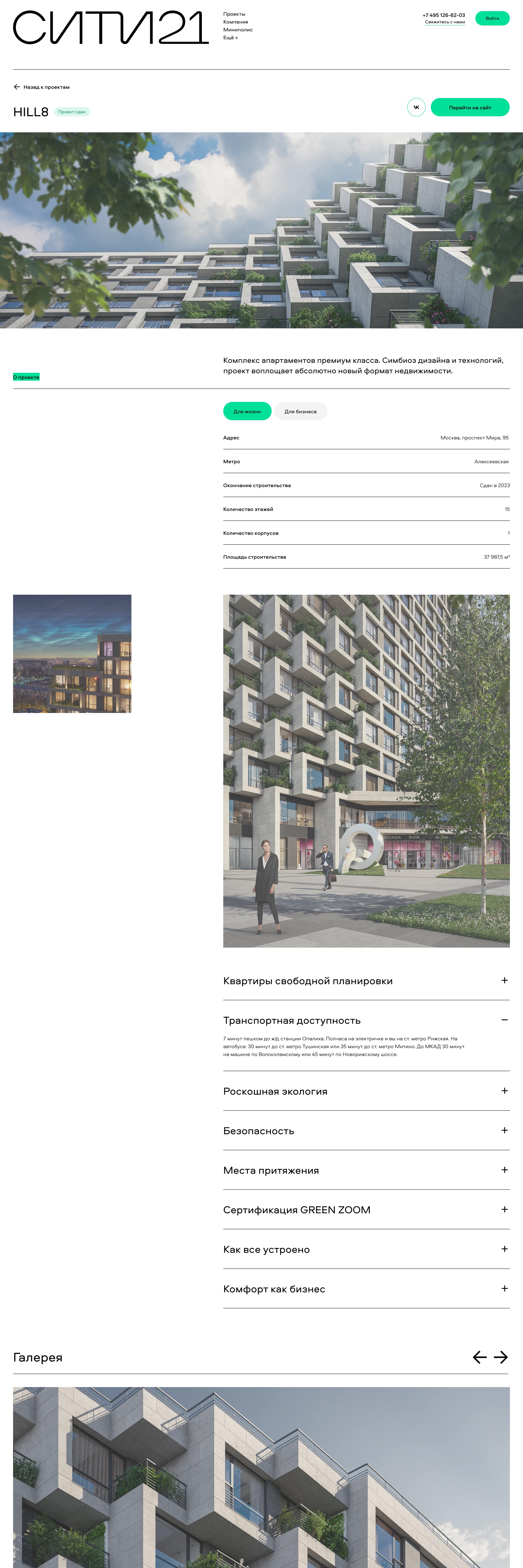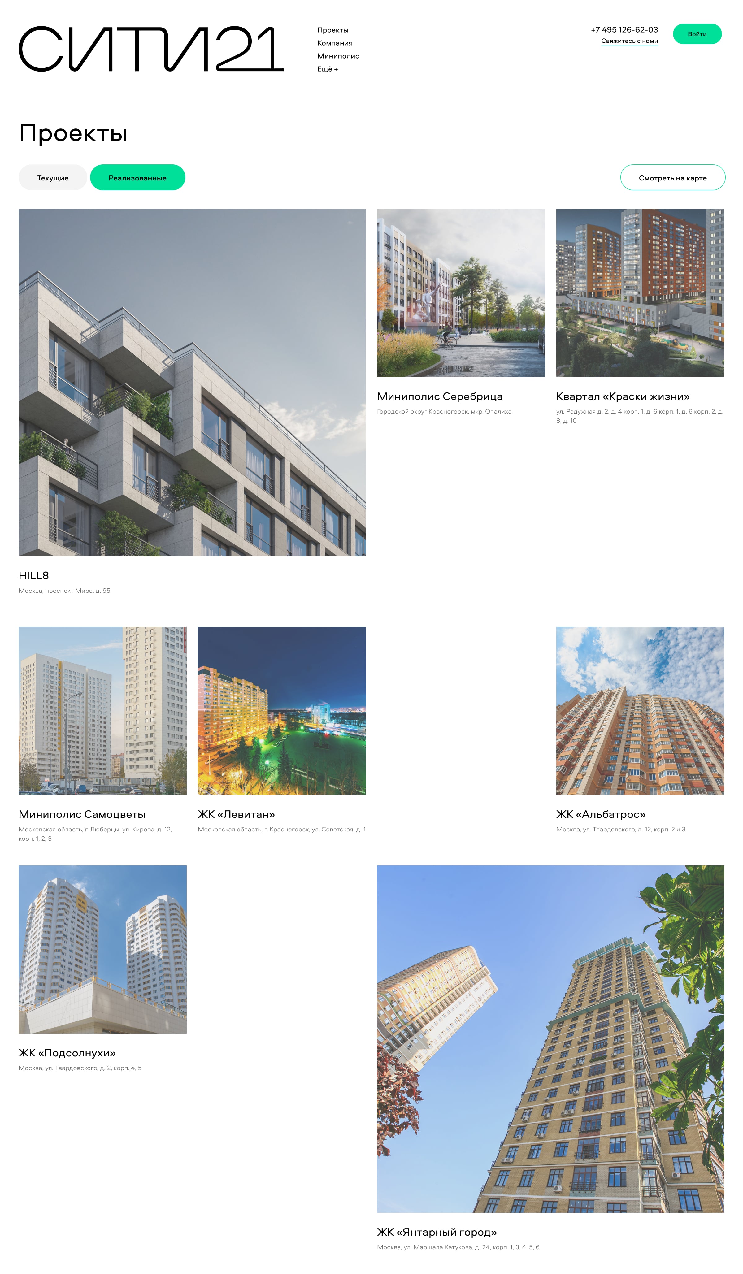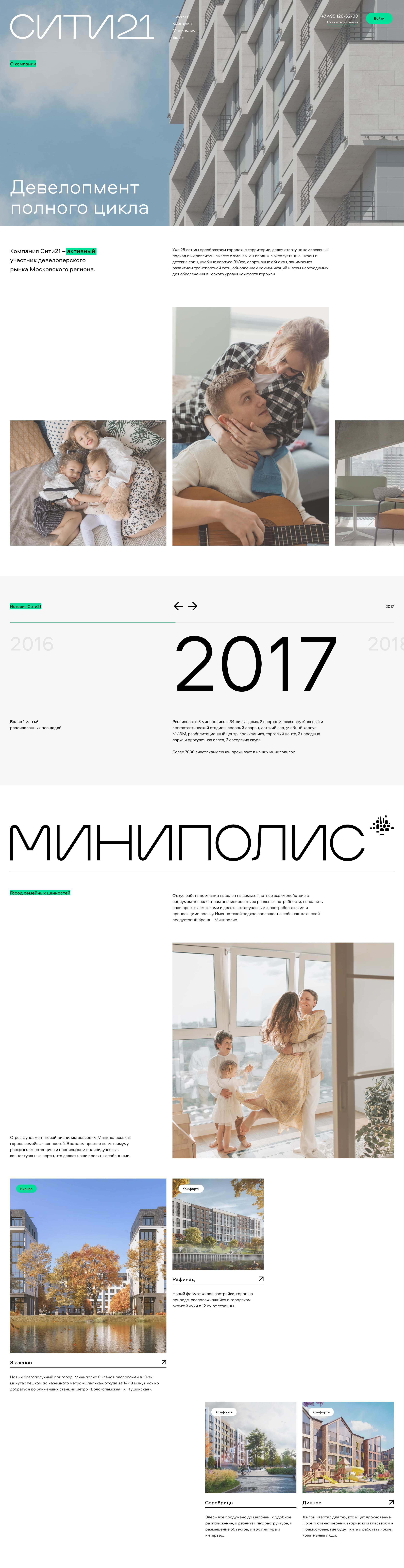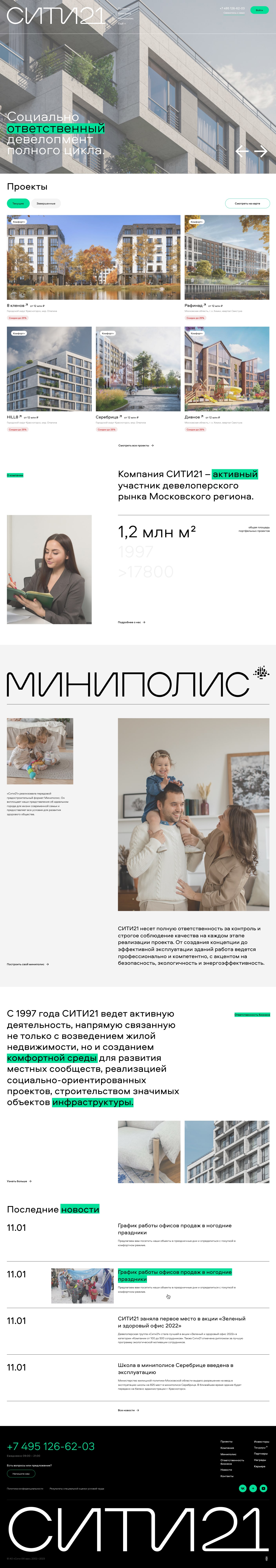 На главной странице пользователь формирует свое первое впечатление о компании. Нам было важно подчеркнуть современный и технологичный подход к работе компании СИТИ21, выделить текущие и реализованные проекты девелопера, а также рассказать о масштабе деятельности и истории компании.