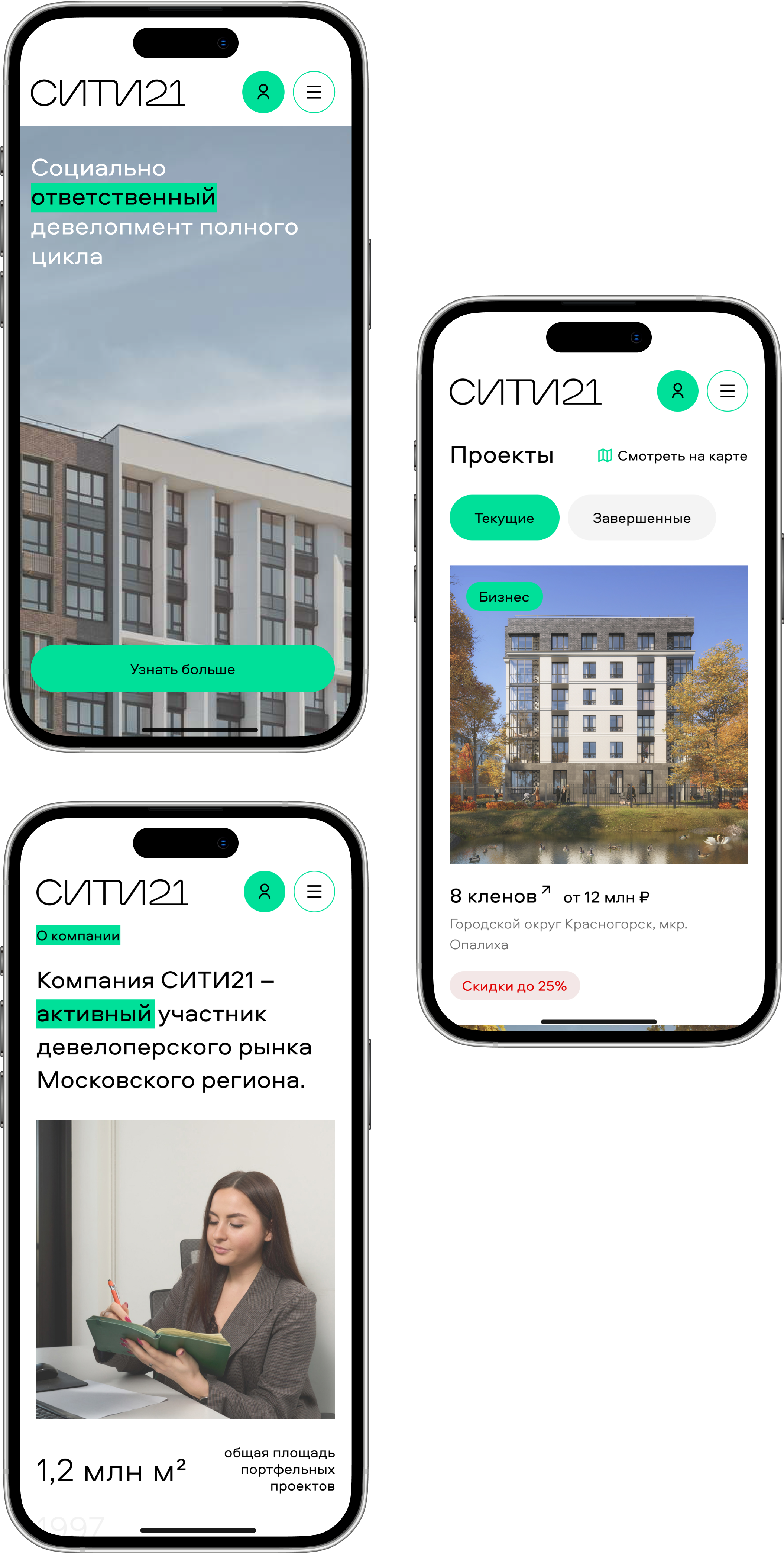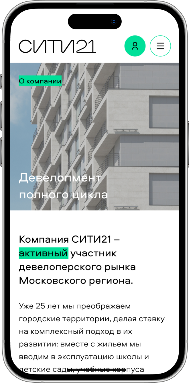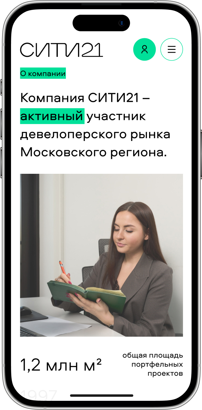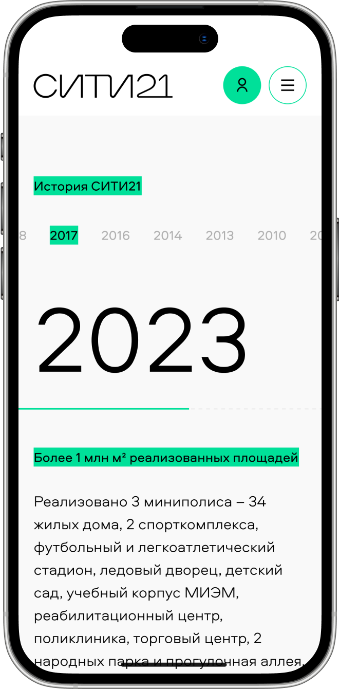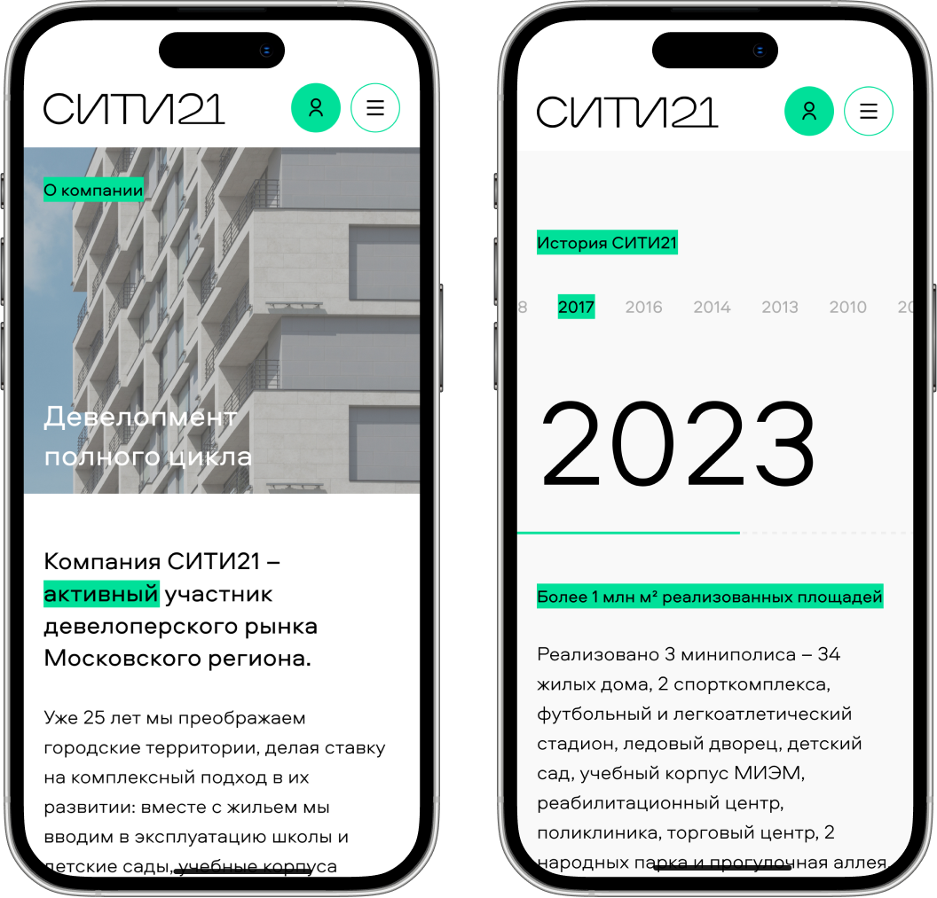На главной странице пользователь формирует свое первое впечатление о компании. Нам было важно подчеркнуть современный и технологичный подход к работе компании СИТИ21, выделить текущие и реализованные проекты девелопера, а также рассказать о масштабе деятельности и истории компании.
