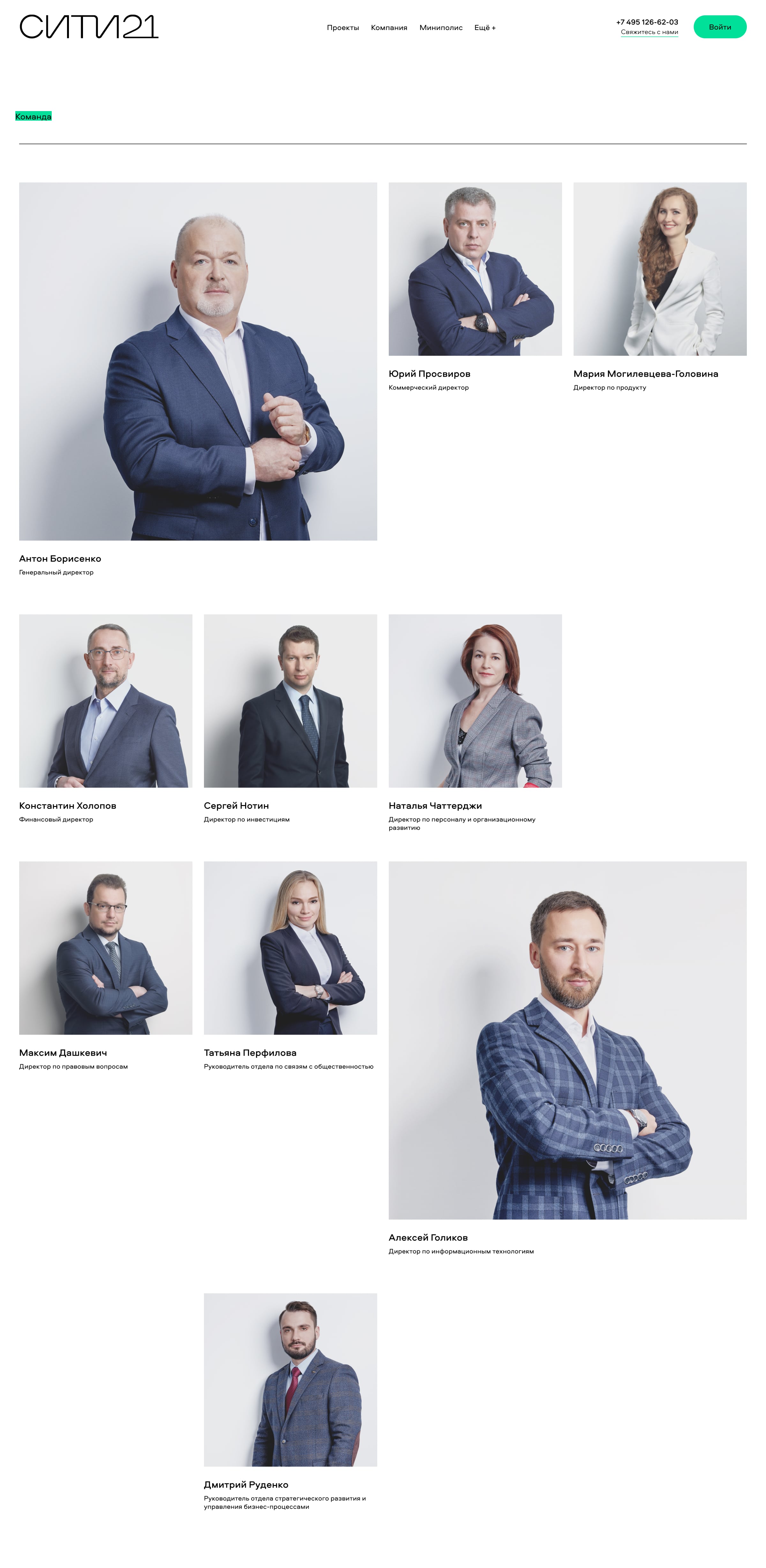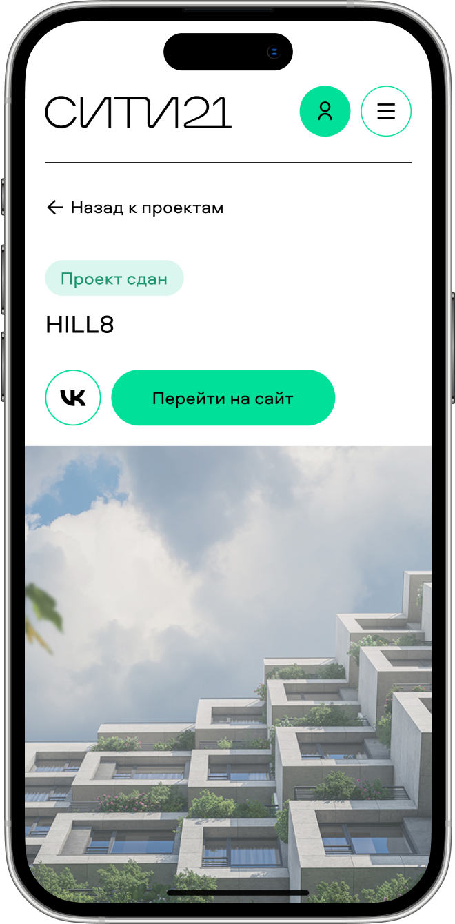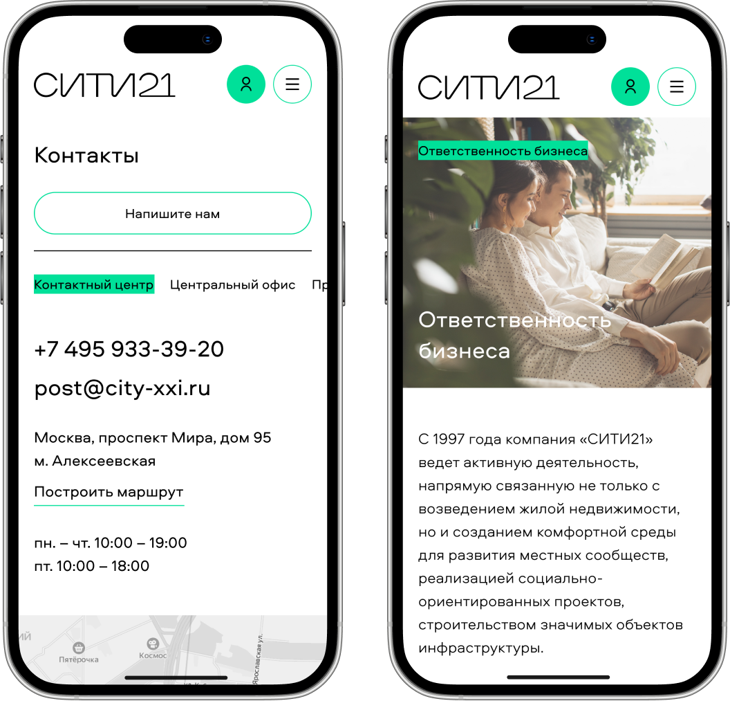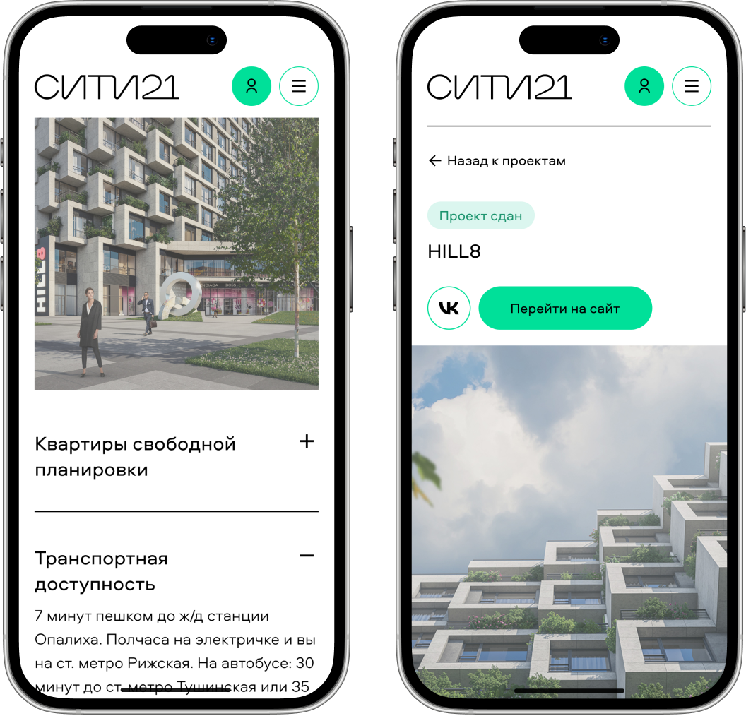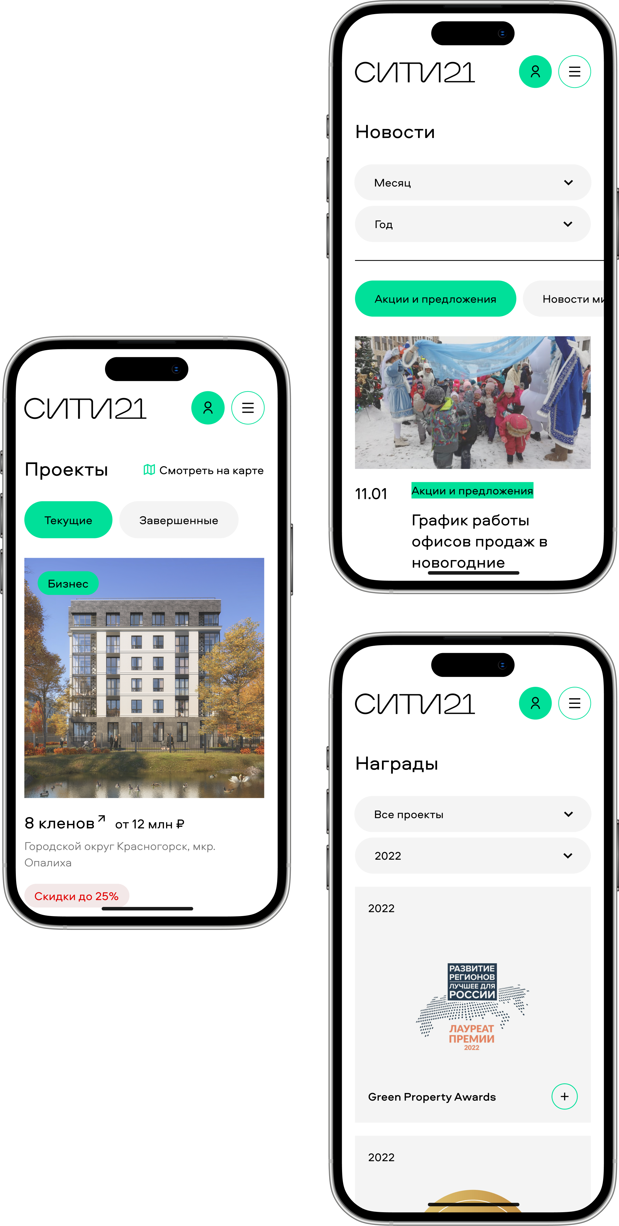 На главной странице пользователь формирует свое первое впечатление о компании. Нам было важно подчеркнуть современный и технологичный подход к работе компании СИТИ21, выделить текущие и реализованные проекты девелопера, а также рассказать о масштабе деятельности и истории компании.