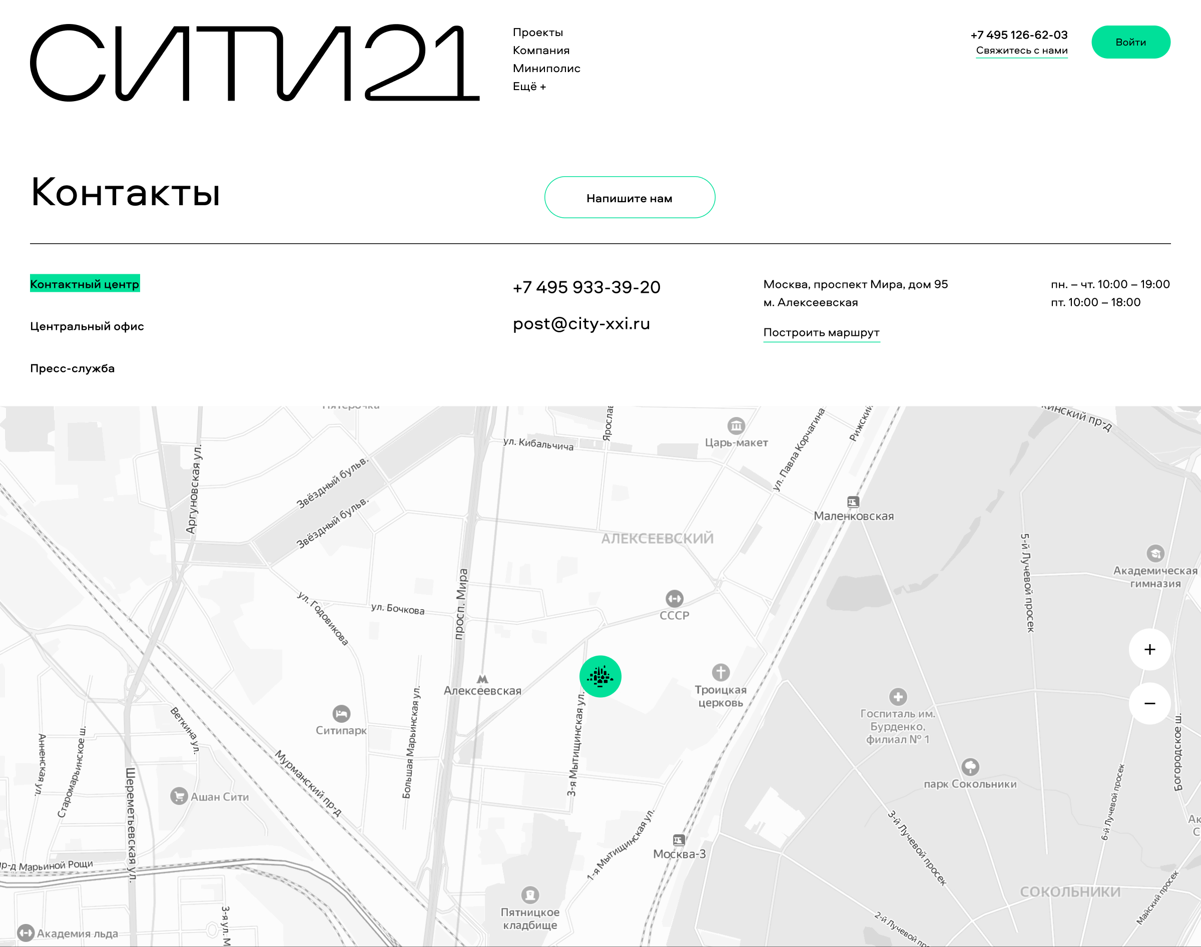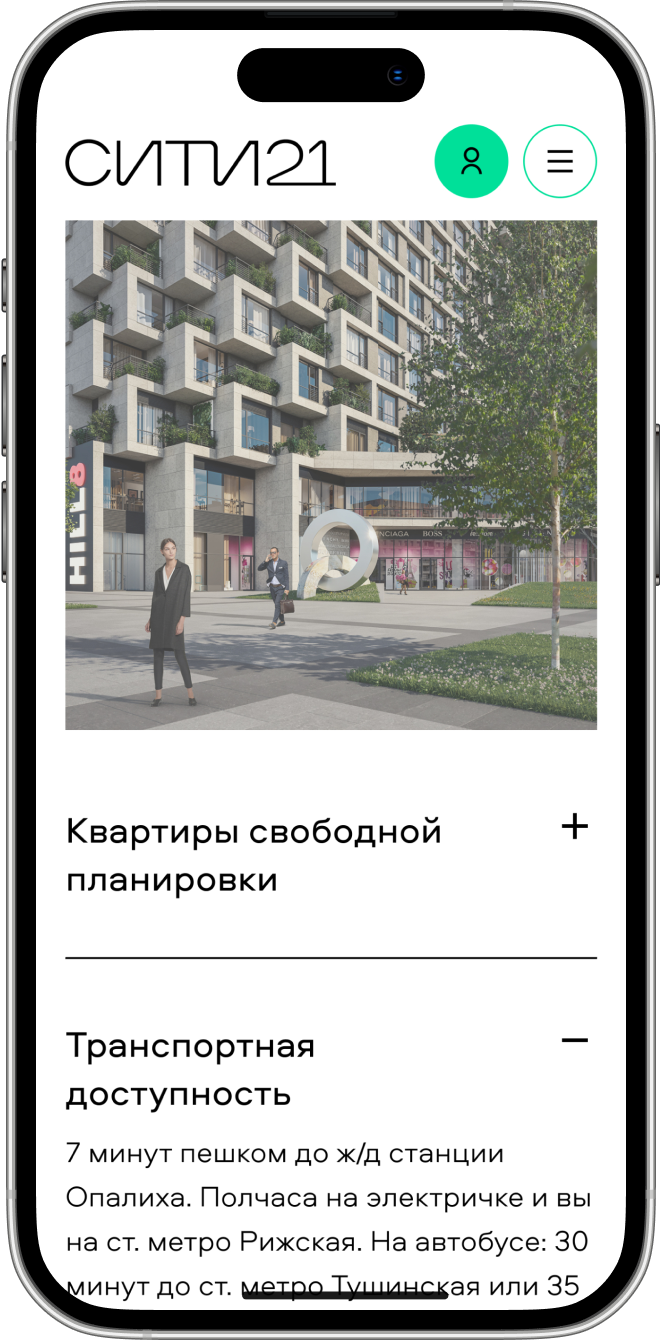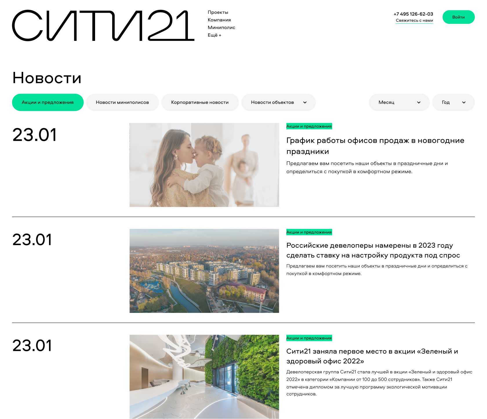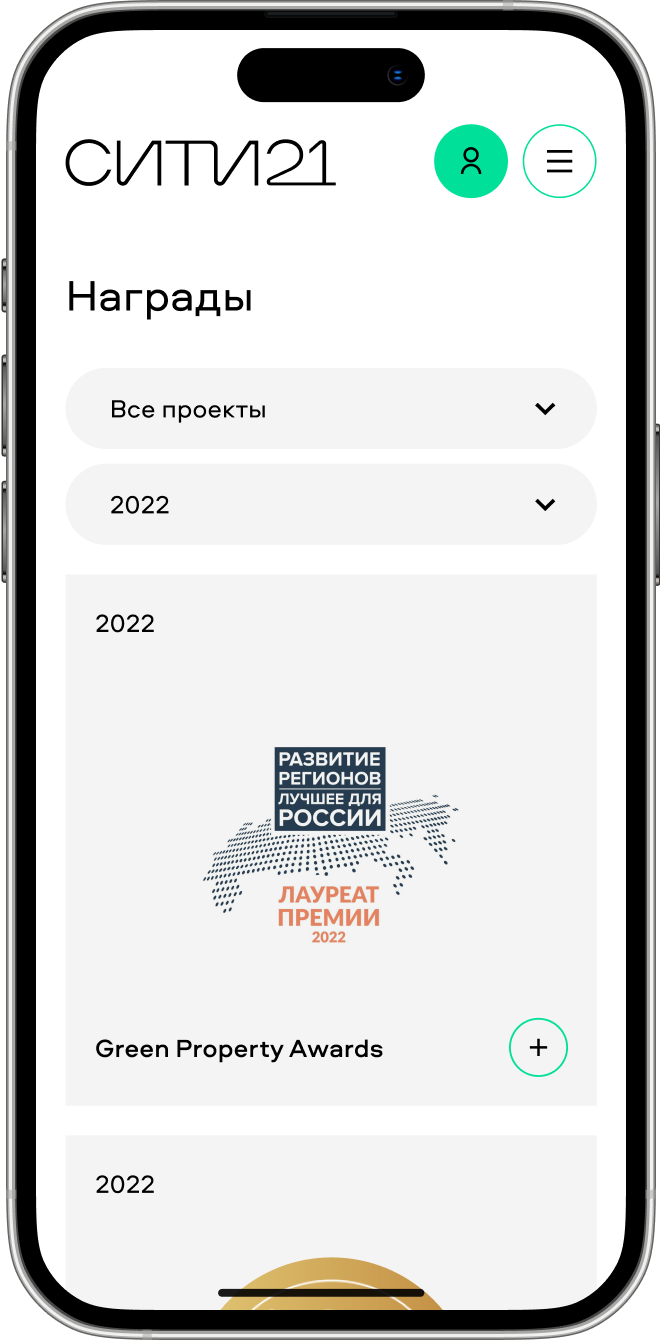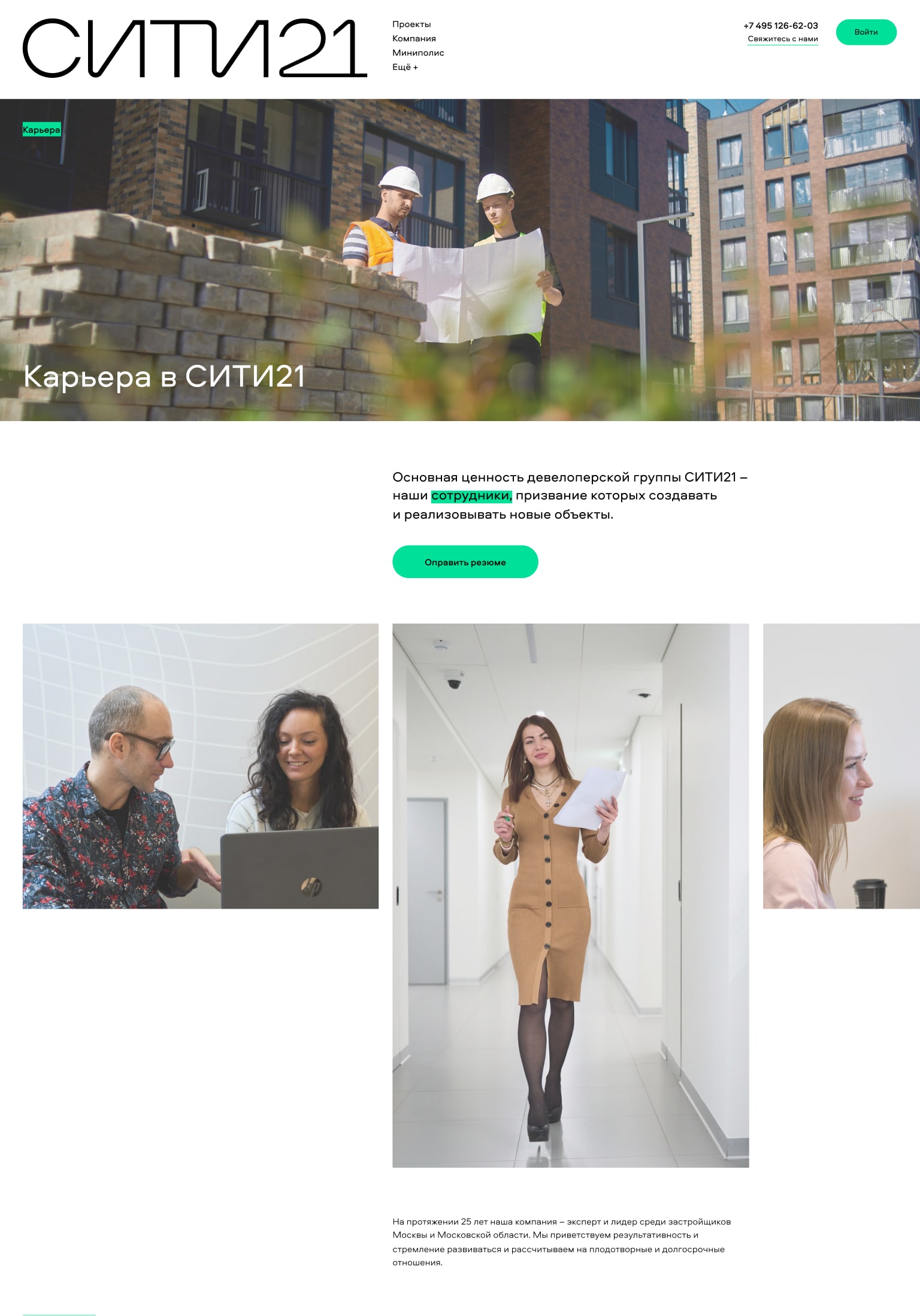 На главной странице пользователь формирует свое первое впечатление о компании. Нам было важно подчеркнуть современный и технологичный подход к работе компании СИТИ21, выделить текущие и реализованные проекты девелопера, а также рассказать о масштабе деятельности и истории компании.