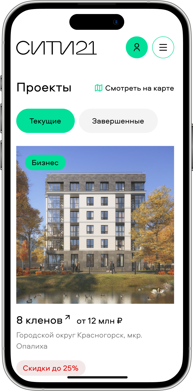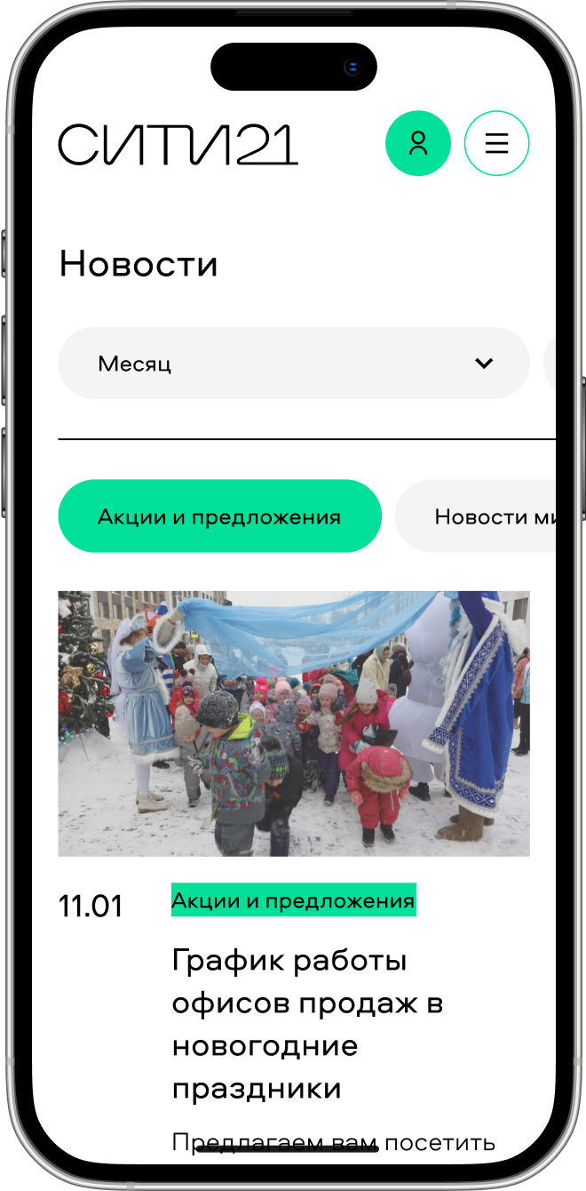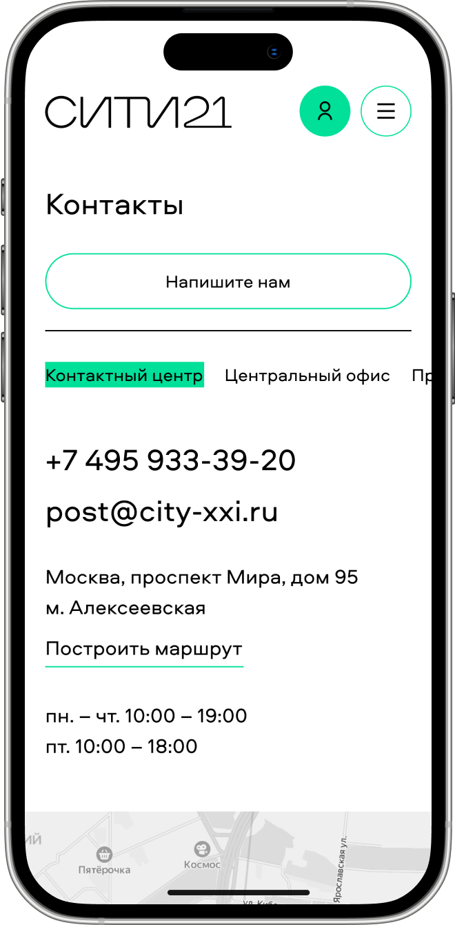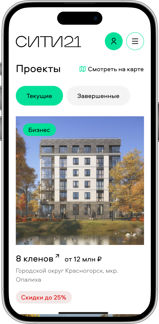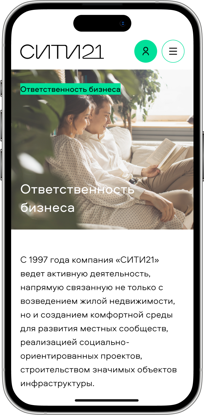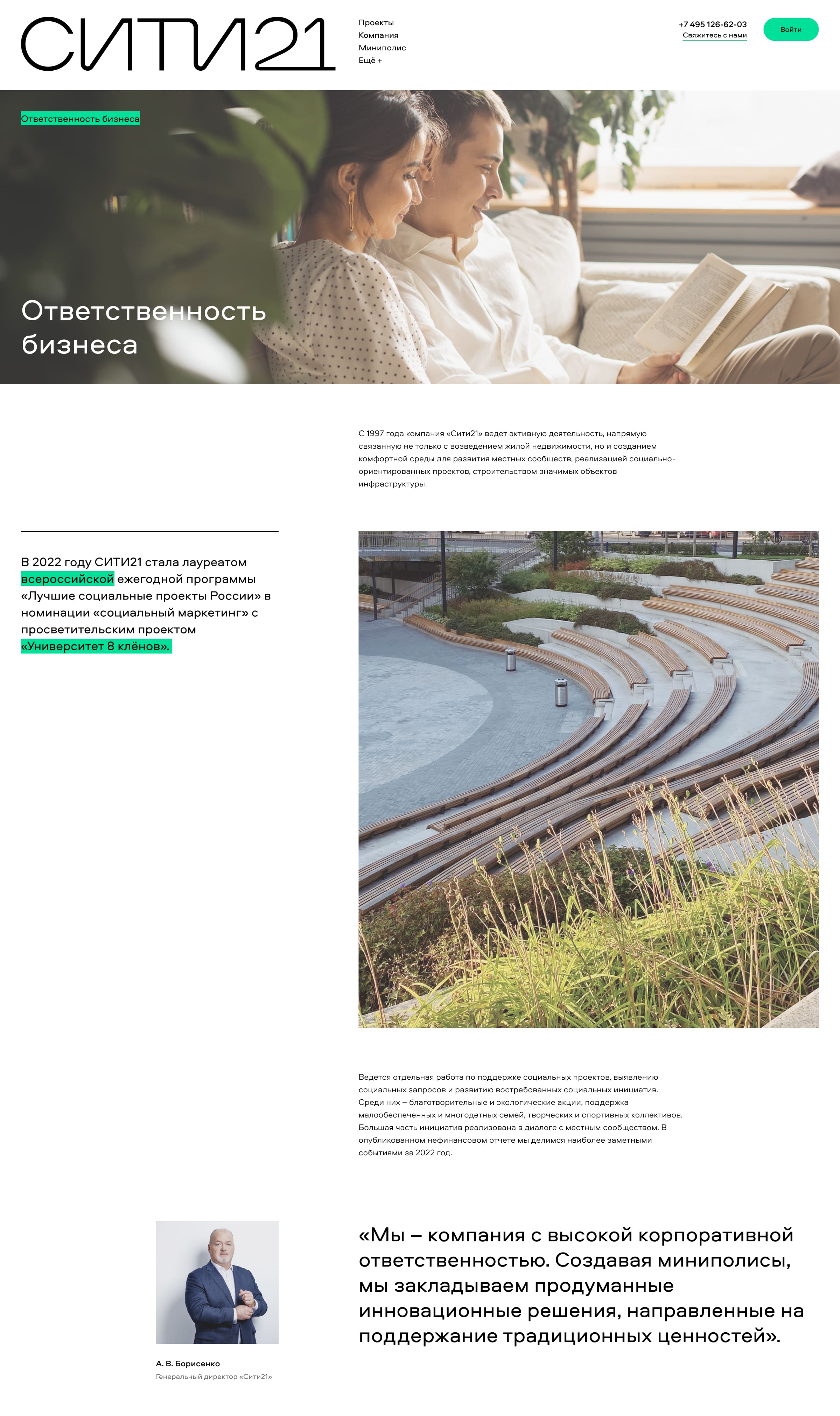 На главной странице пользователь формирует свое первое впечатление о компании. Нам было важно подчеркнуть современный и технологичный подход к работе компании СИТИ21, выделить текущие и реализованные проекты девелопера, а также рассказать о масштабе деятельности и истории компании.