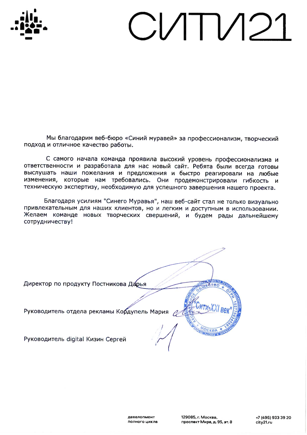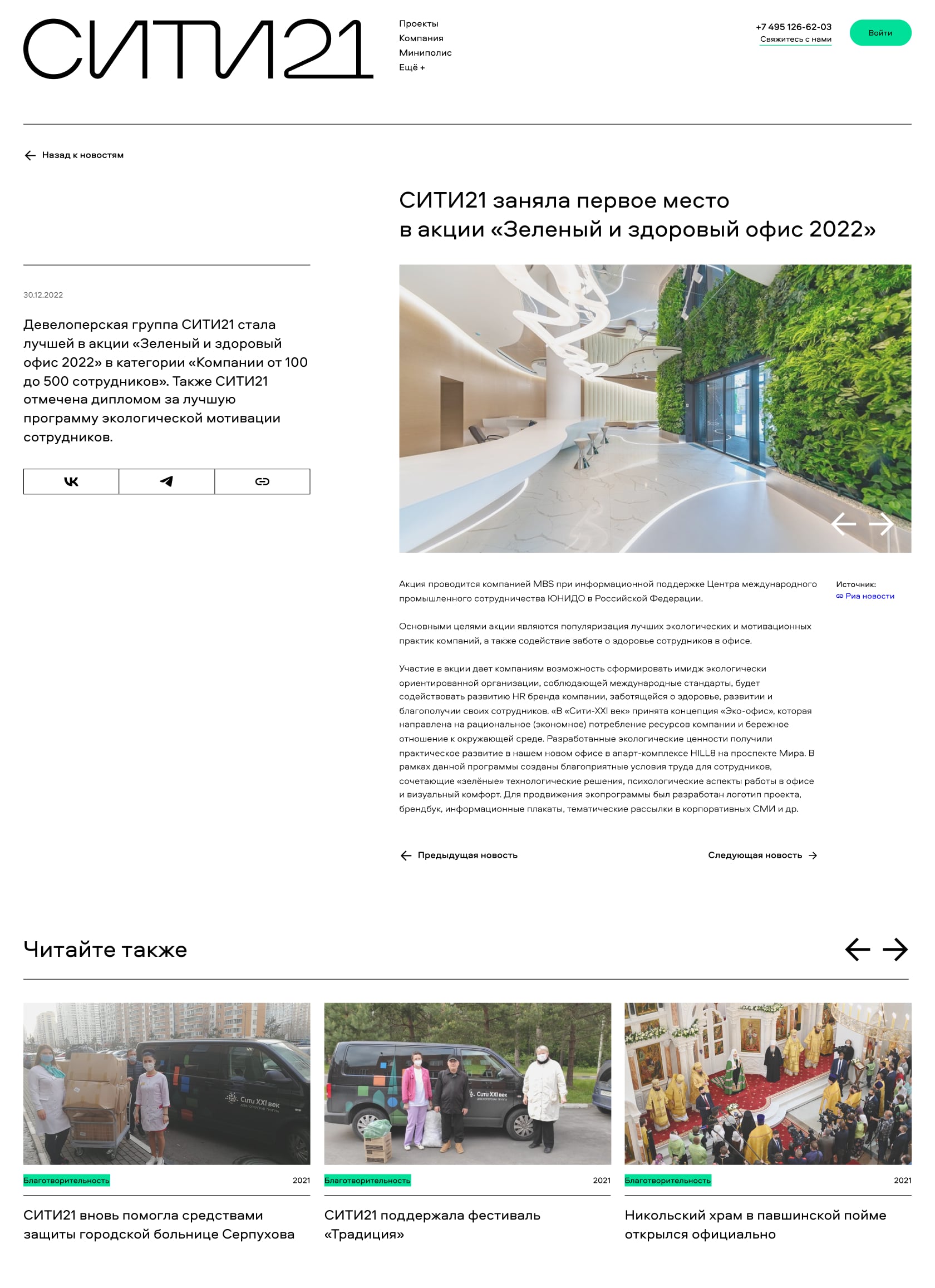 Перед нами стояла задача редизайна текущего веб-сайта компании СИТИ21 с учетом ее обновленного фирменного стиля. Сайт компании не отвечал современным требованиям UI/UX дизайна, не давал полного представления о деятельности компании и не выделял ее существенным образом в конкурентной среде. В результате работ был подготовлен новый корпоративный сайт: лаконичный, информативный и отражающий характер СИТИ21. На протяжении всего проекта использовалась динамичная модульная сетка, которая позволила нам грамотно расставить акценты, не упуская важных деталей.