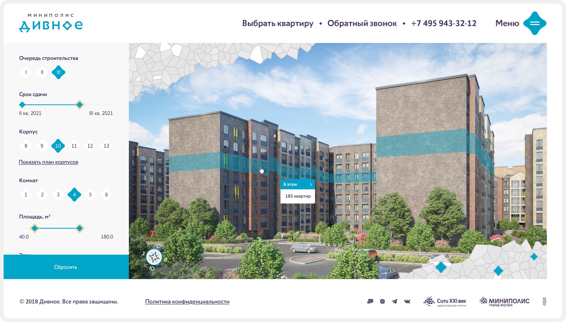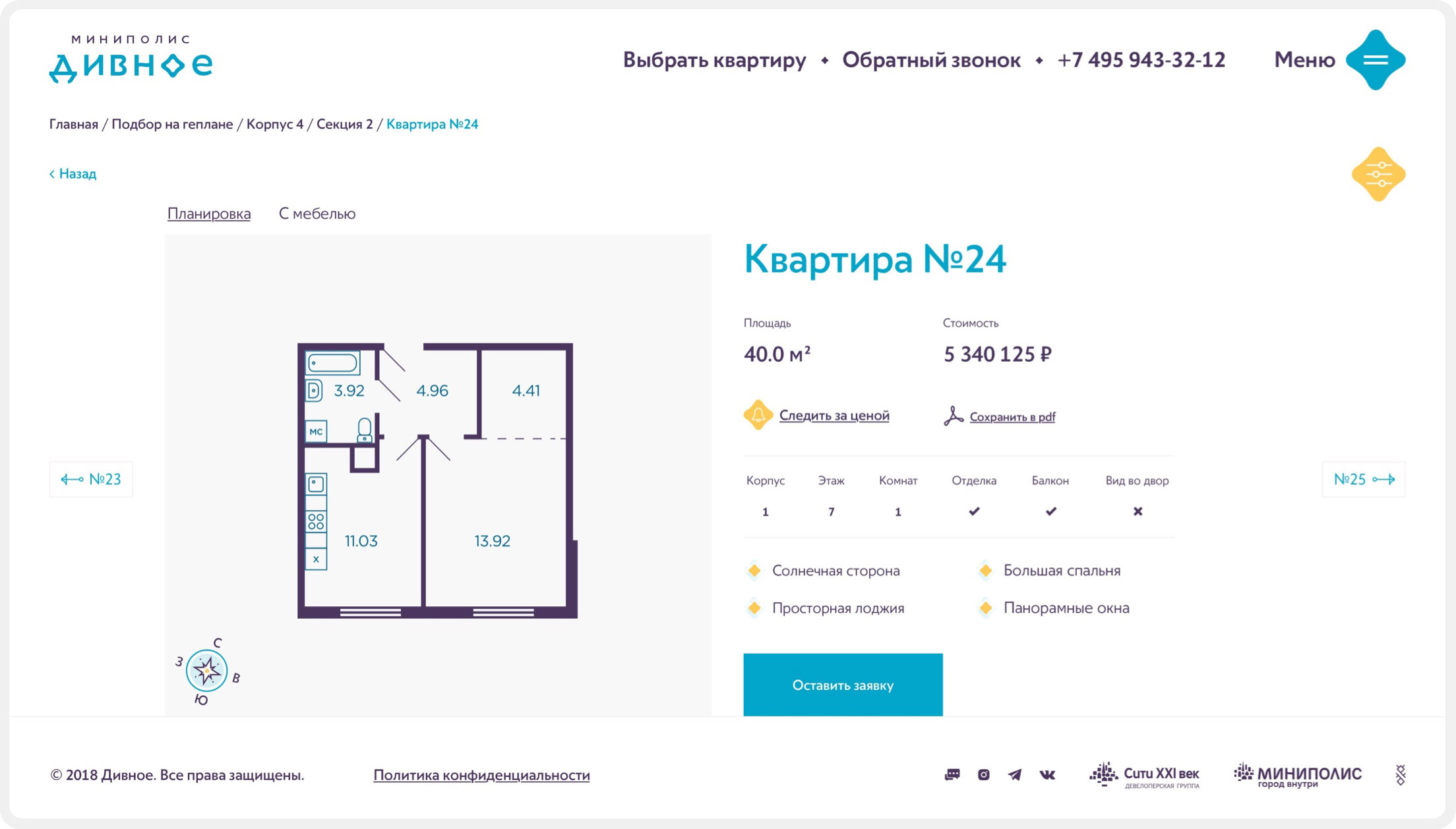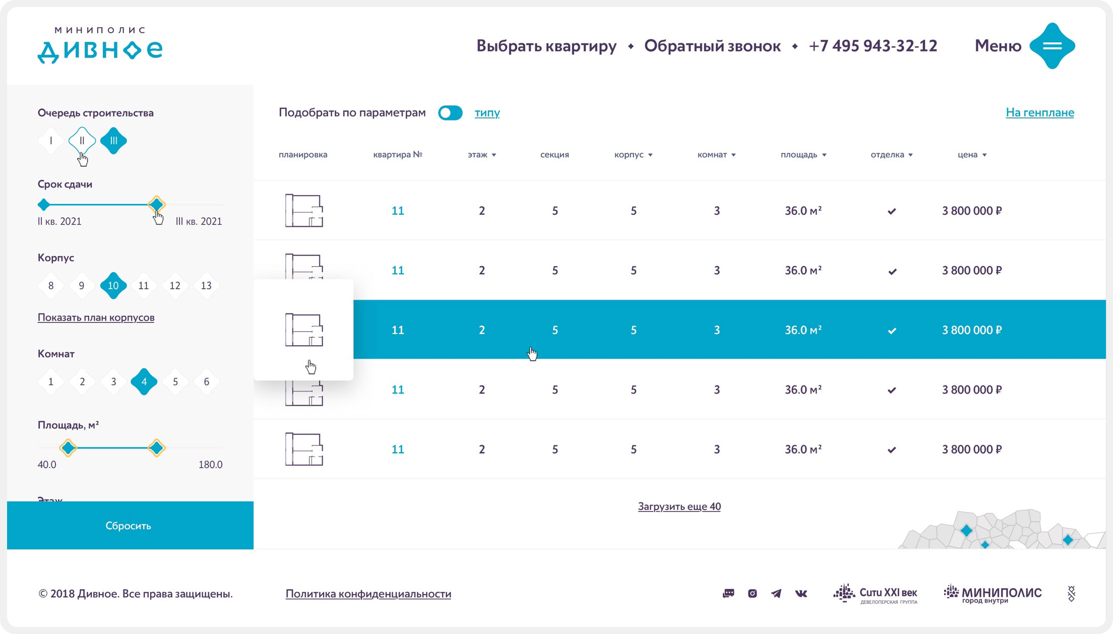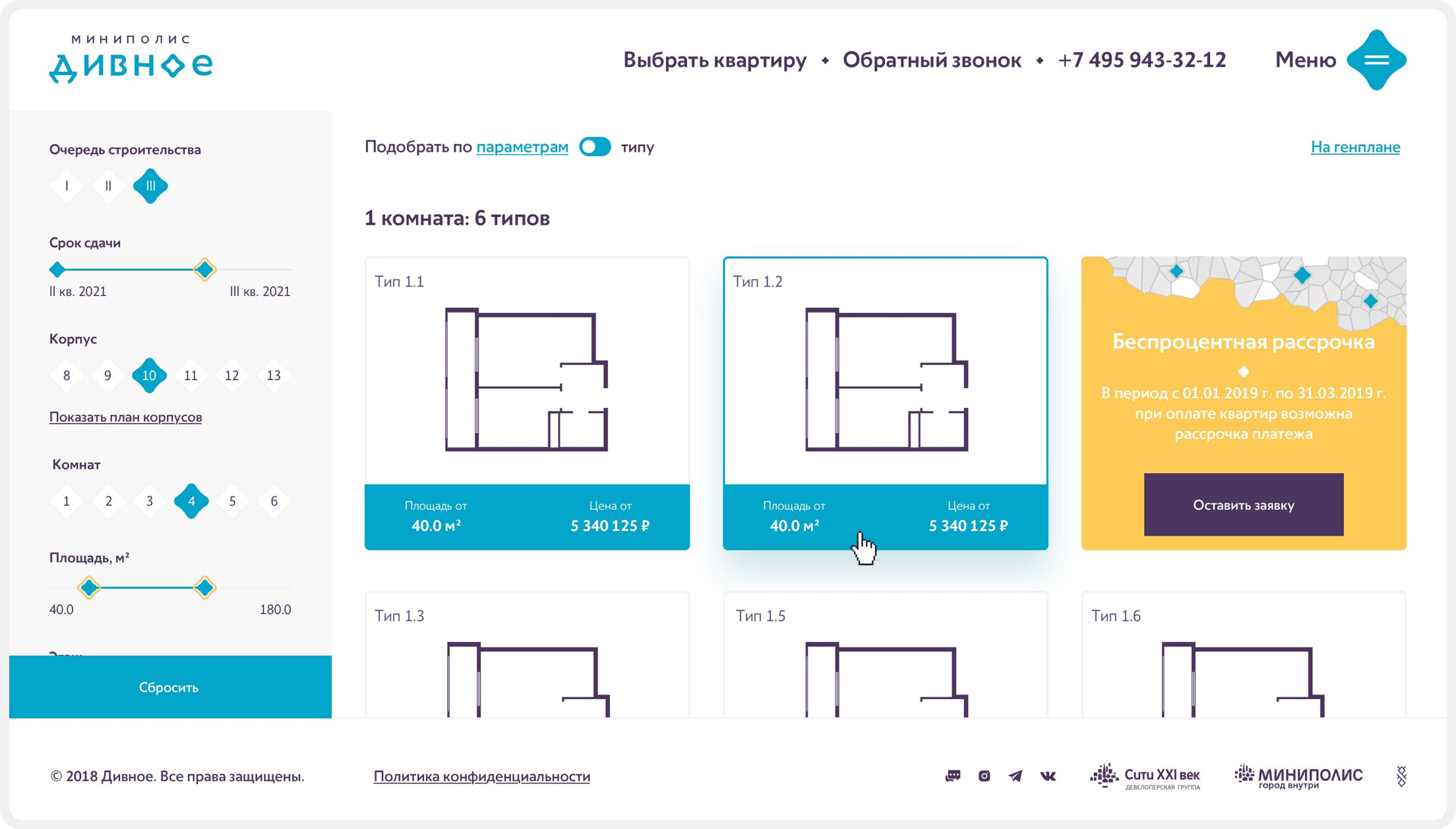 Выбор квартиры на сайте осуществаляется в два клика. Мы постарались, чтобы пользователь как можно быстрее достигал цели, уменьшив количество шагов до карточки квартиры.