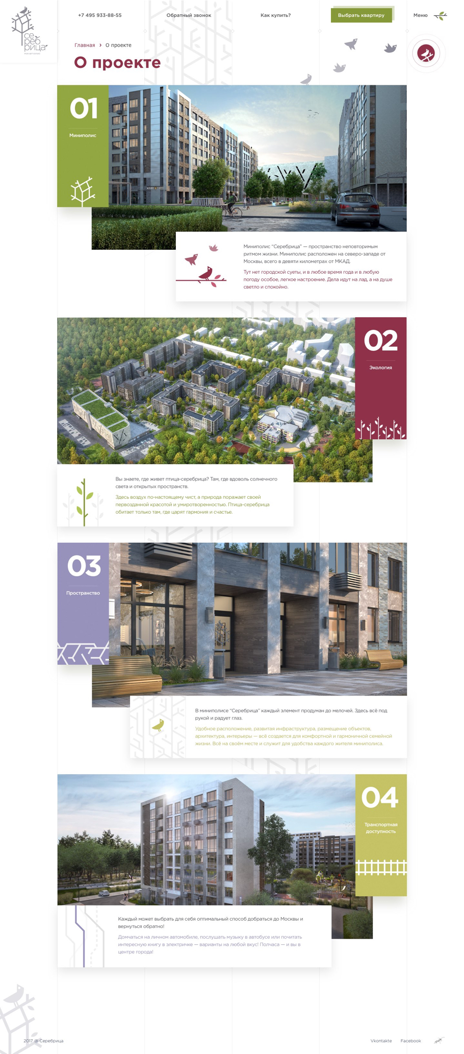 Серебрица — это маленькая звонкая птица, которая селится только в экологически чистых местах. Создатели комплекса, придумавшие серебрицу как символ своего нового объекта в ближнем Подмосковье, опасались, что практичность сайта помешает передать обаяние этой легенды.