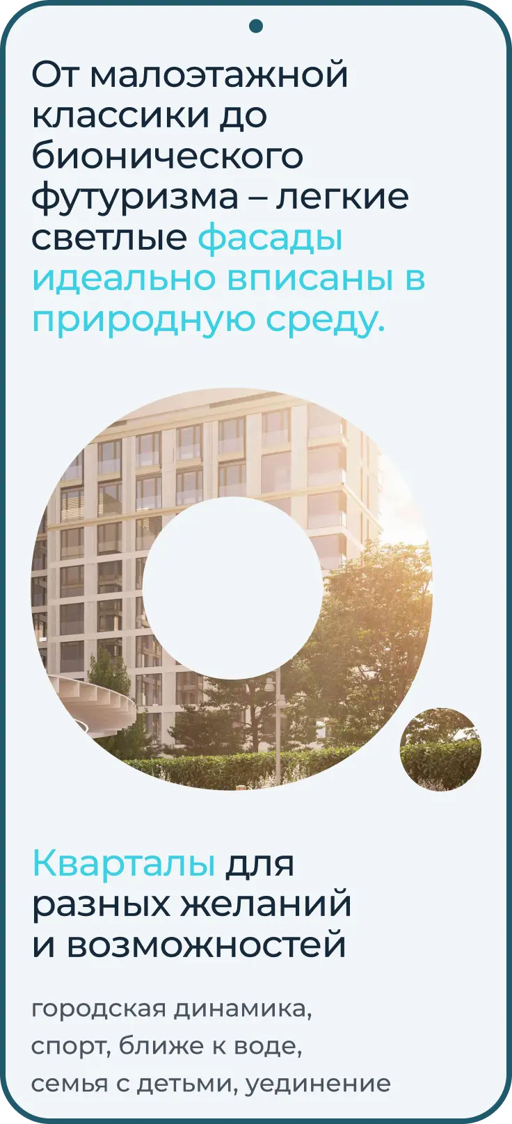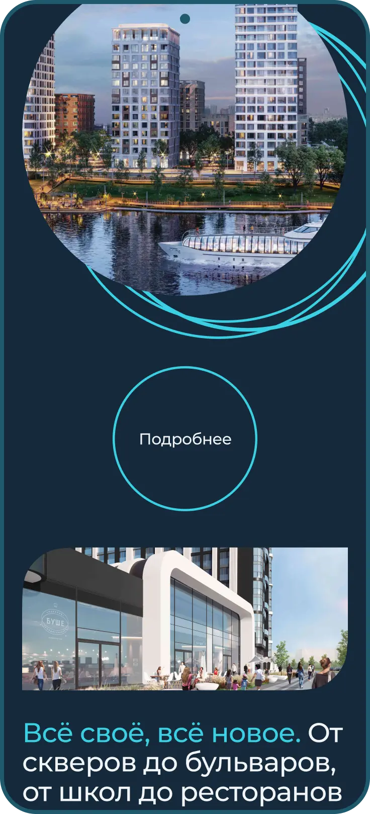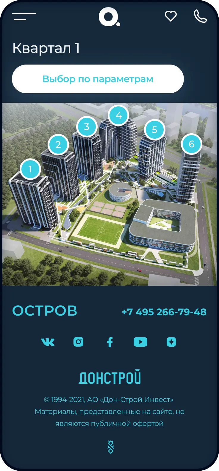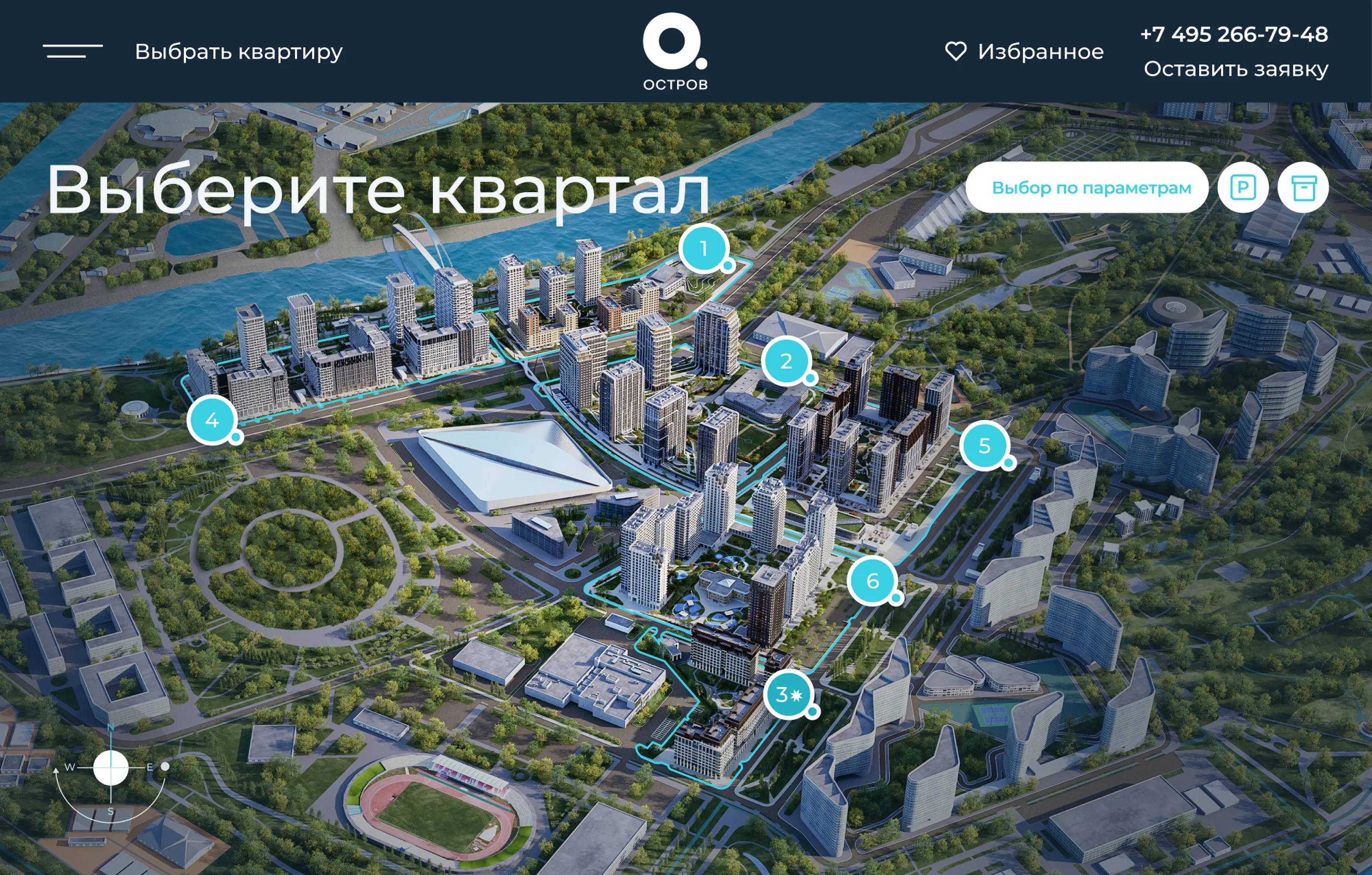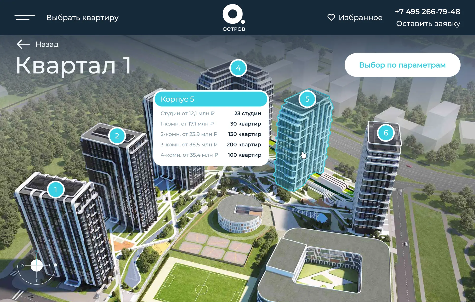 Квартиру своей мечты на сайте можно найти двумя способами. Через визуальный выборщик наглядно видно, как будет выглядеть дом и в каком окружении он находится. Через подбор по параметрам выдаётся крупный массив нужных квартир в удобных форматах – списком или плиткой.