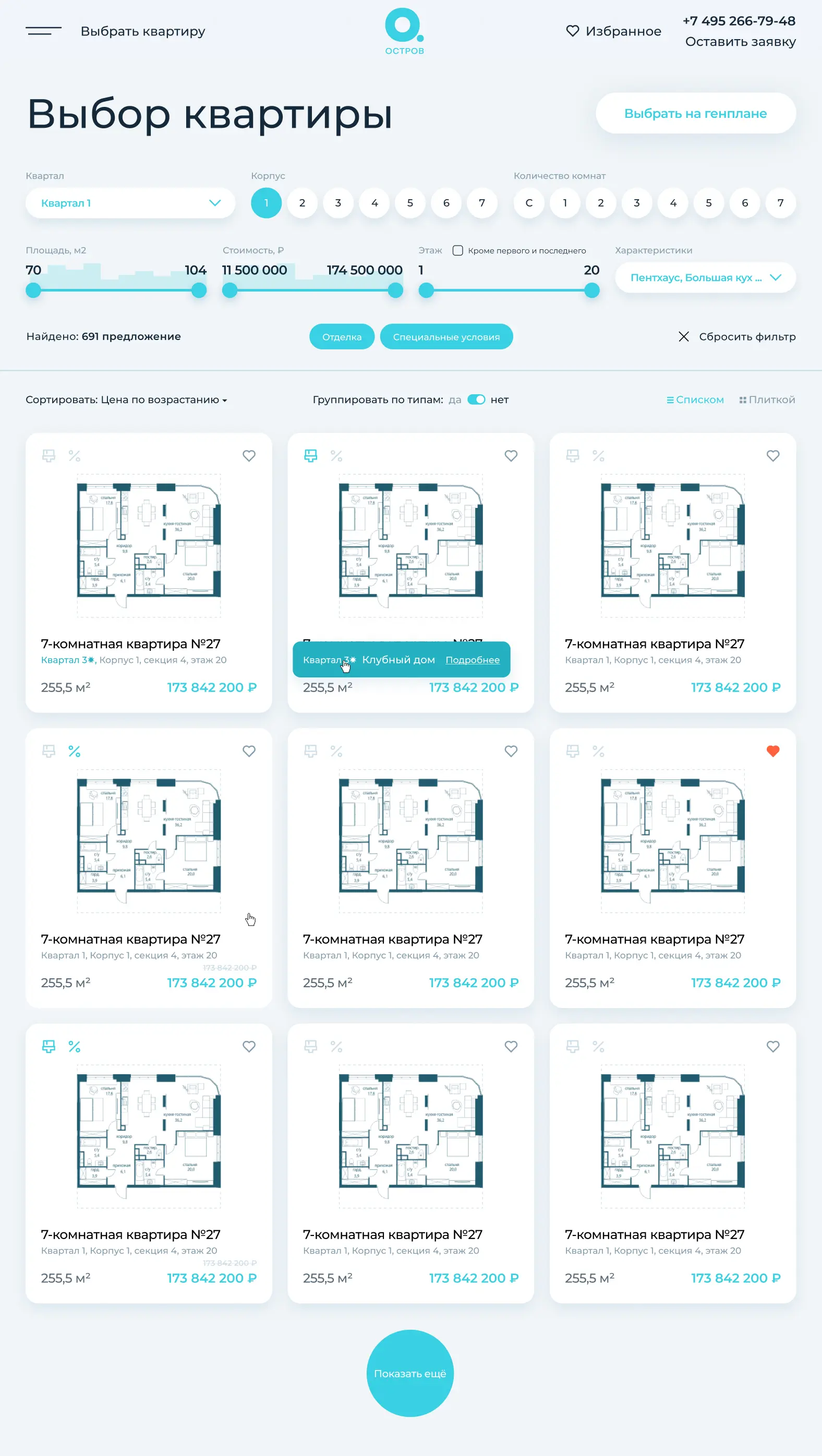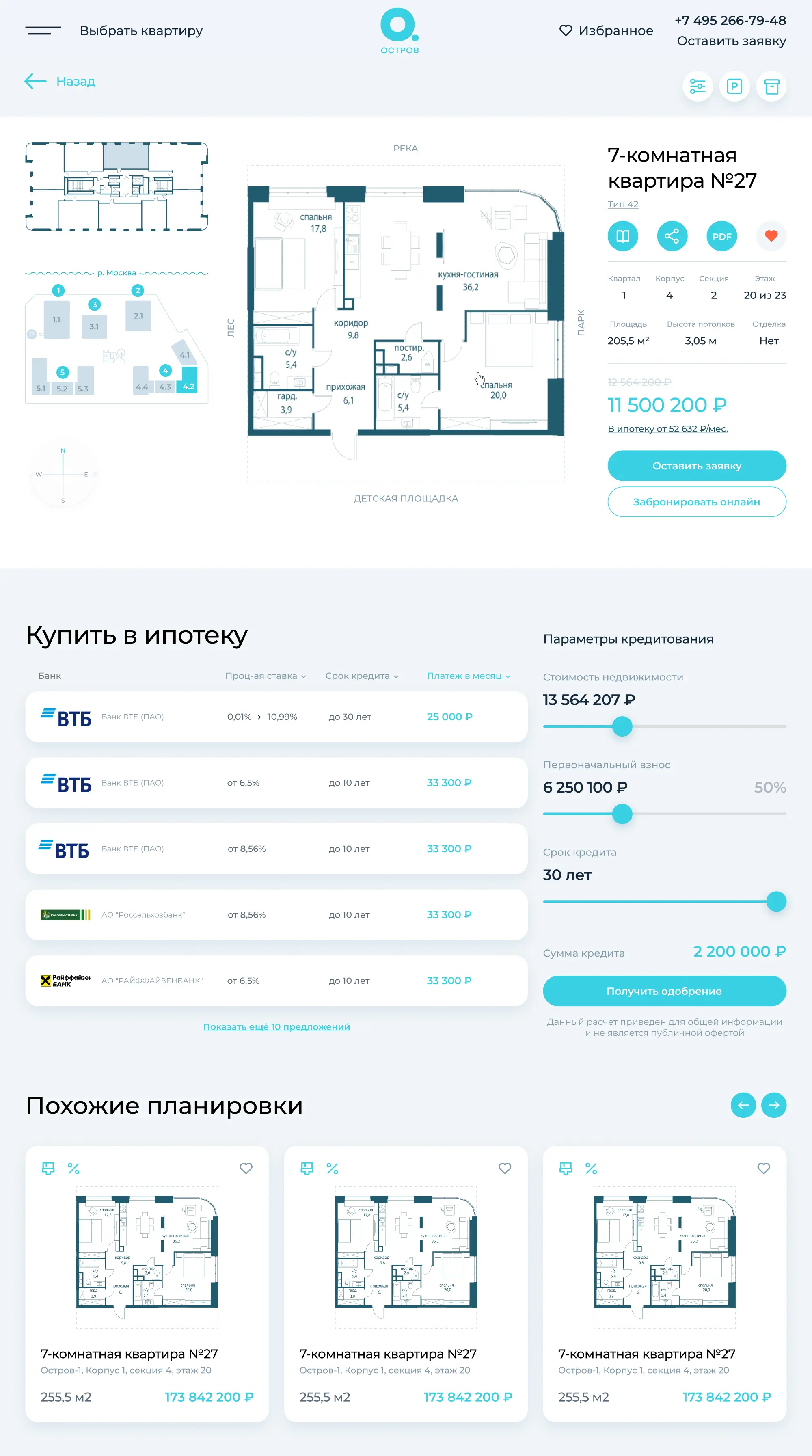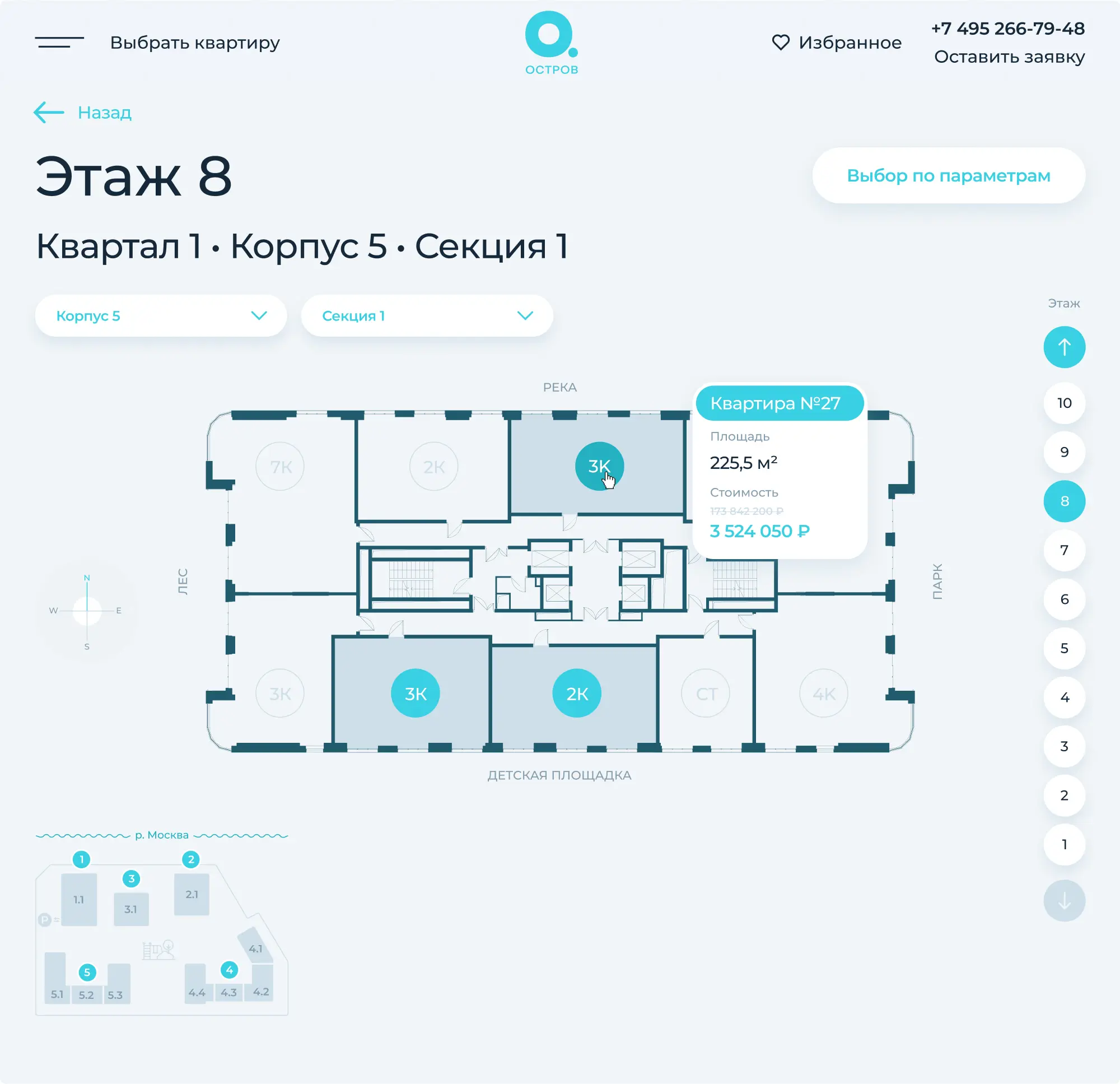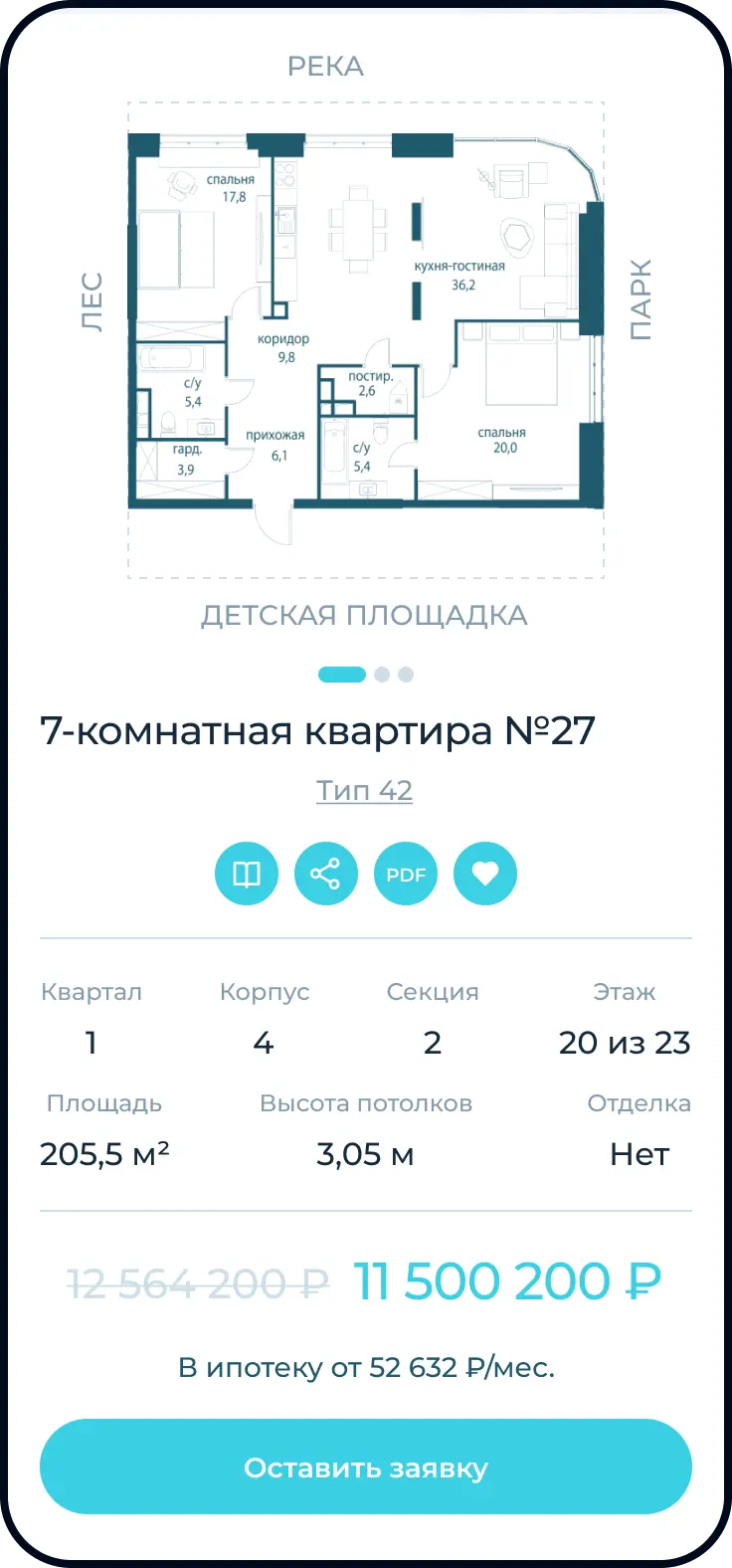На каждую квартиру выдаётся своя карточка с планировкой, основными характеристиками, расположением на этаже и в рамках квартала. Здесь пользователь может выгрузить генери- руемый PDF-файл по квартире, оставить заявку или ознакомиться с ипотечными программами для приобретения квартиры.