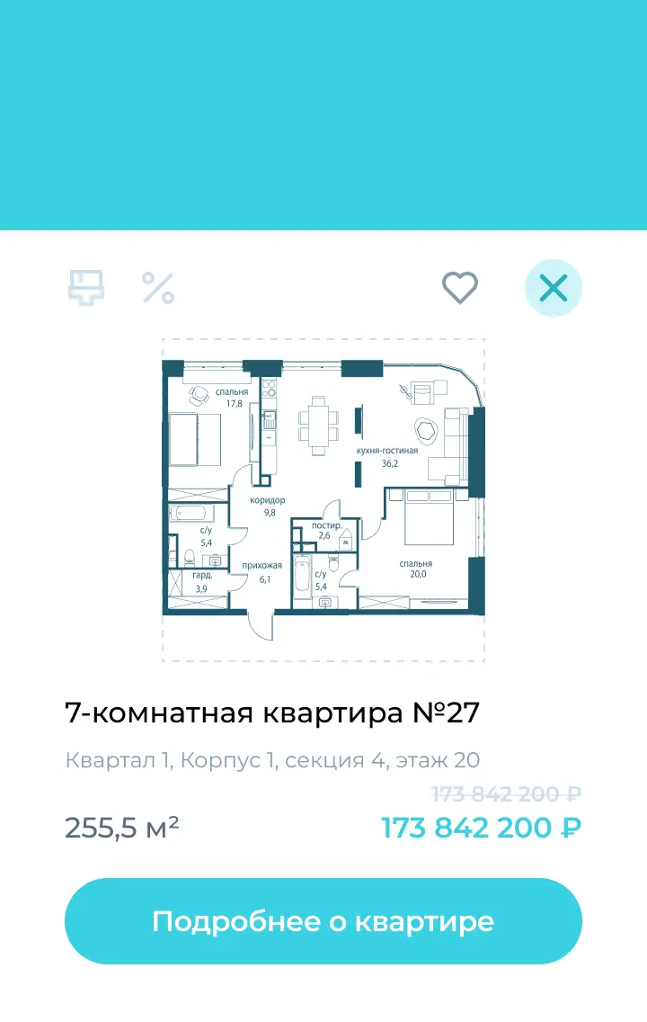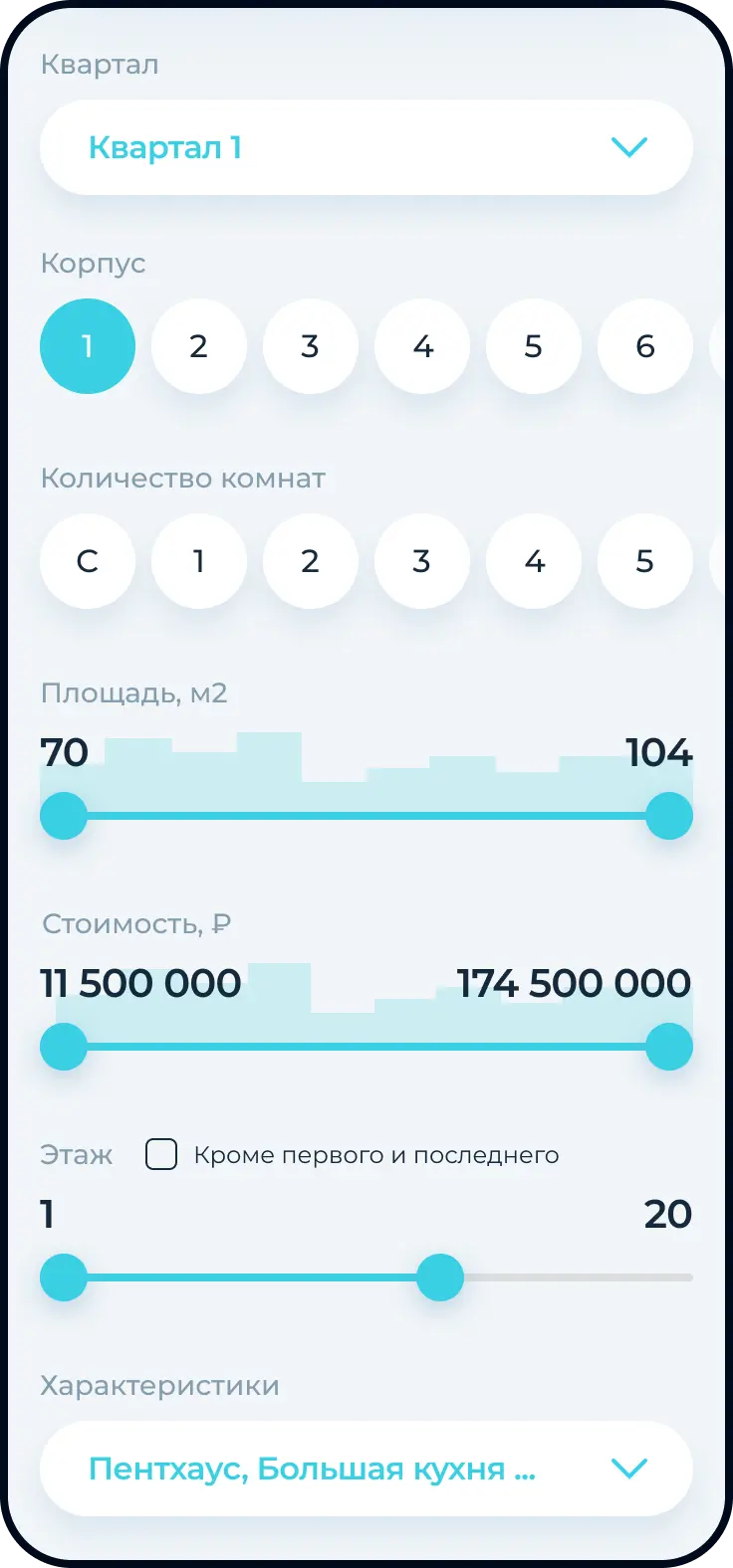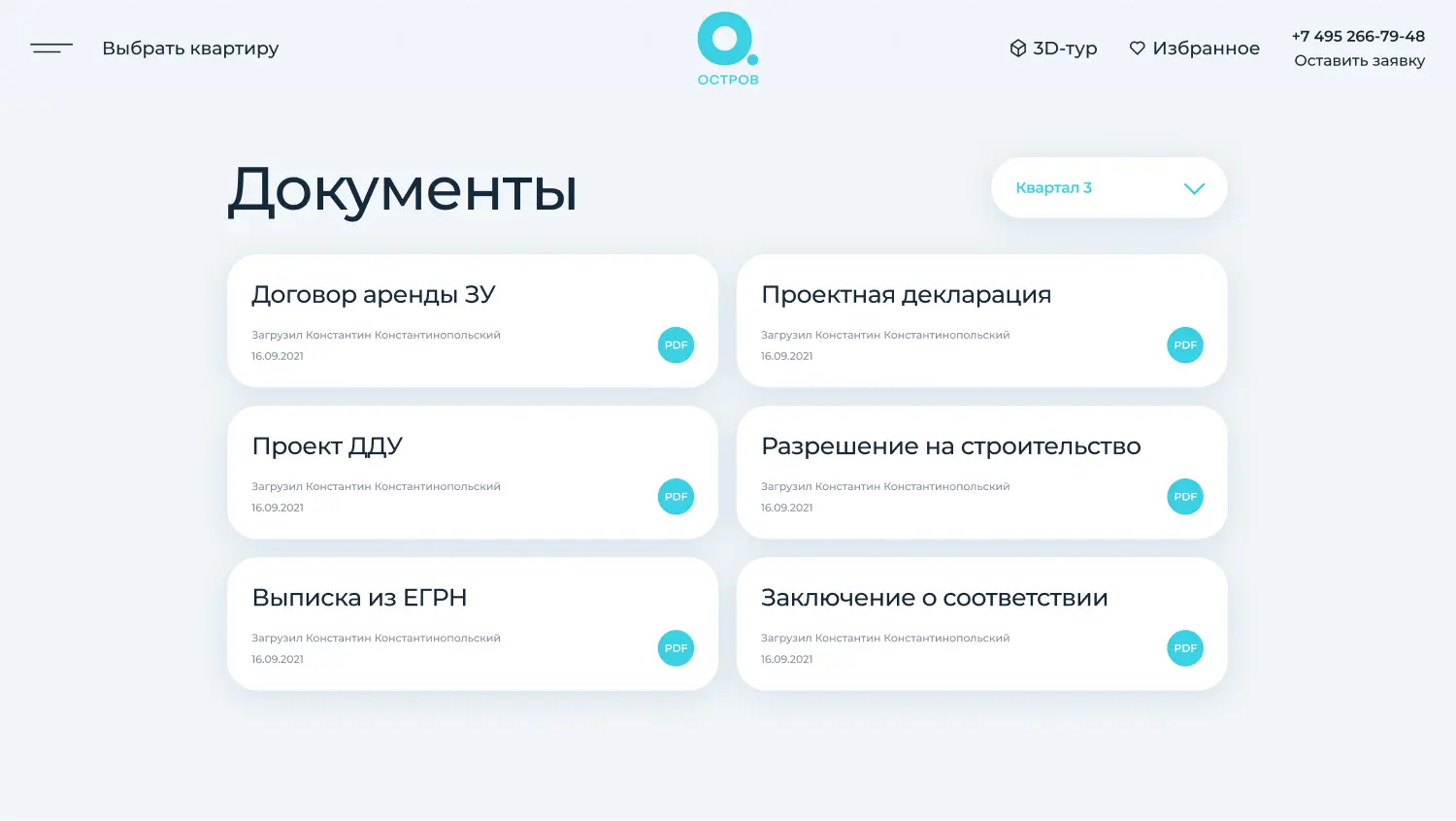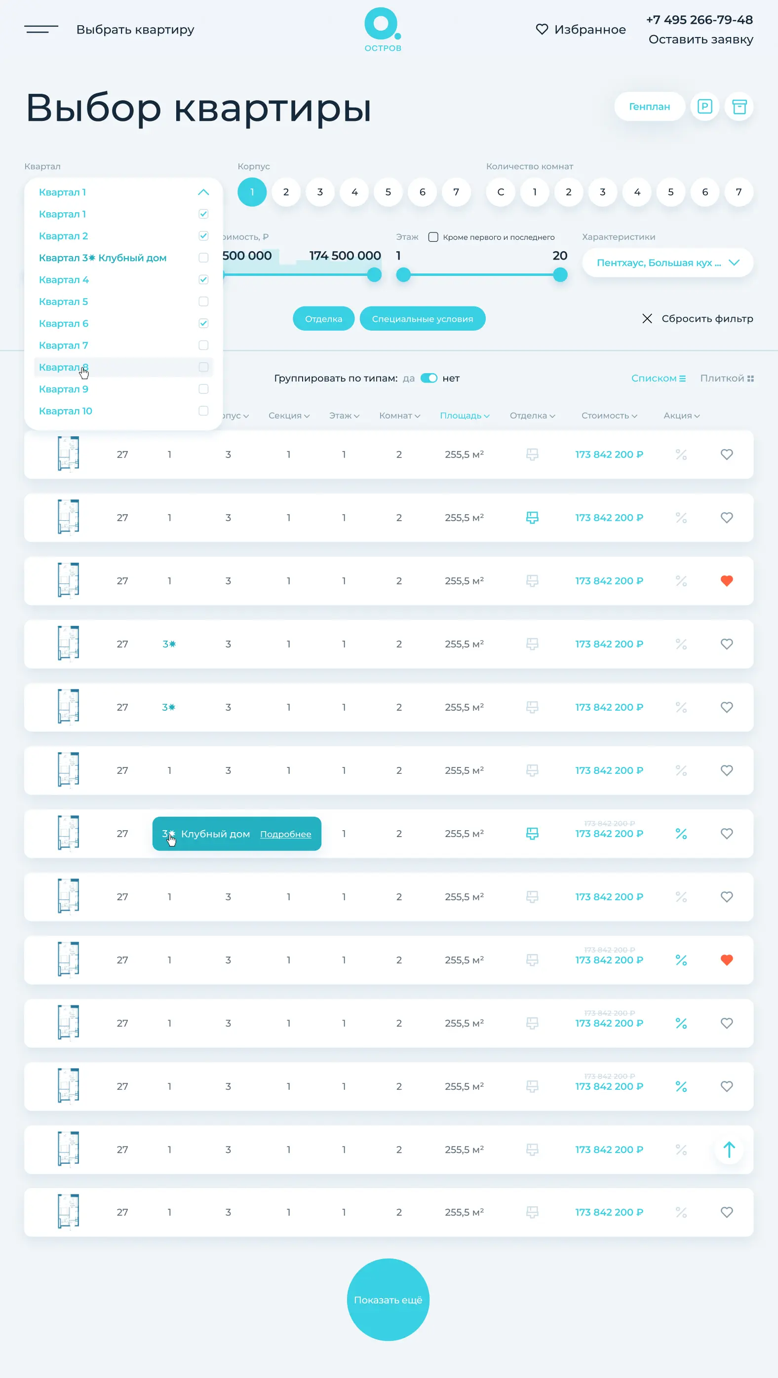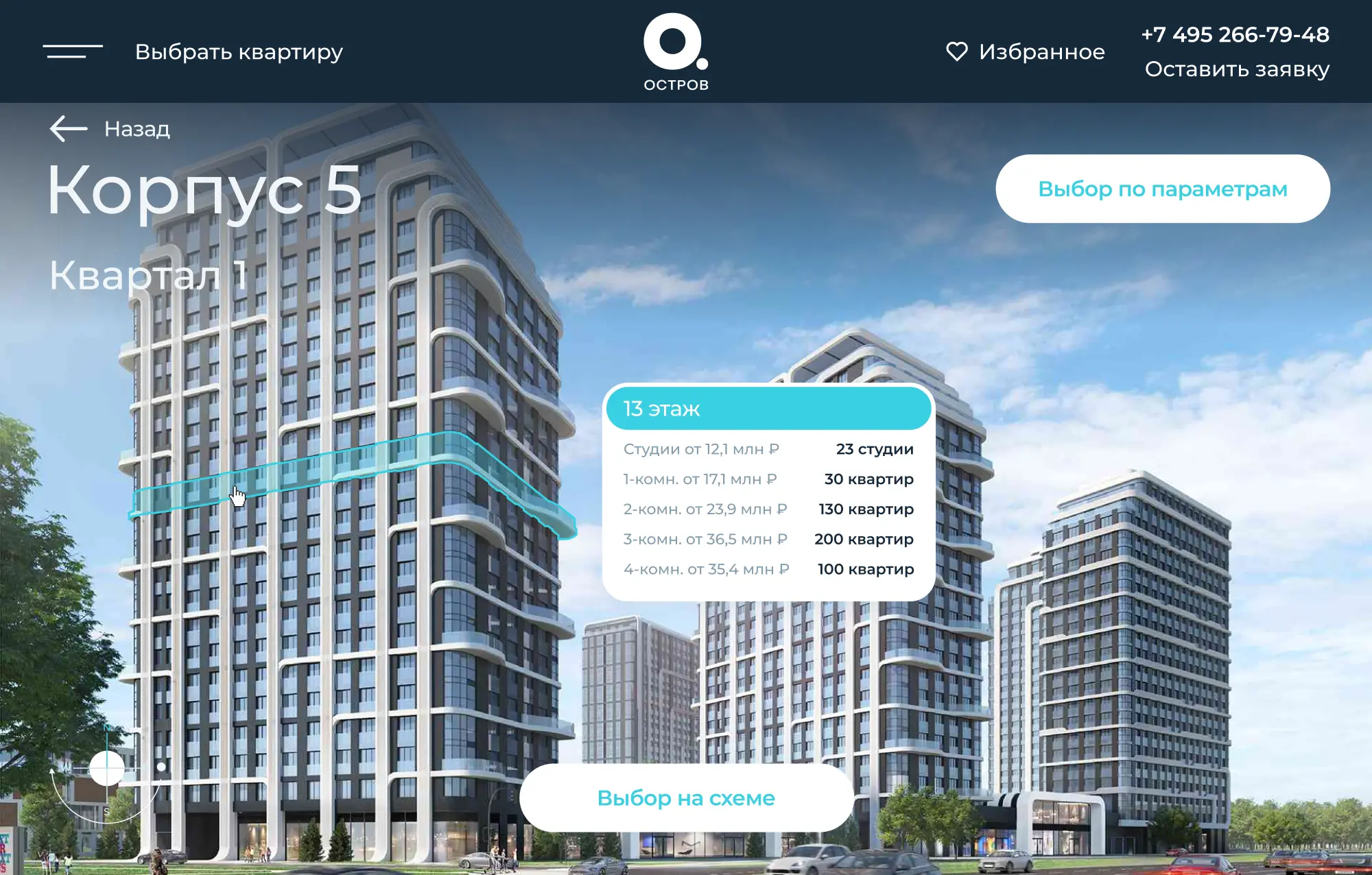 На каждую квартиру выдаётся своя карточка с планировкой, основными характеристиками, расположением на этаже и в рамках квартала. Здесь пользователь может выгрузить генери- руемый PDF-файл по квартире, оставить заявку или ознакомиться с ипотечными программами для приобретения квартиры.