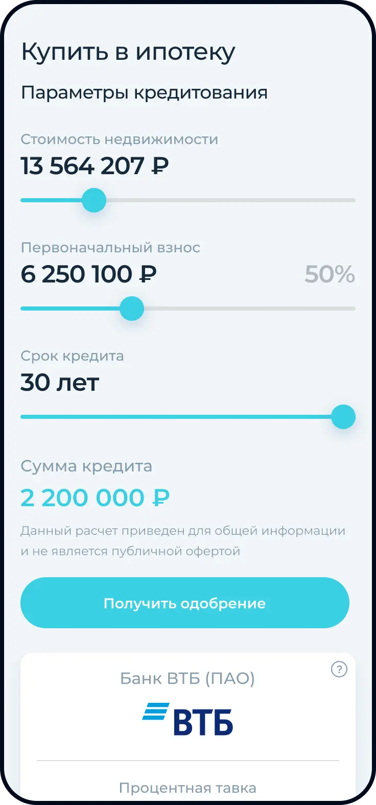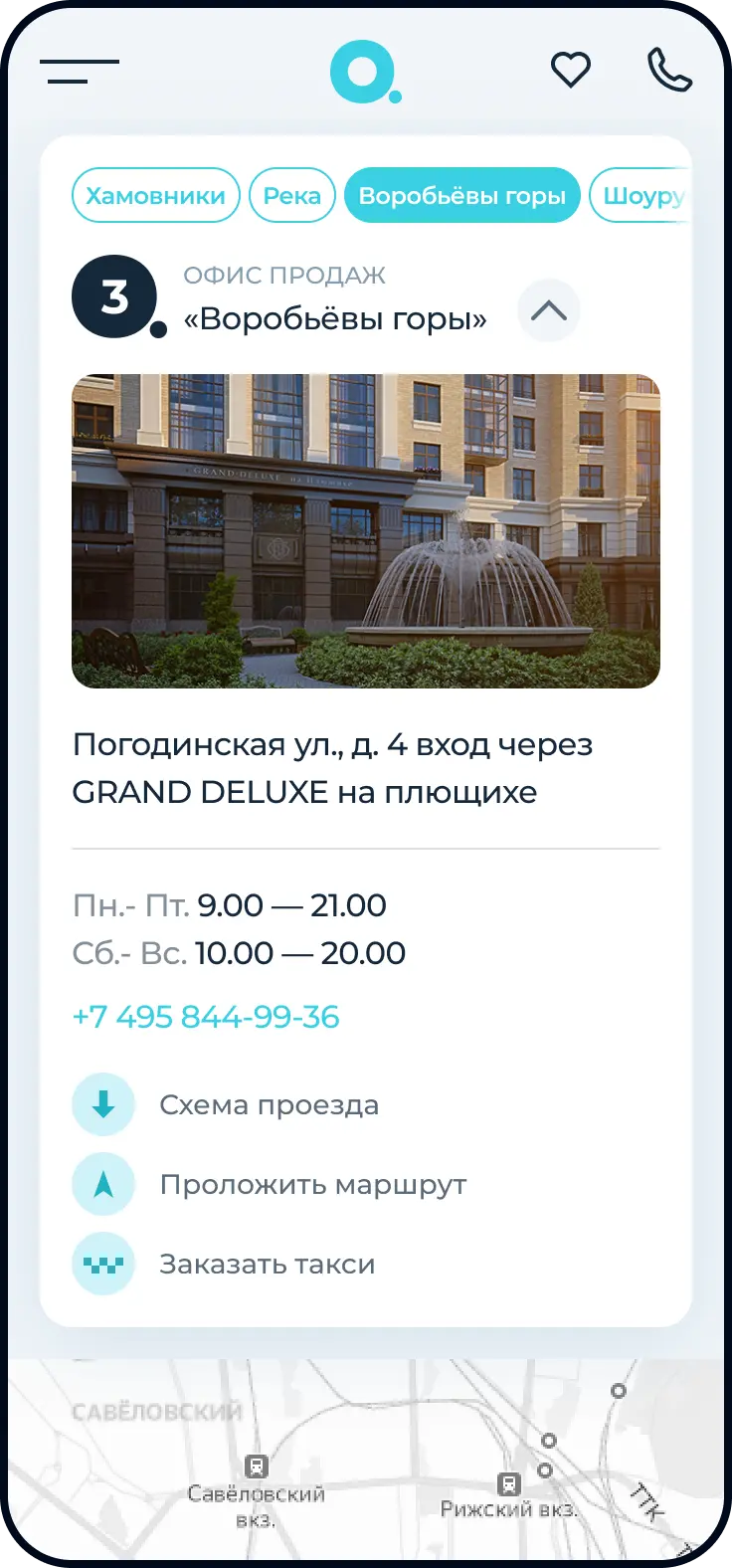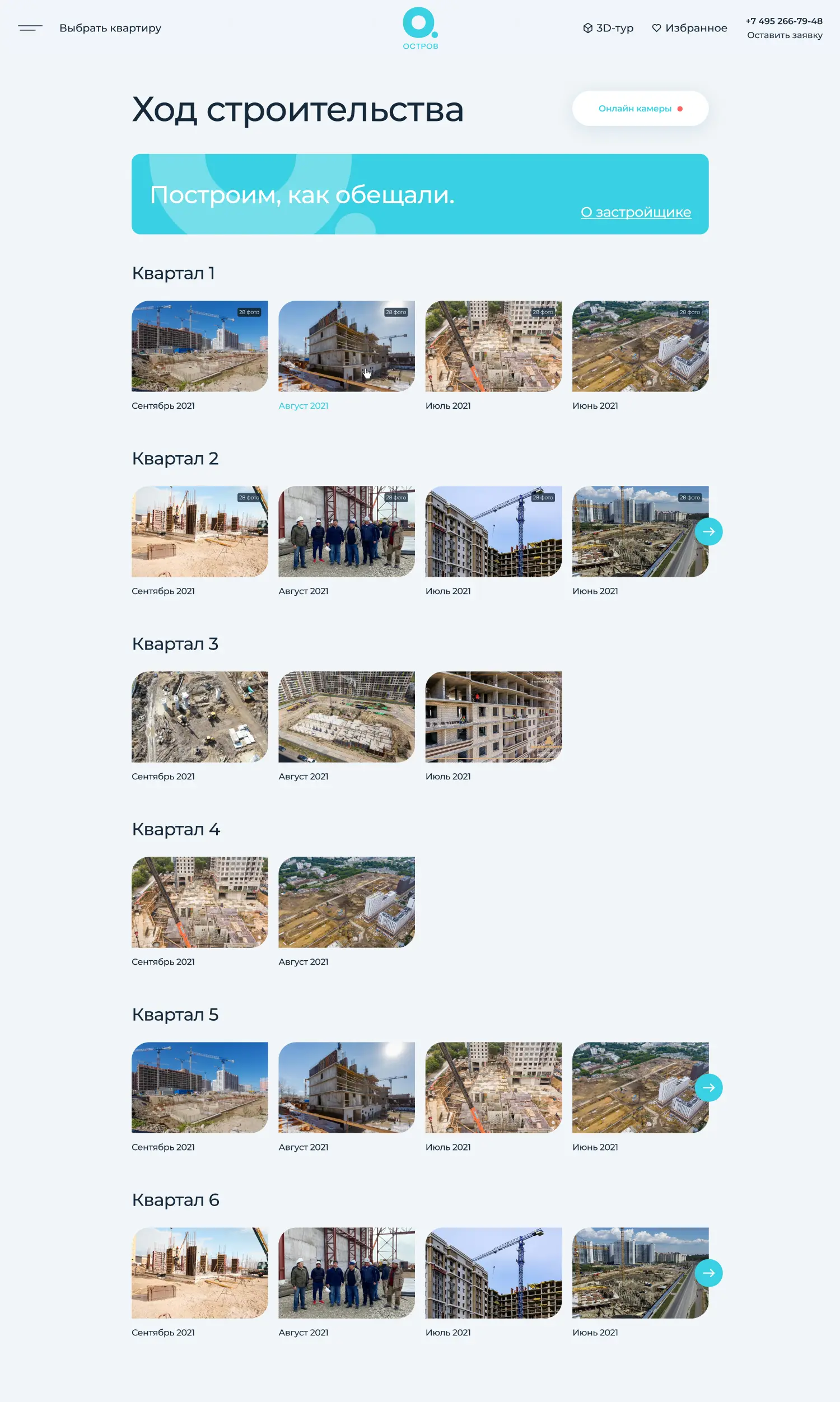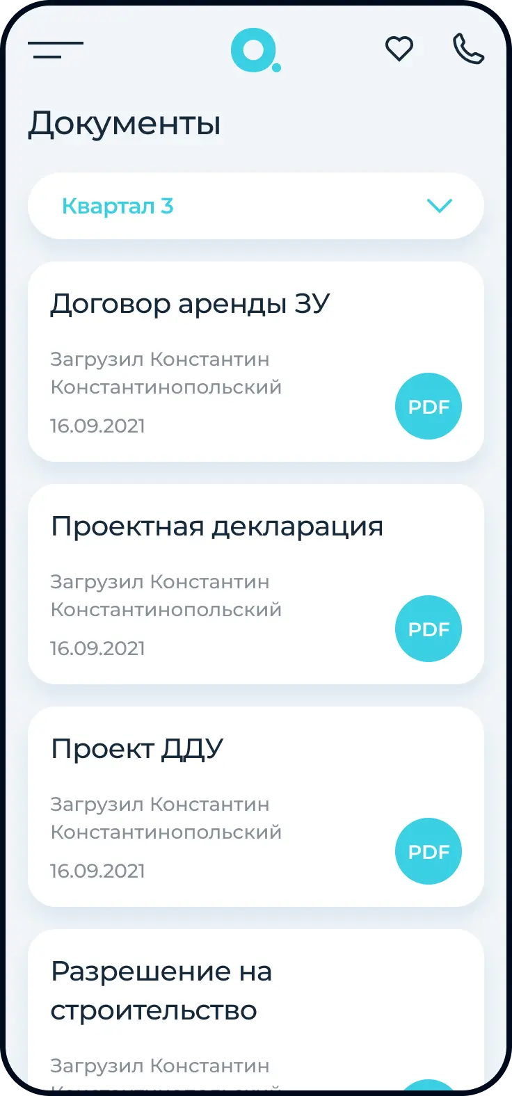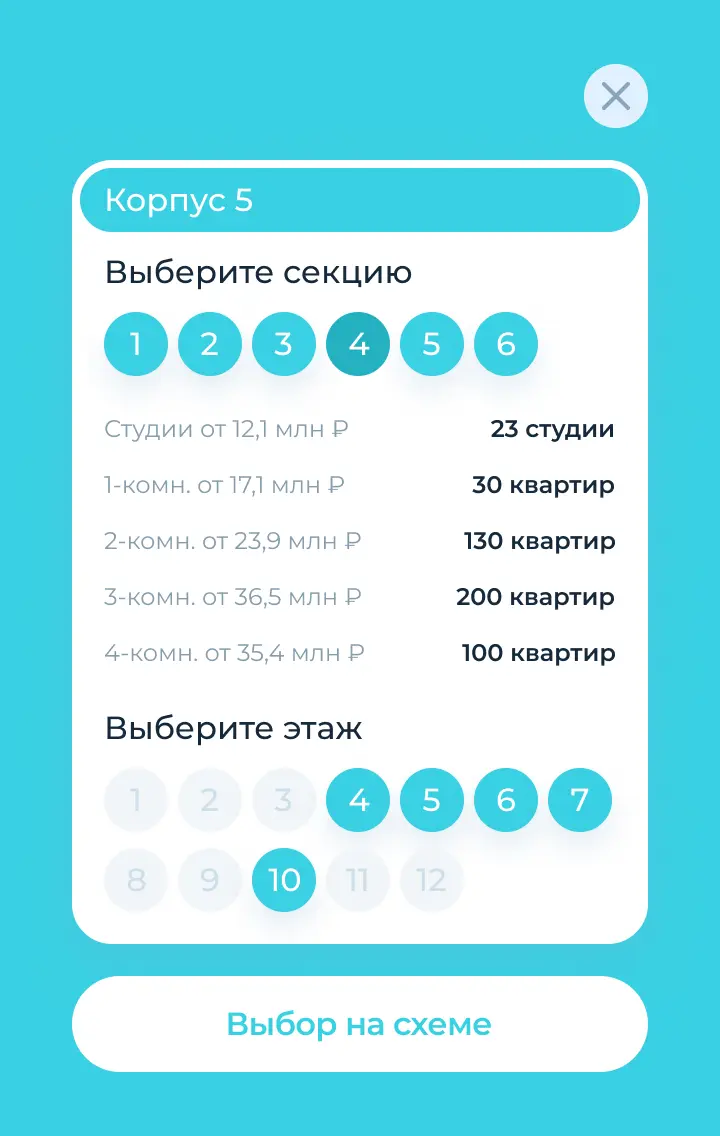 На каждую квартиру выдаётся своя карточка с планировкой, основными характеристиками, расположением на этаже и в рамках квартала. Здесь пользователь может выгрузить генери- руемый PDF-файл по квартире, оставить заявку или ознакомиться с ипотечными программами для приобретения квартиры.