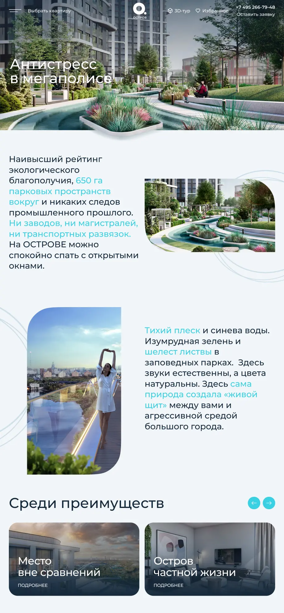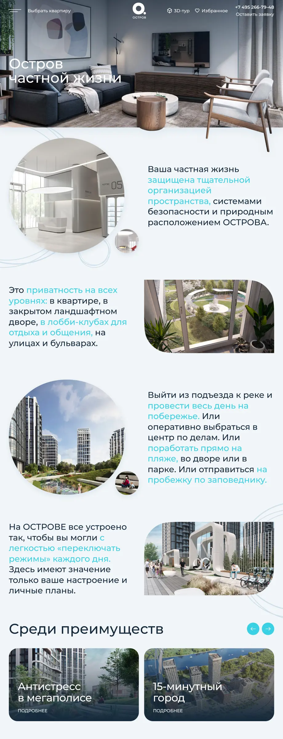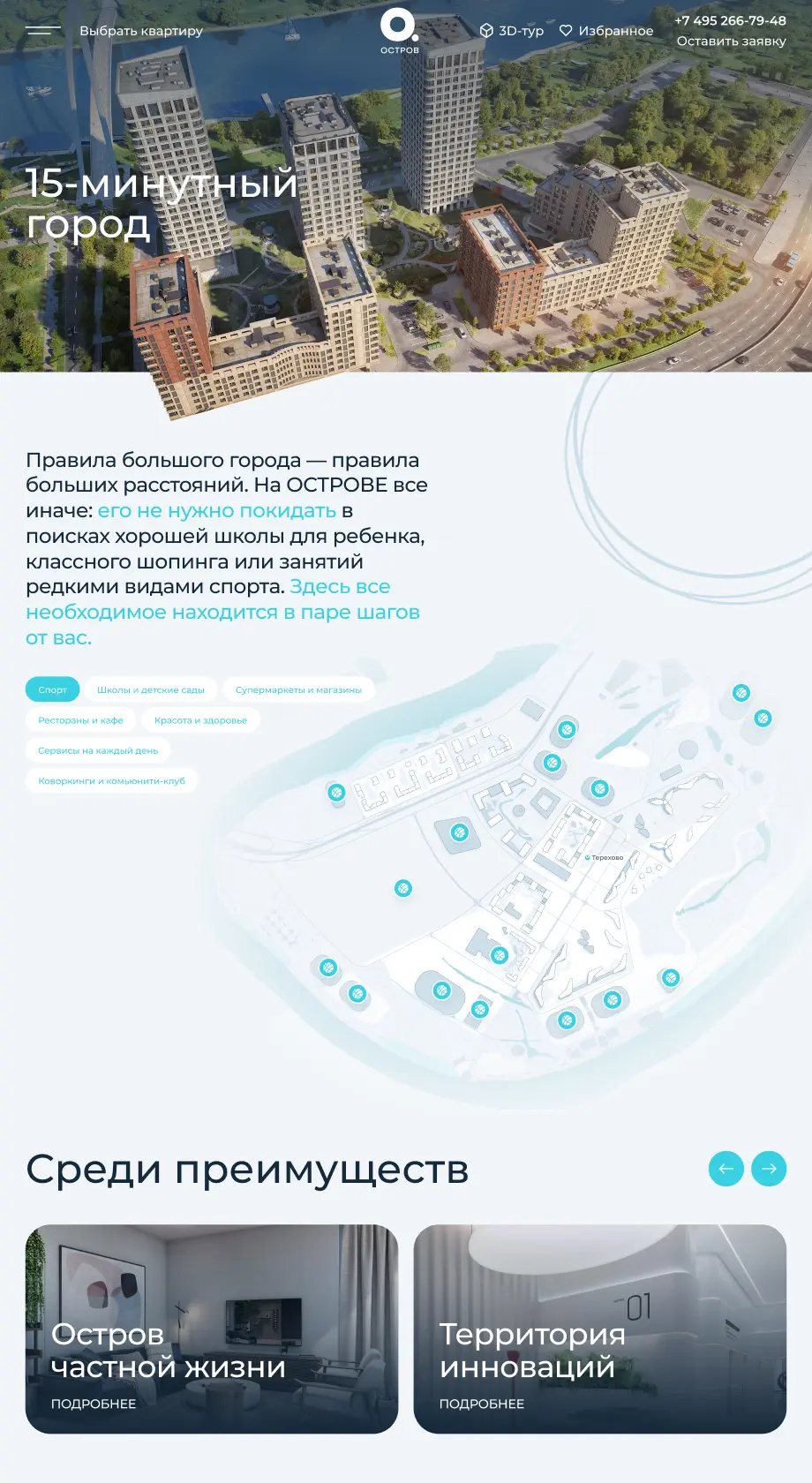 Преимущества расположения Острова расписаны ёмкими тезисами и визуализированы на карте: при скролле по тезисам графика на карте меняется.