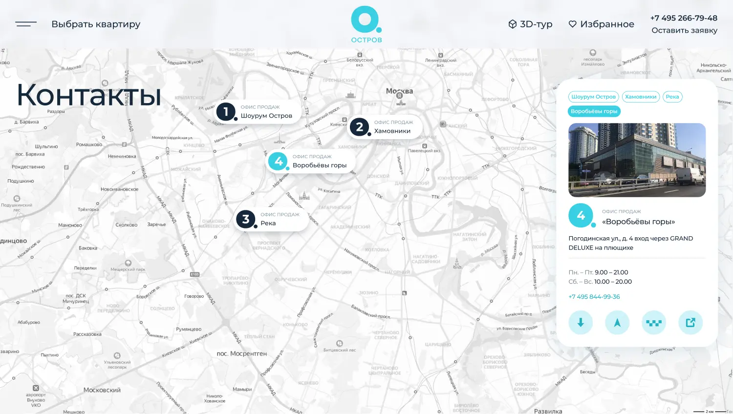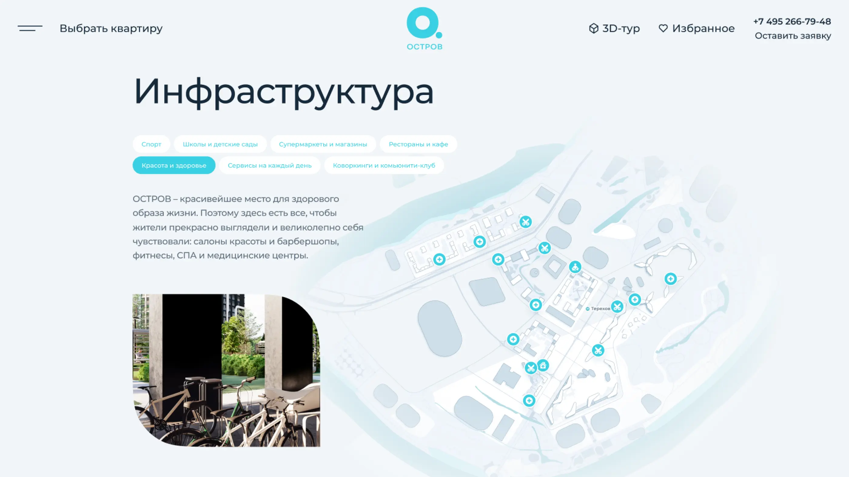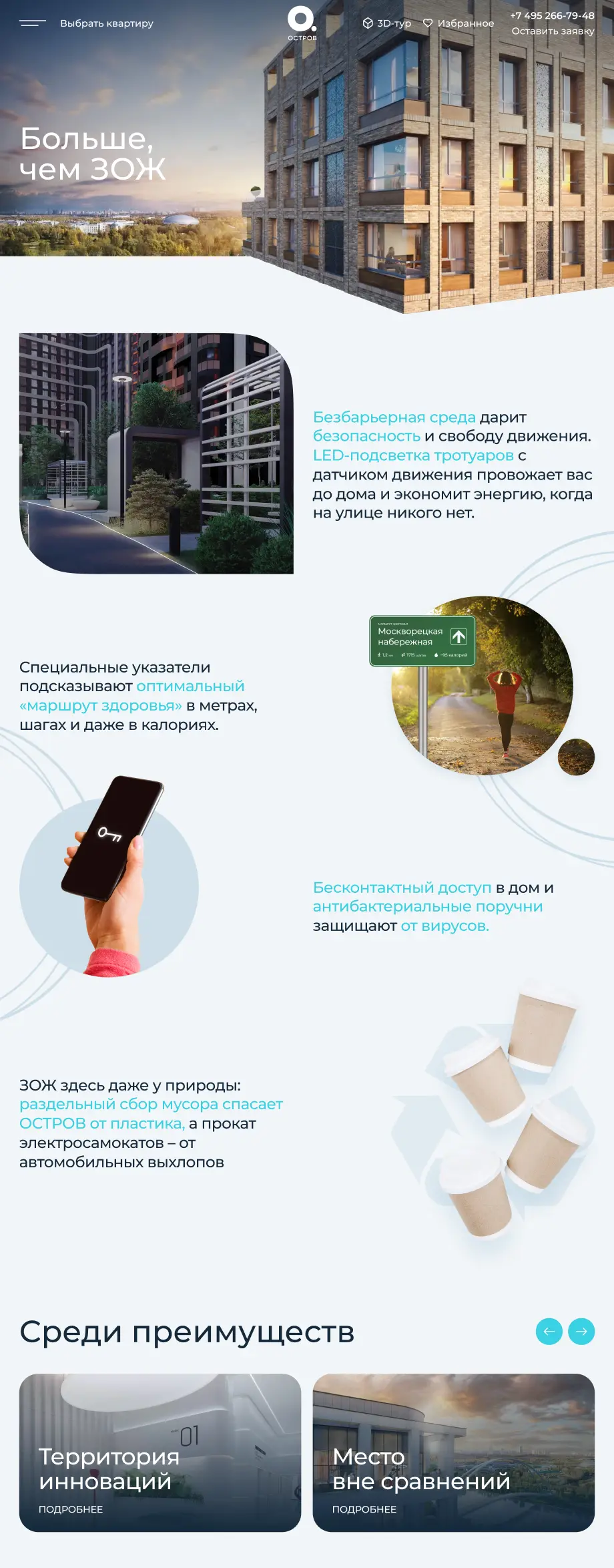 Преимущества расположения Острова расписаны ёмкими тезисами и визуализированы на карте: при скролле по тезисам графика на карте меняется.