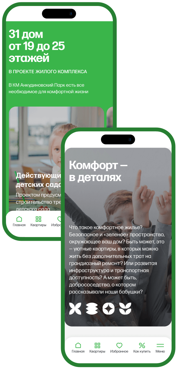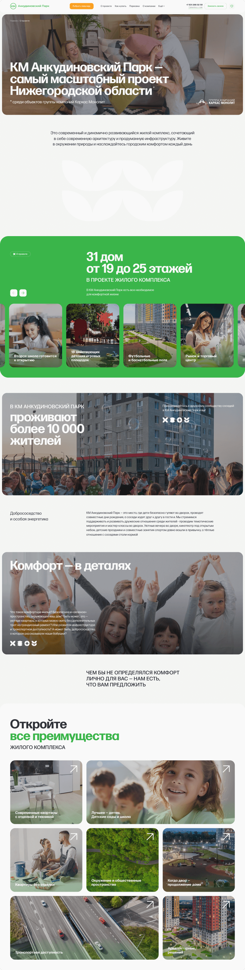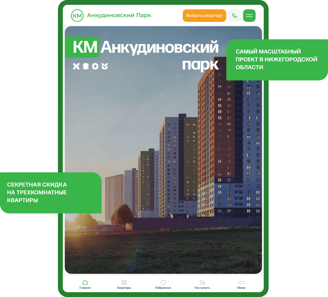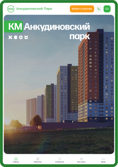 КМ Анкудиновский Парк, который строится в Нижегородской области. Чтобы раскрыть особенности и преимущества комплекса в понятной форме и вызвать интерес у пользователя, мы создали особенный фирменный стиль сайта.