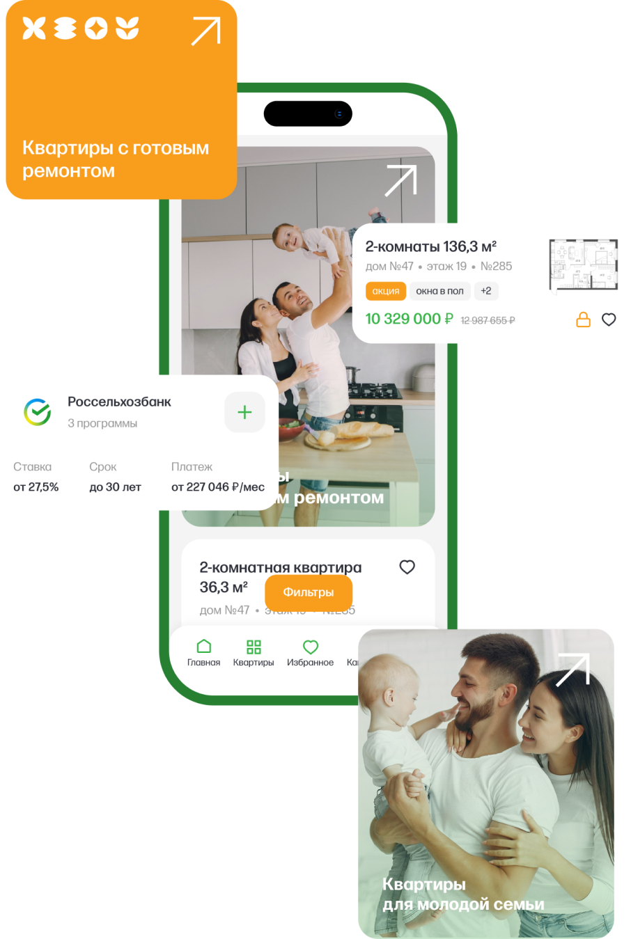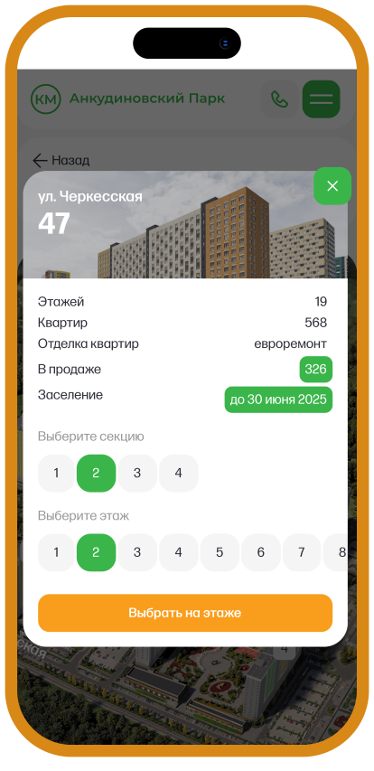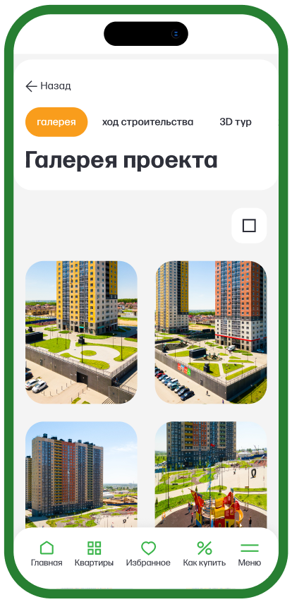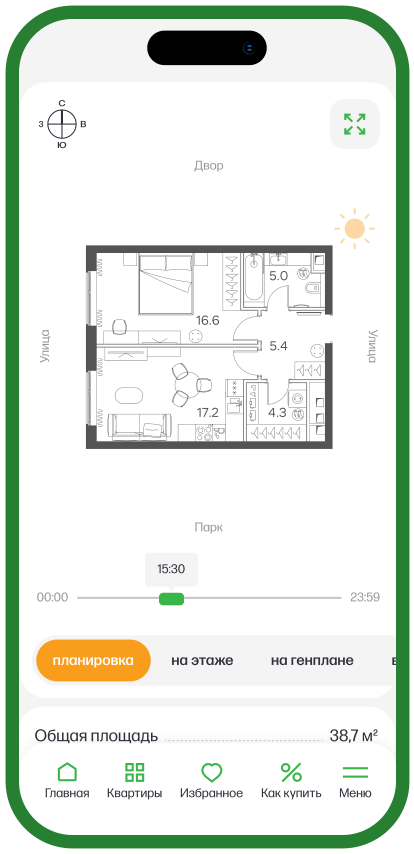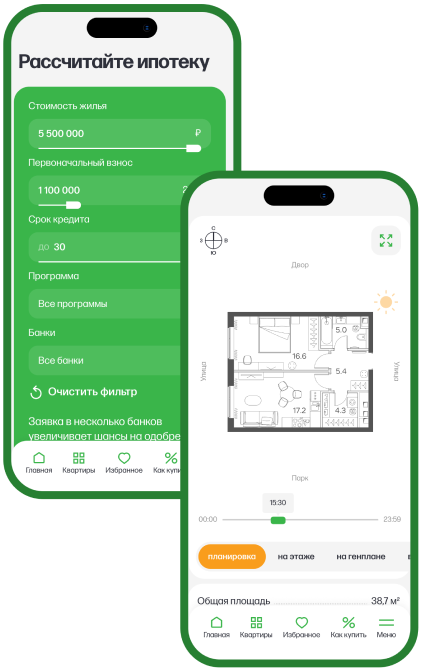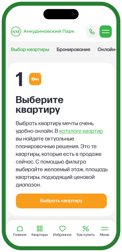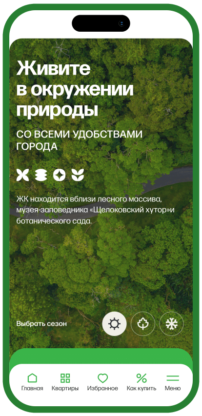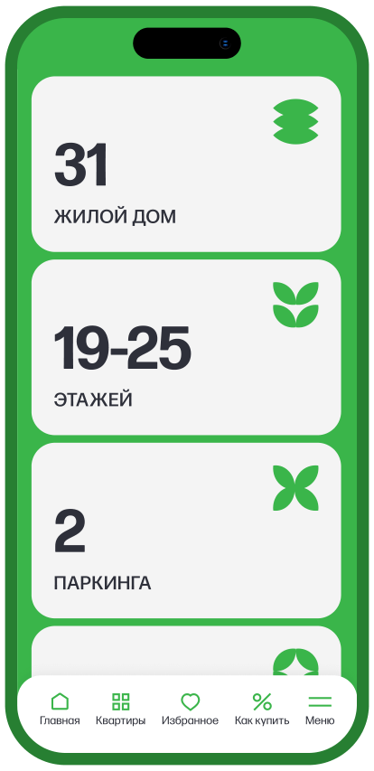 Процесс поиска квартиры максимально быстрый и удобный. Помимо параметрического выборщика доступен подбор квартир на генплане, который помогает визуально оценить масштаб жилого коплекса и выбрать удобную локацию дома.