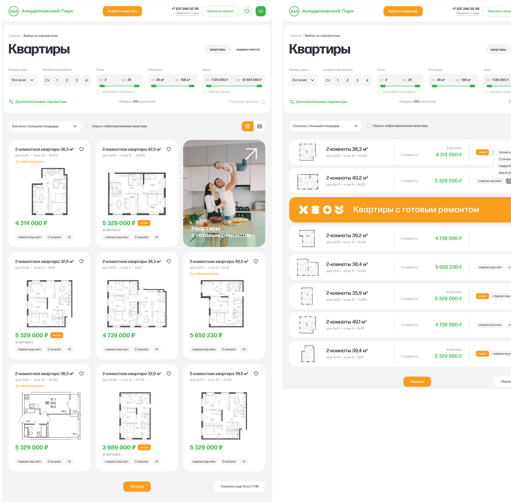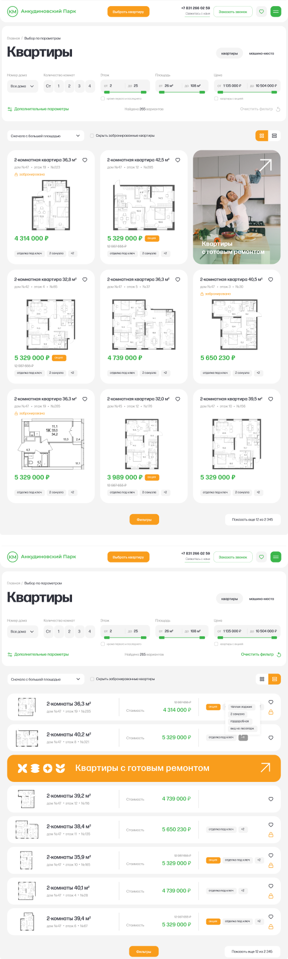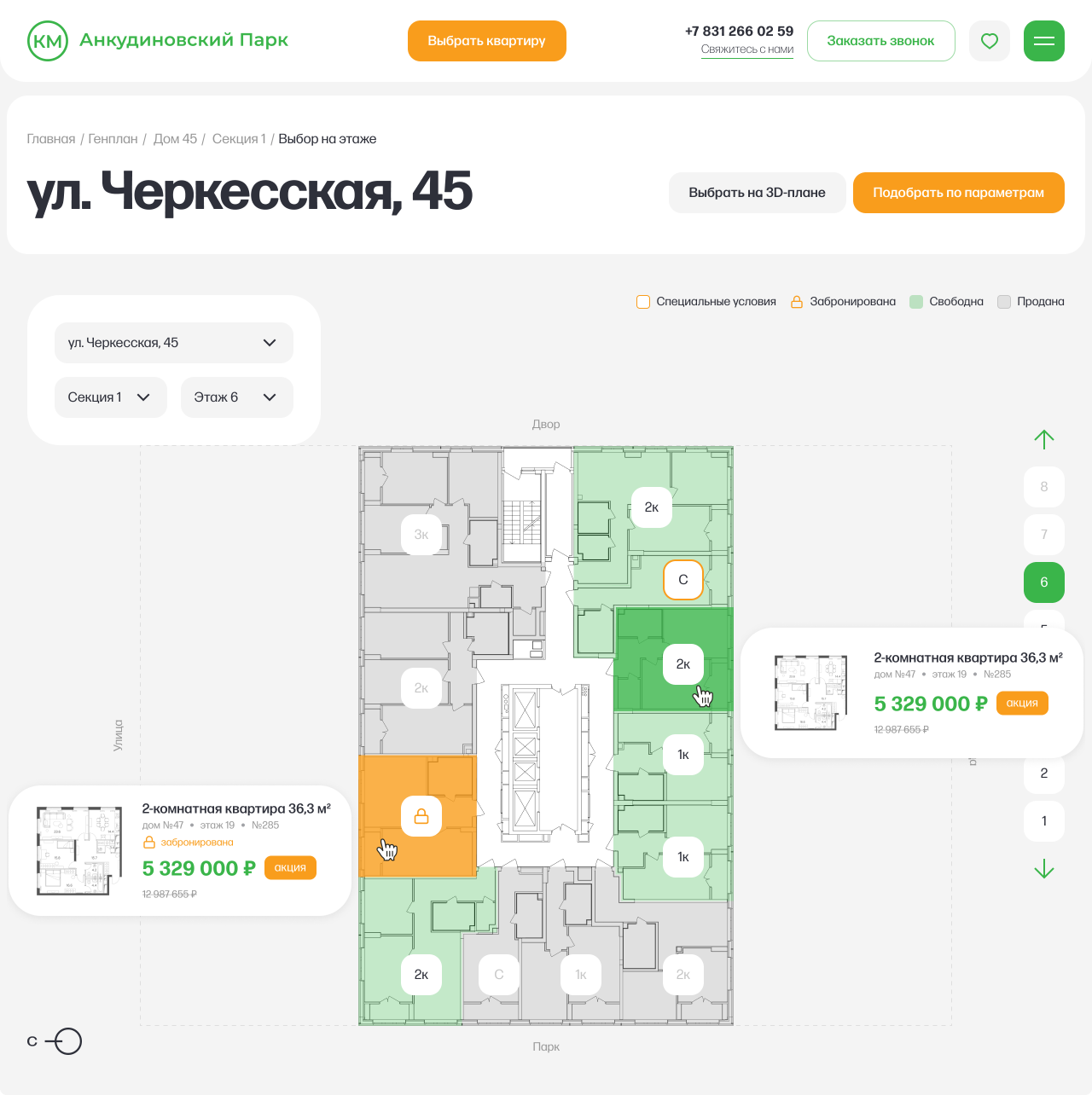 Параметрический выбор включает в себя поиск квартир и машино-мест с учетом индивидуальных запросов пользователей.