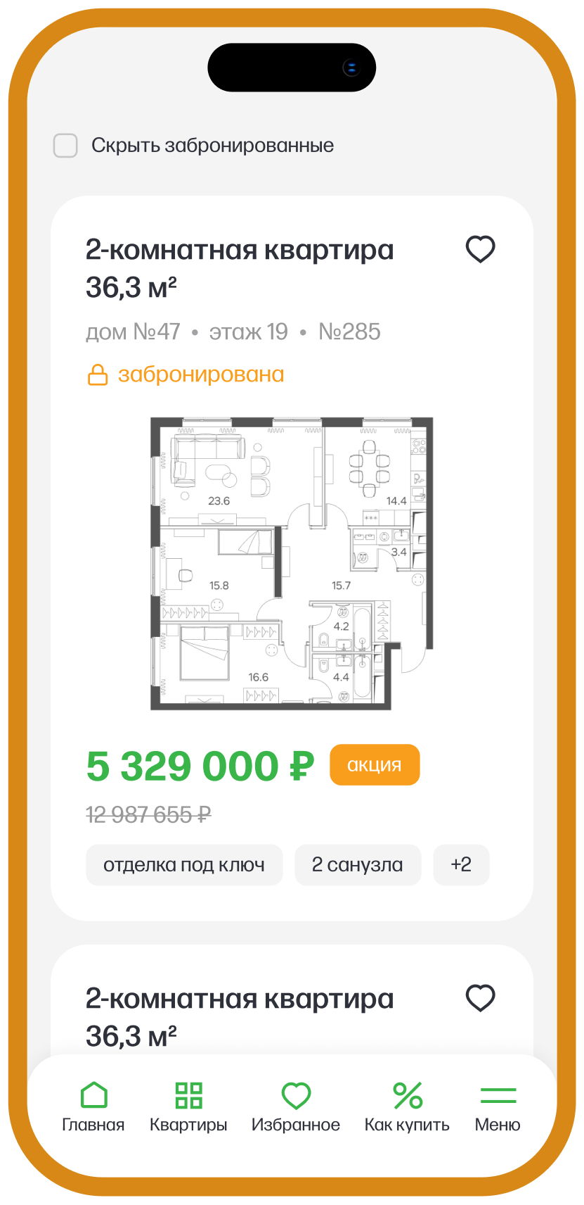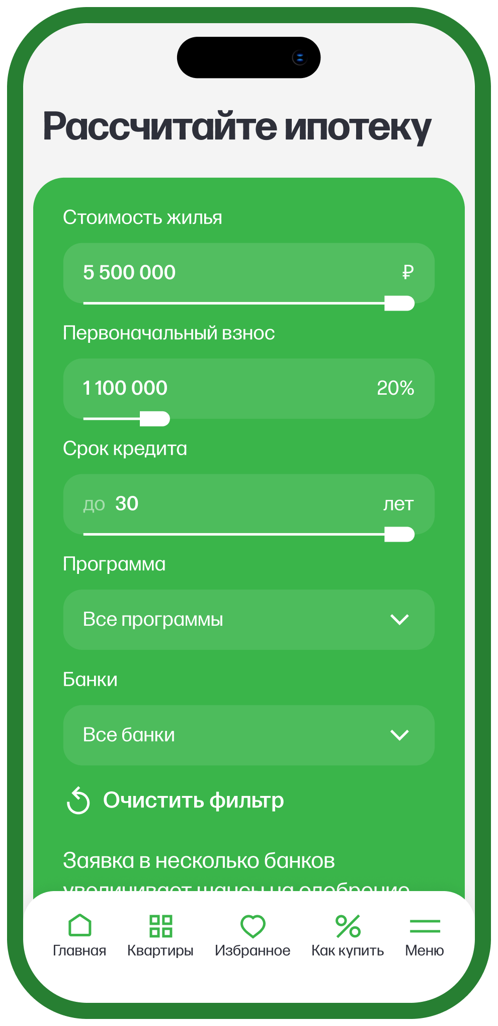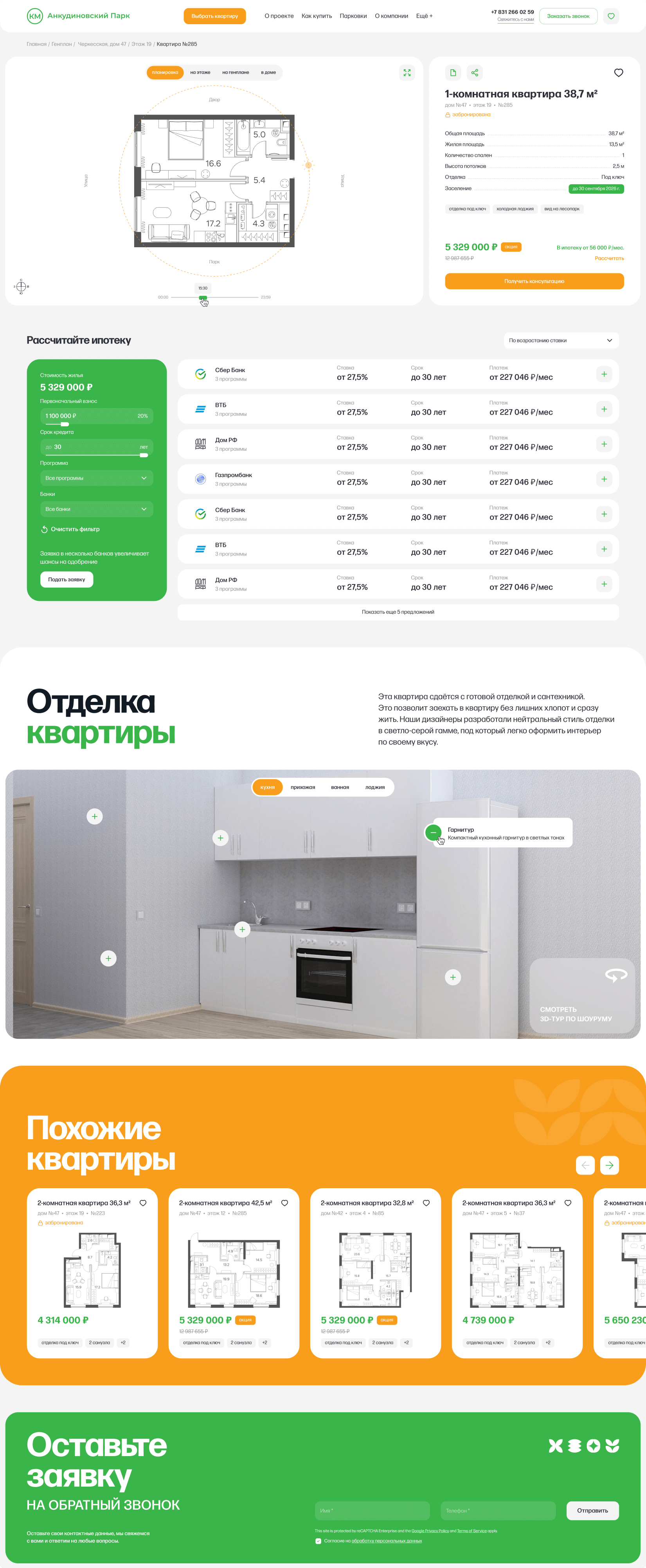 Карточка квартиры дает пользователю всю необходимую информацию о квартире и позволяет рассчитать ипотеку.