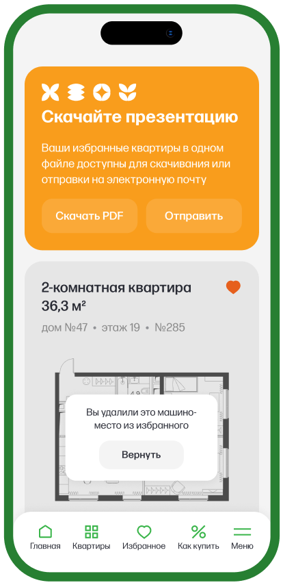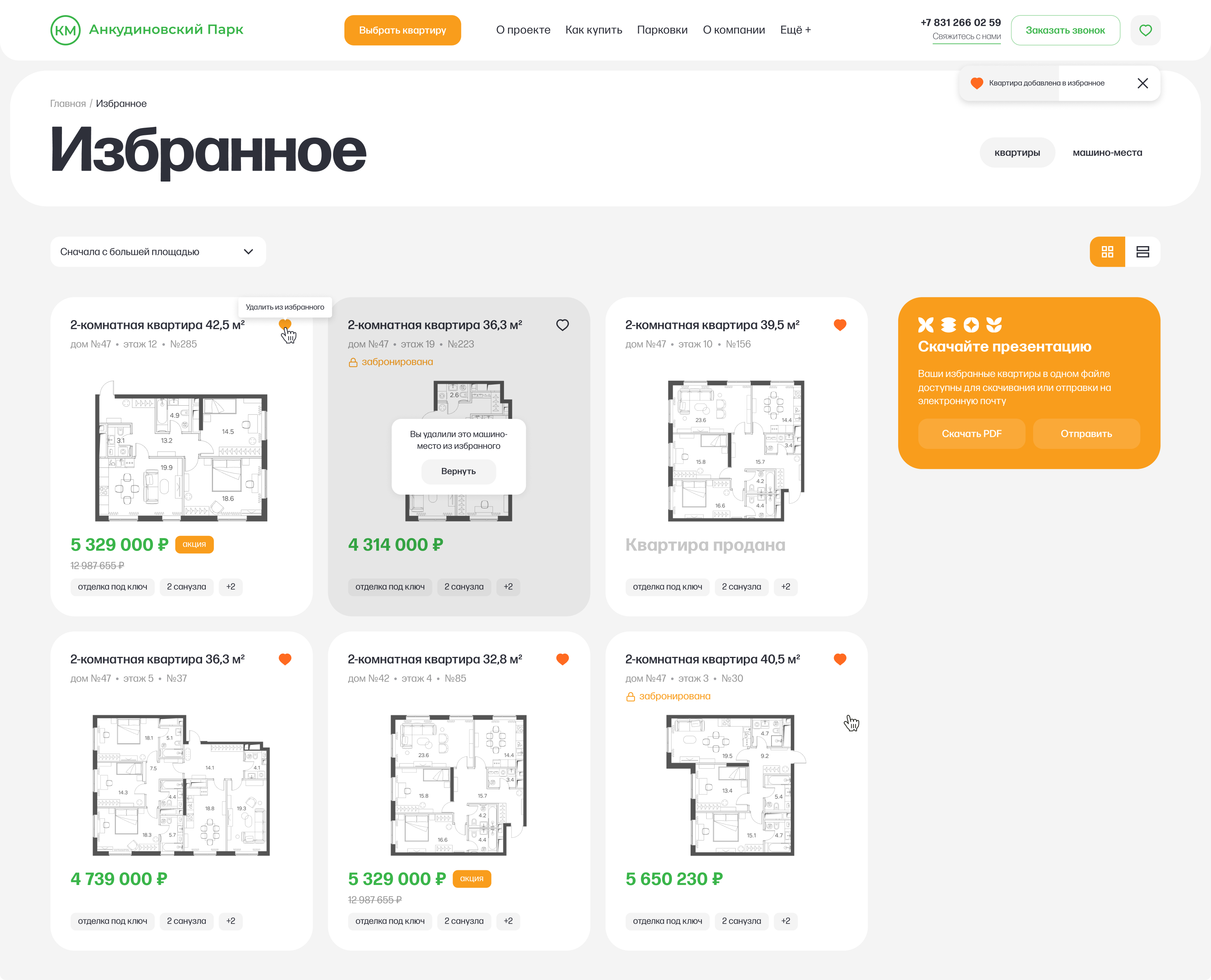 Мы реализовали раздел «Избранное», чтобы пользователь мог сохранять понравившиеся лоты. На странице можно скачать презентацию с информацией о всех сохраненных квартирах.