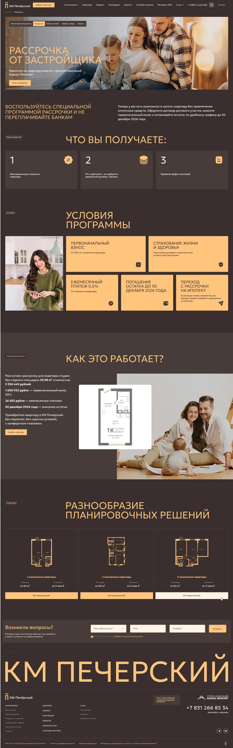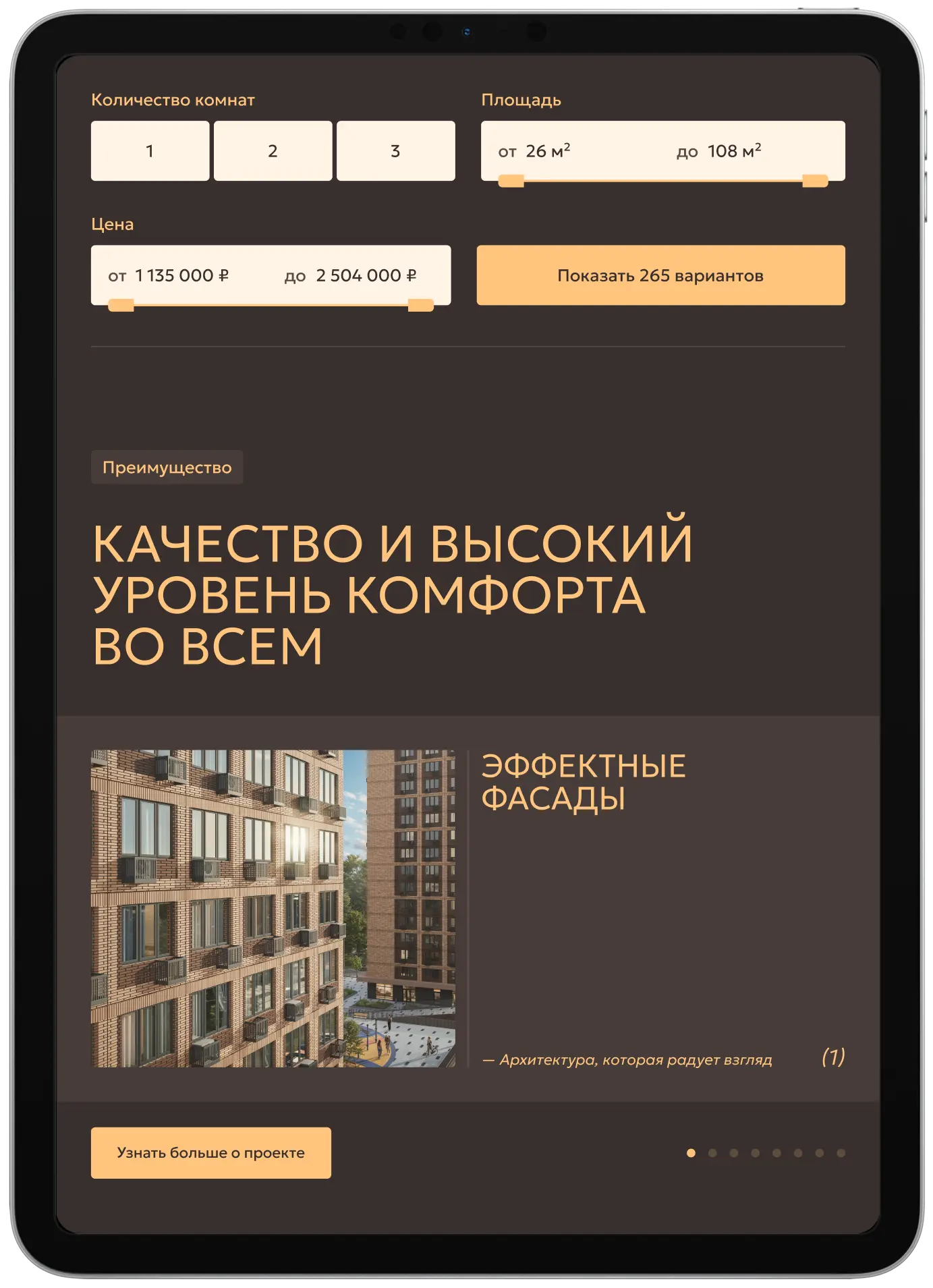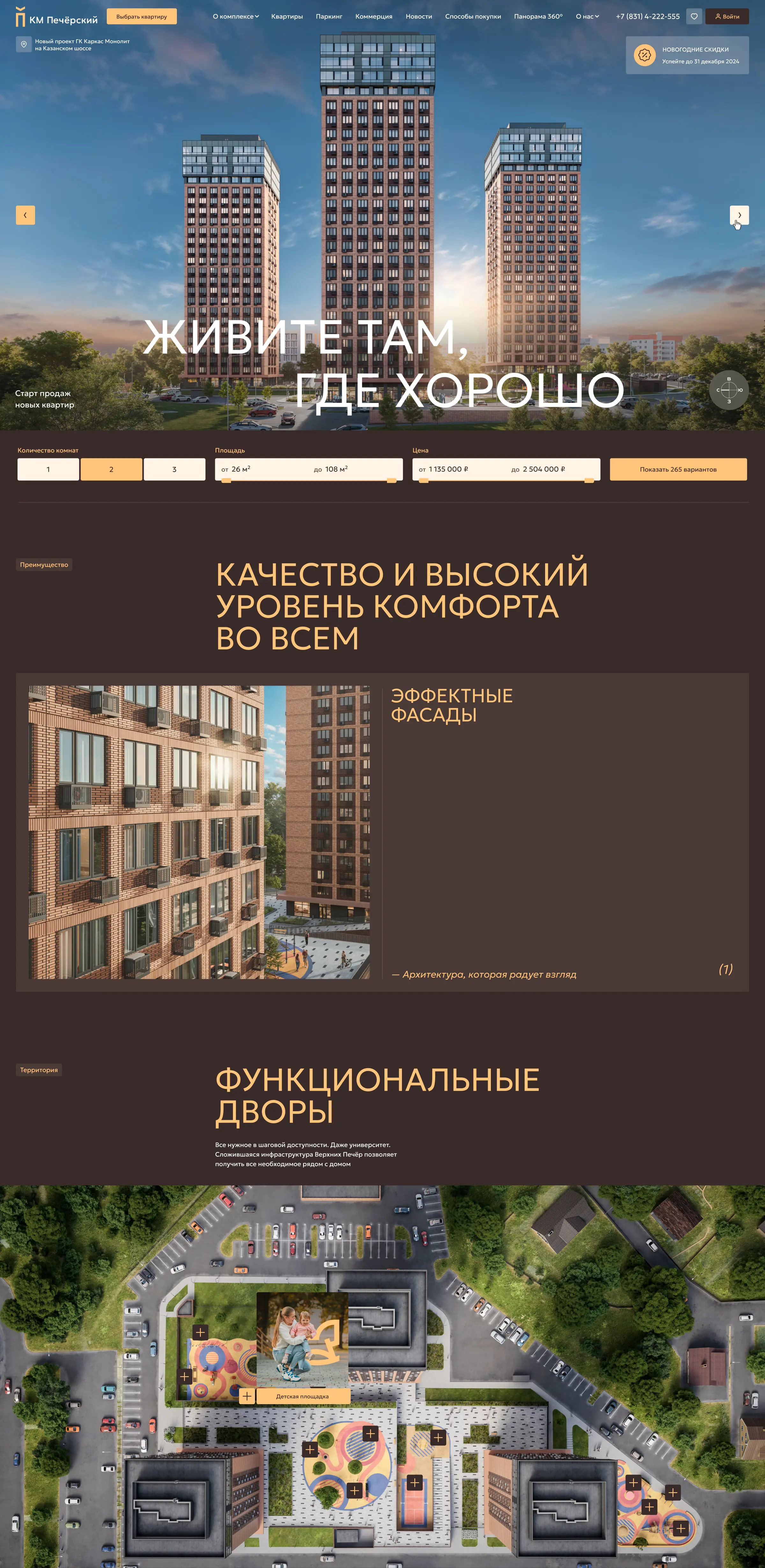 Главная страница рассказывает о преимуществах проекта, дает представление об архитектуре, инфраструктуре и отделке квартир, позволяет подобрать квартиру и машиноместо, а также получить консультацию менеджера.