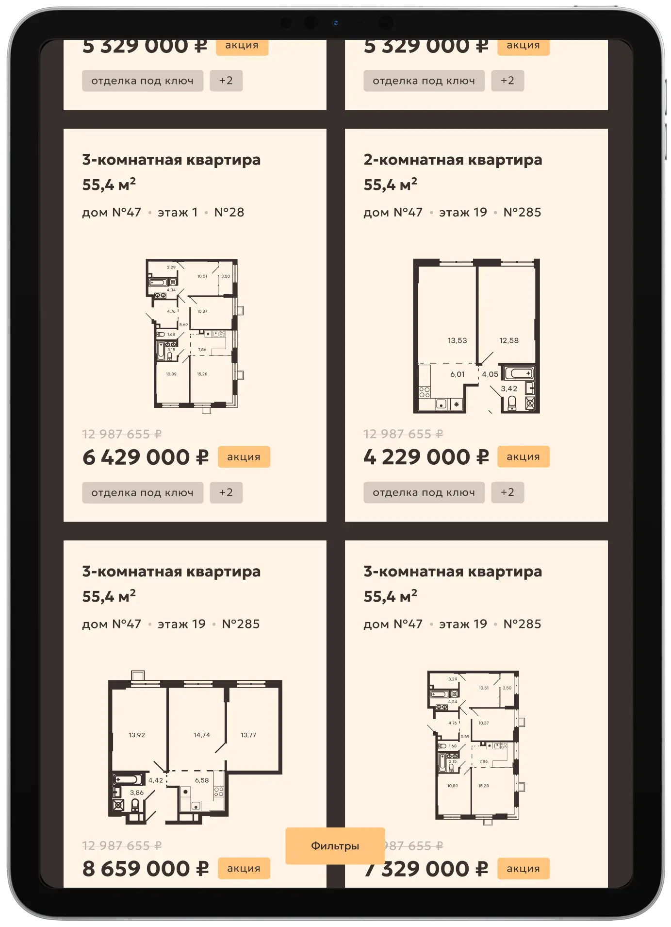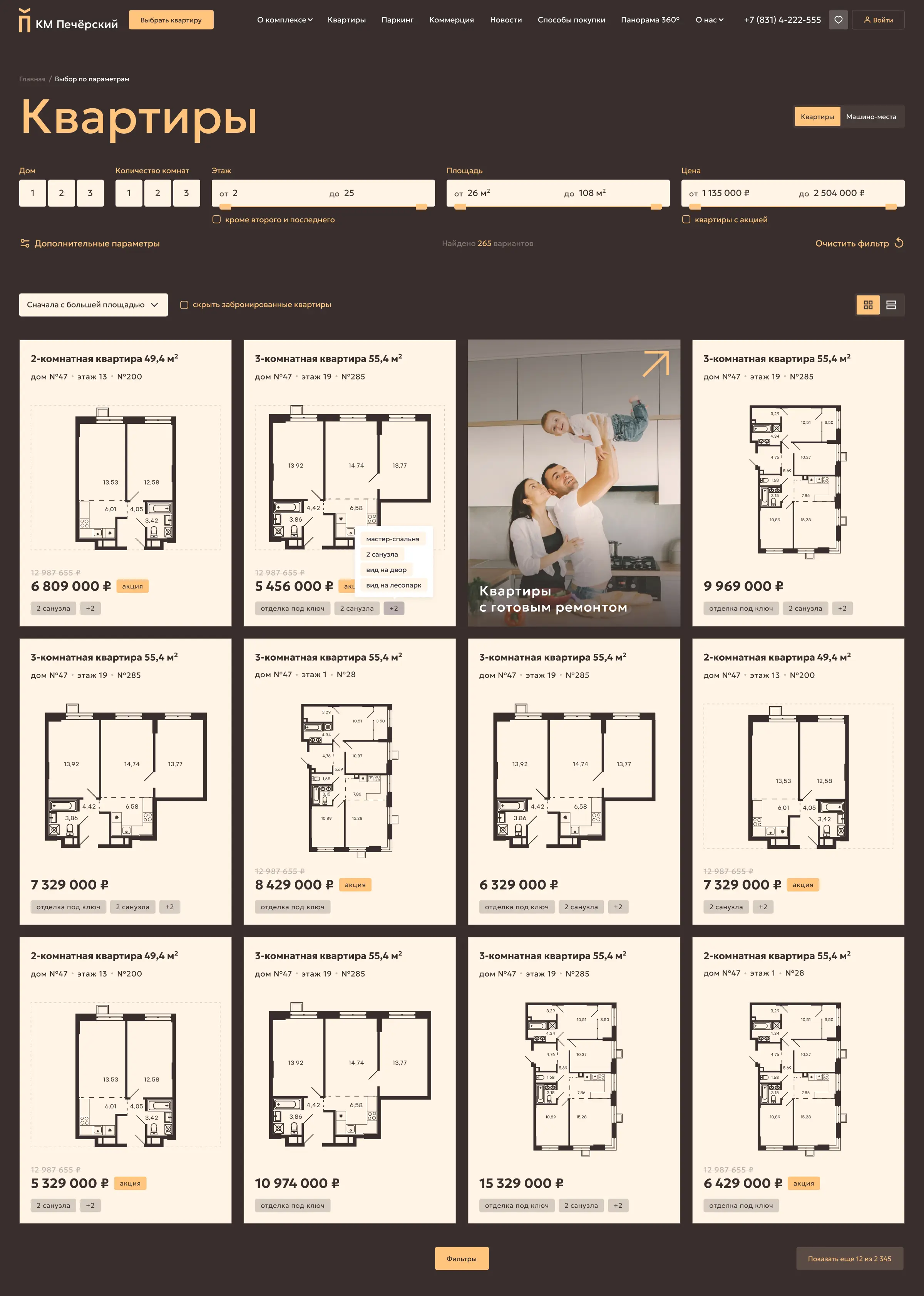 Параметрический выбор включает в себя поиск квартиры и машино-места. С учетом индивидуальных особенностей восприятия пользователей карточки недвижимости разработаны как в плиточном виде, так и в формате списка.