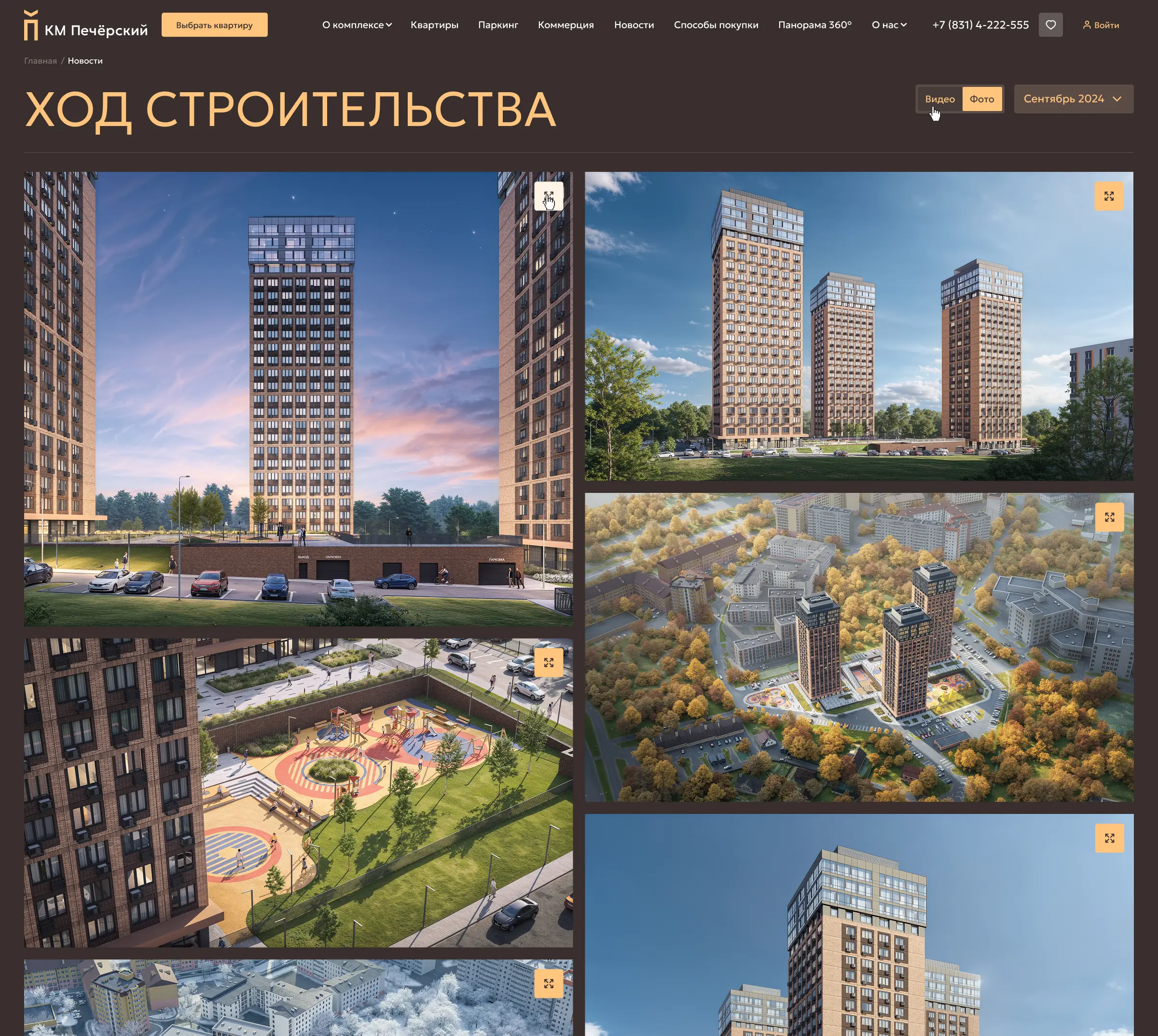 Страница «Ход строительства» позволяет отслеживать этапы возведения, демонстрируя регулярные обновления, фото и видеоотчеты,