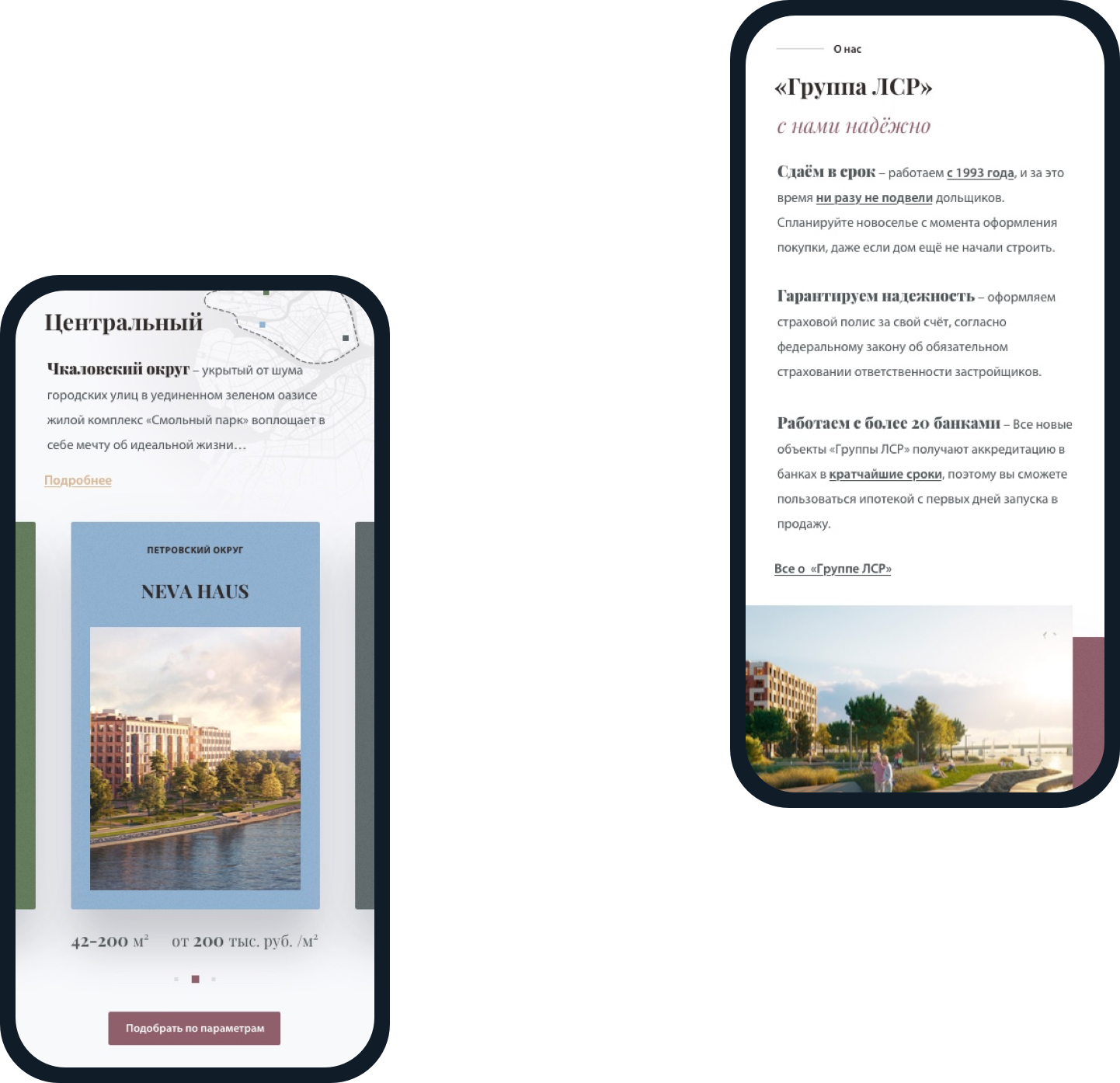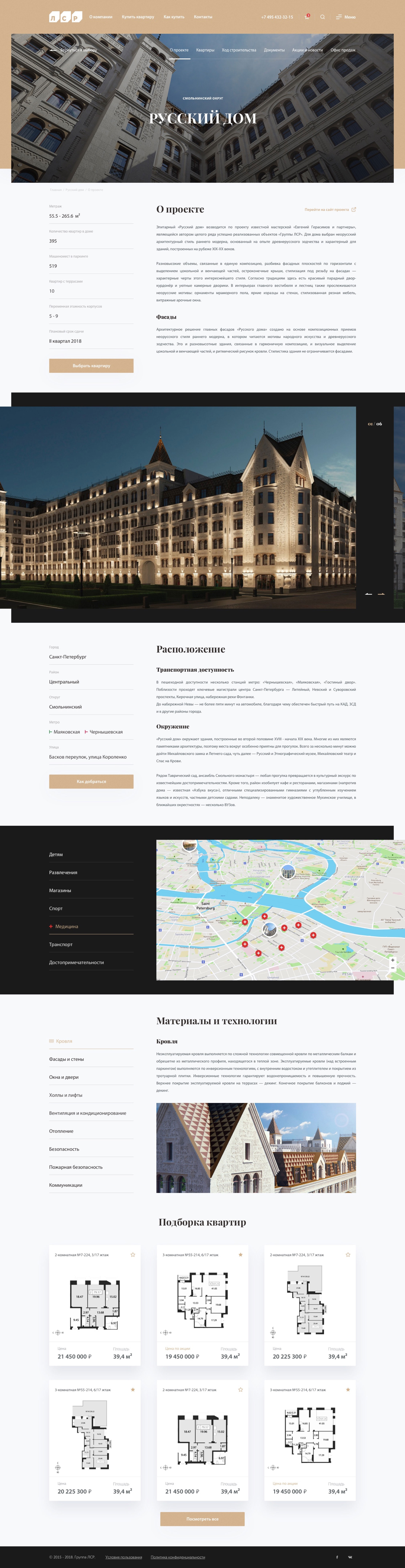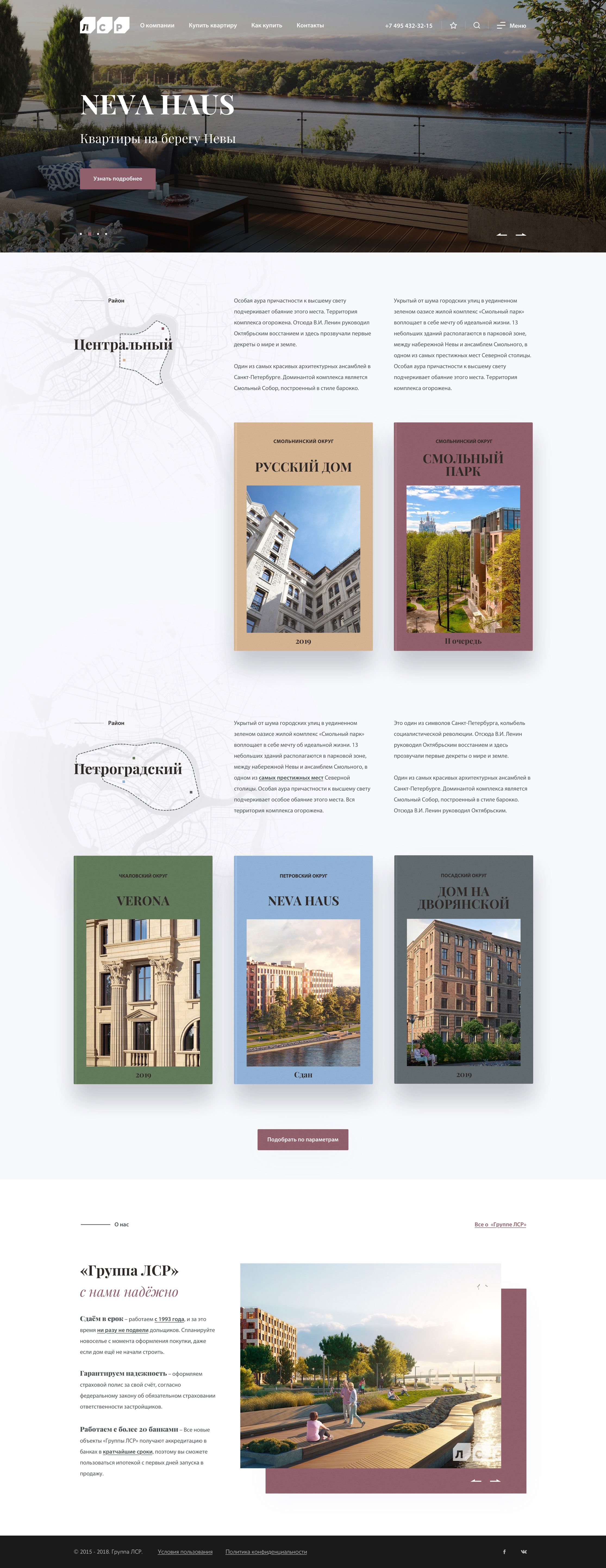Ключевая характеристика элитных объектов недвижимости “Группы ЛСР” в Санкт-Петербурге — их расположение, поэтому на главной странице мы акцентировали именно этот момент. Проекты разнесены по районам и округам Санкт-Петербурга. Здесь же покупатель начинает получать информацию об истории каждого округа, его архитектурных традициях, престижности. Визуальная подача намеренно оформлена в “книжном” формате. Это отсылка к образу книги, классической литературе и классическому искусству.