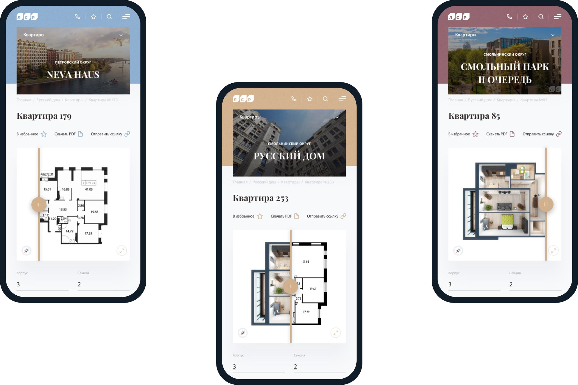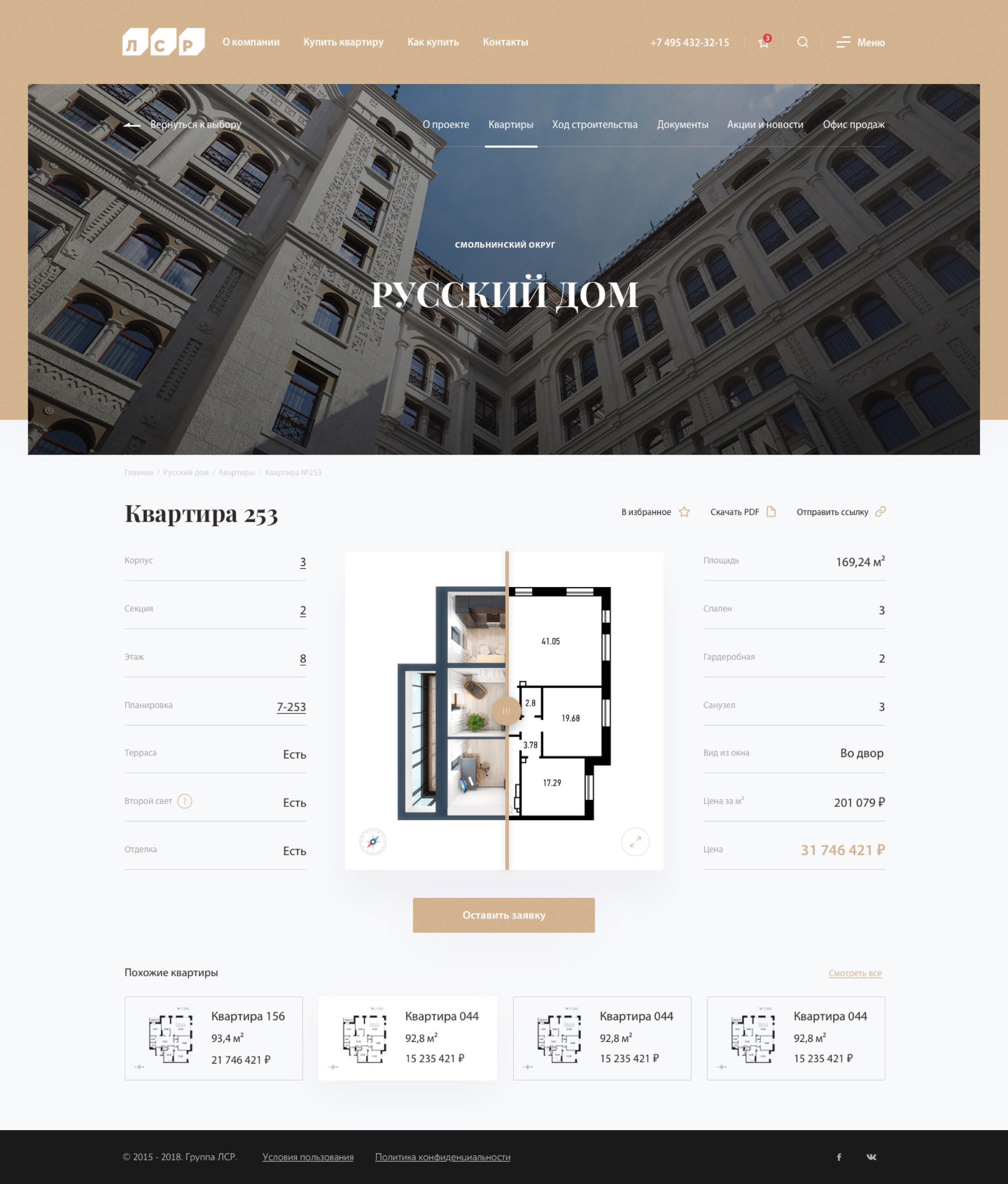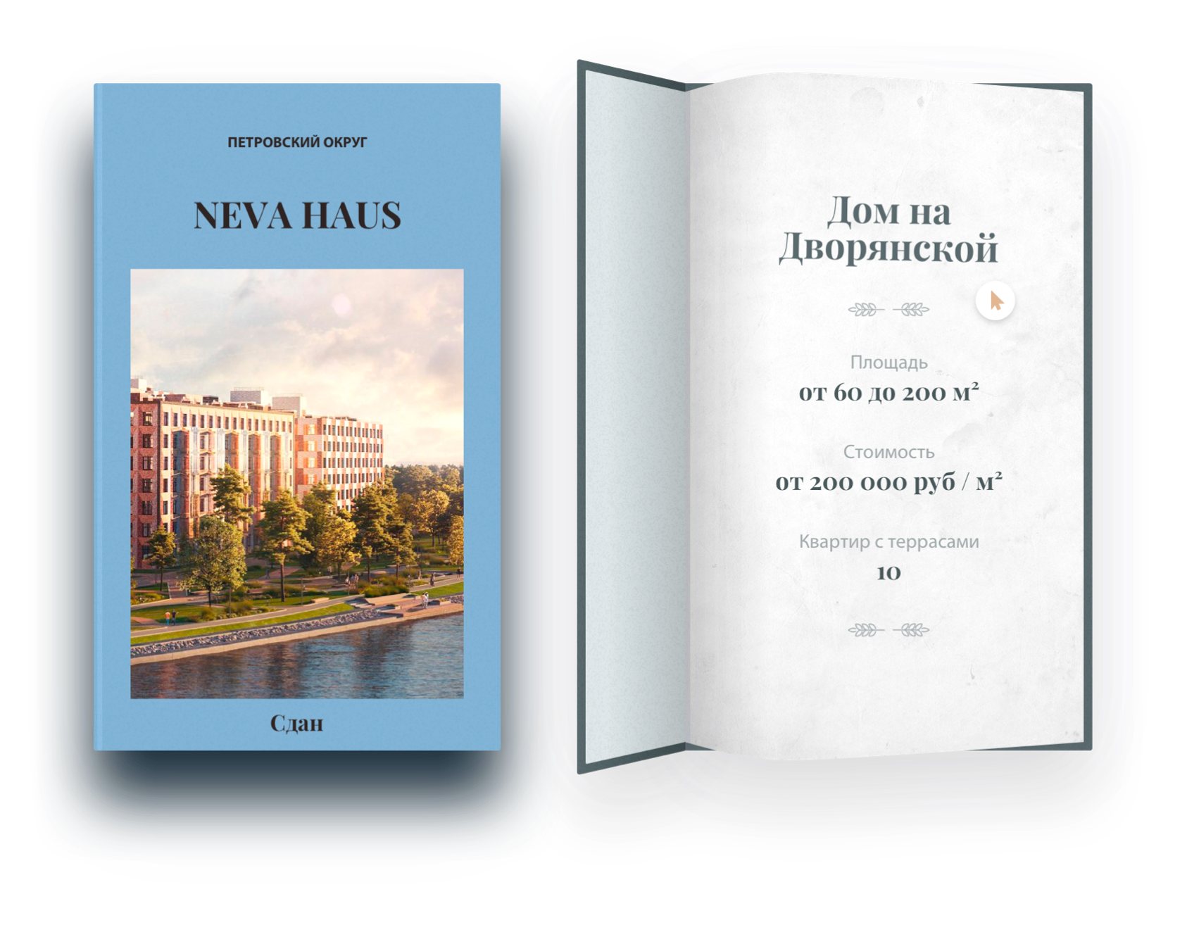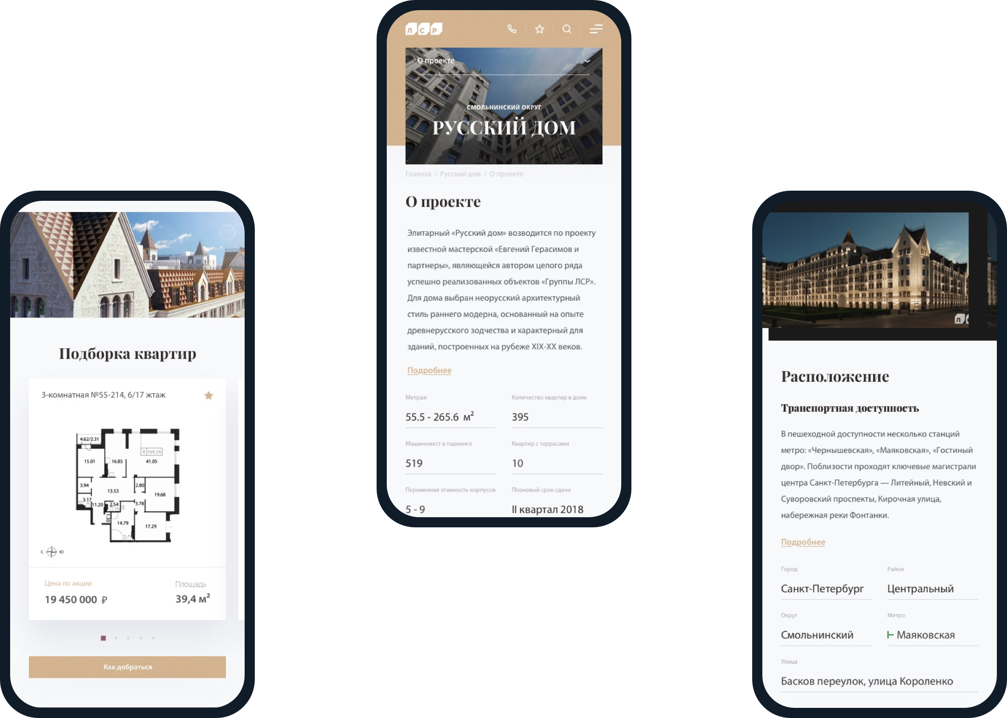 Ключевая характеристика элитных объектов недвижимости “Группы ЛСР” в Санкт-Петербурге — их расположение, поэтому на главной странице мы акцентировали именно этот момент. Проекты разнесены по районам и округам Санкт-Петербурга. Здесь же покупатель начинает получать информацию об истории каждого округа, его архитектурных традициях, престижности. Визуальная подача намеренно оформлена в “книжном” формате. Это отсылка к образу книги, классической литературе и классическому искусству.