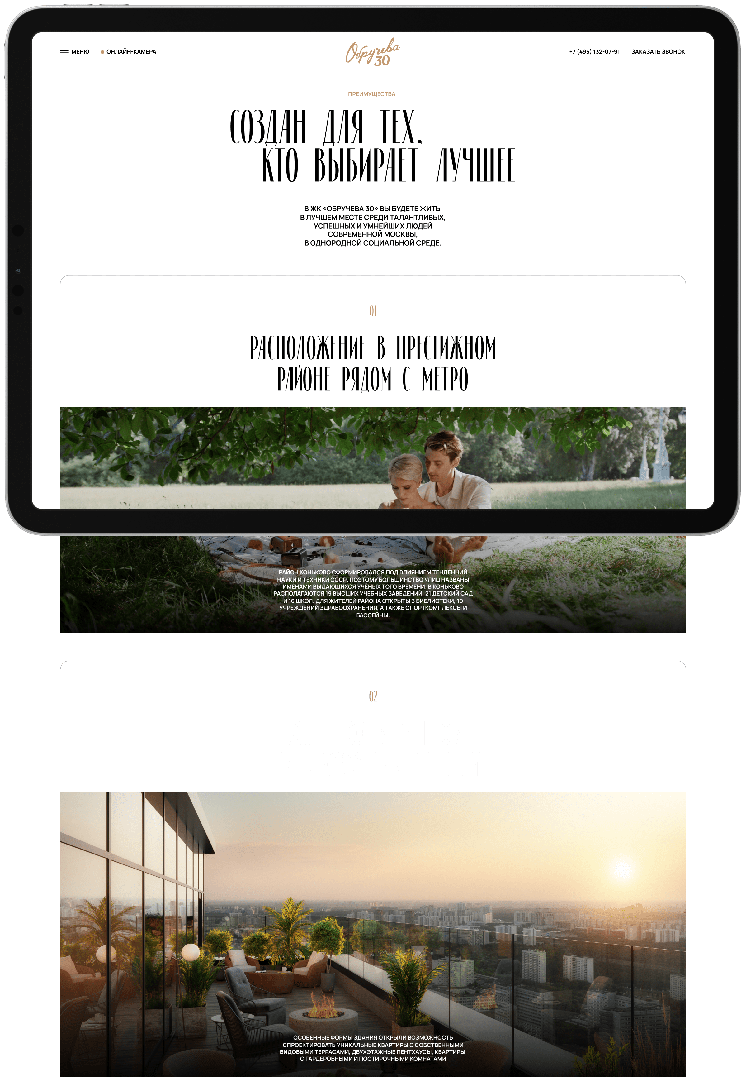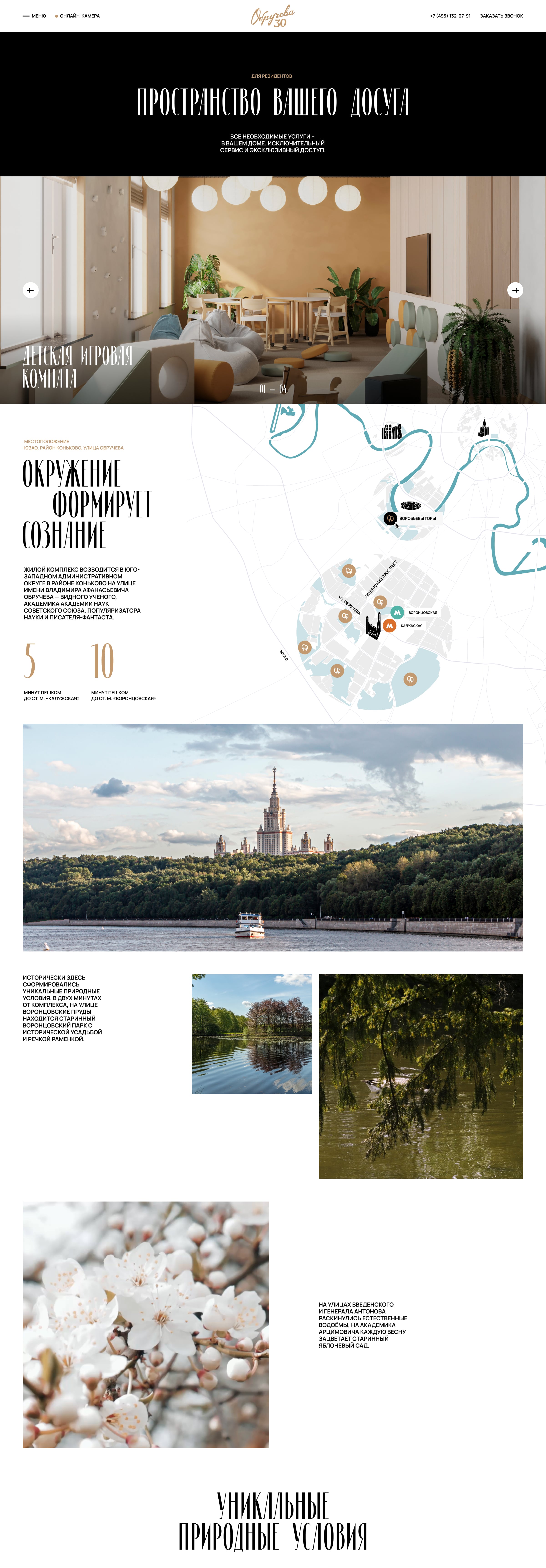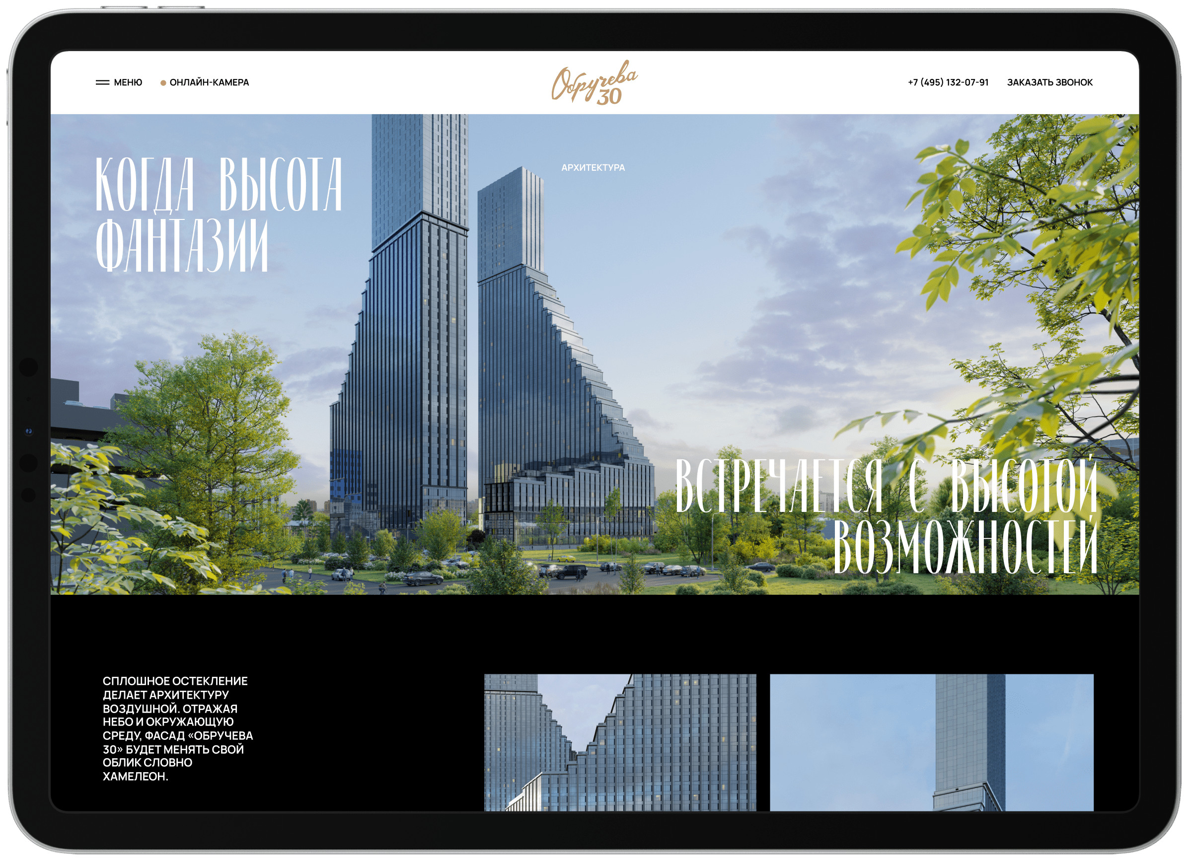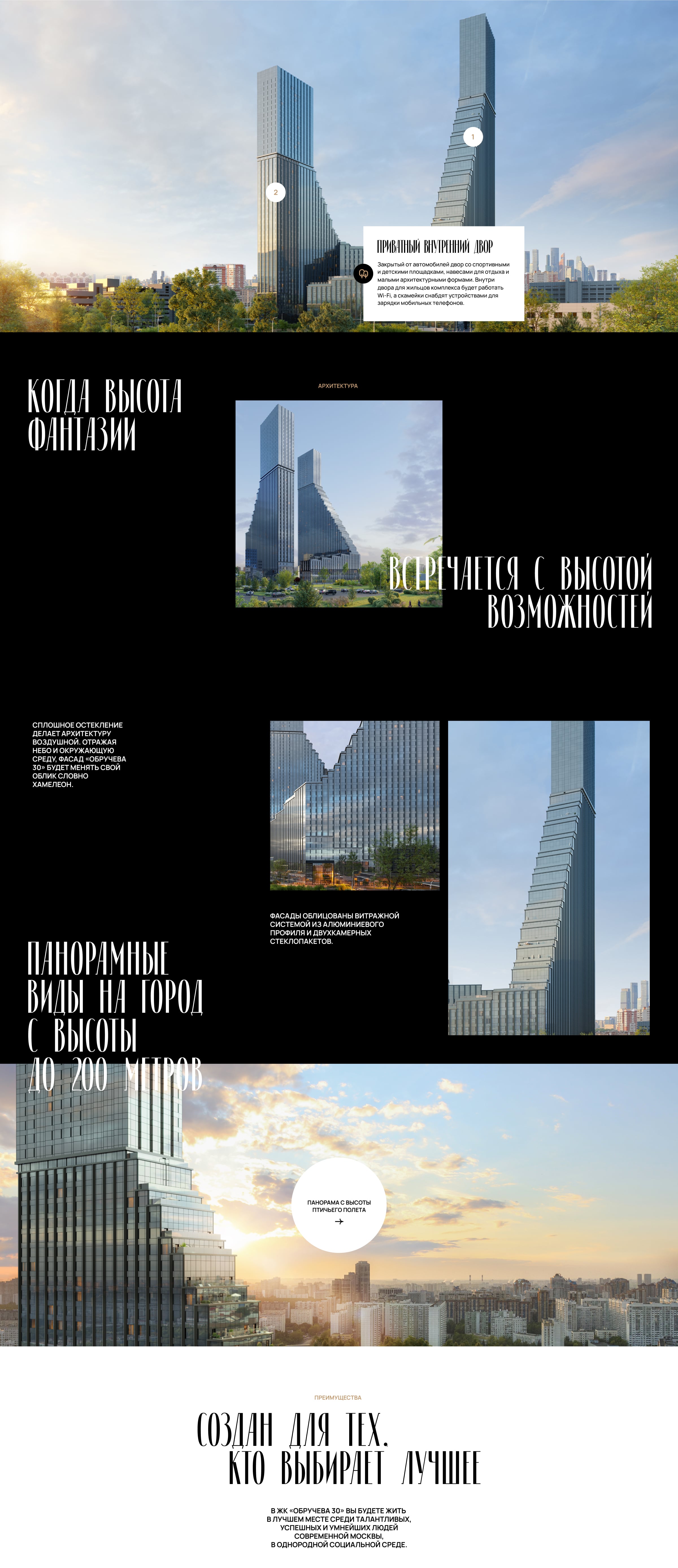 Мы разработали промо-сайт для жилого комплекса «Обручева 30», который строится в Москве. В процессе поиска визуального решения мы нашли вдохновение в первую очередь в самом архитектурном исполнении проекта. Поэтому в основу промо-сайта легла чистая, минималистичная сетка, простые и понятные человеку геометрические формы. Мы задействовали как можно больше воздуха в композиционных блоках, чтобы подчеркнуть чистые формы и линии небоскребов проекта «Обручева 30».