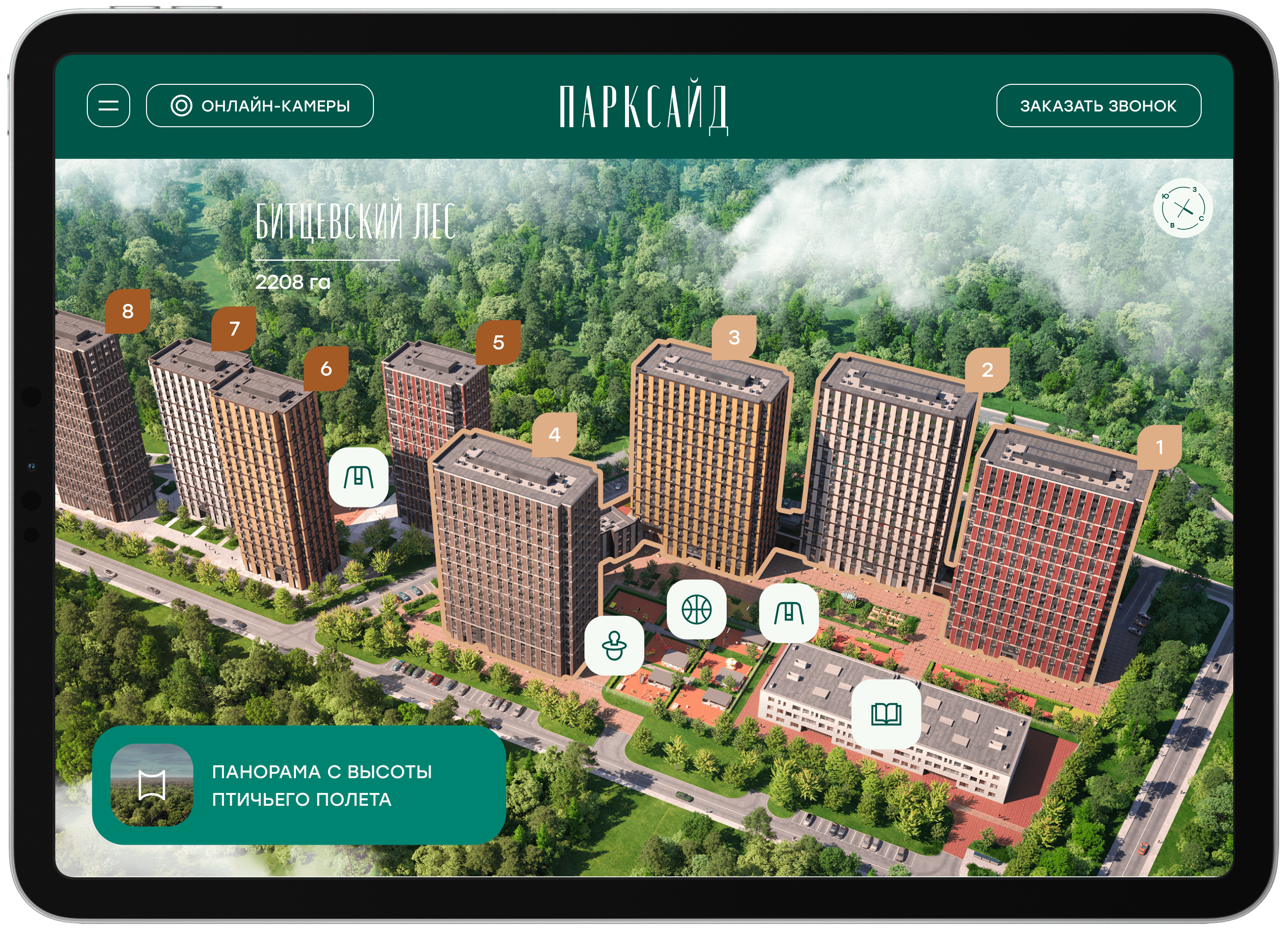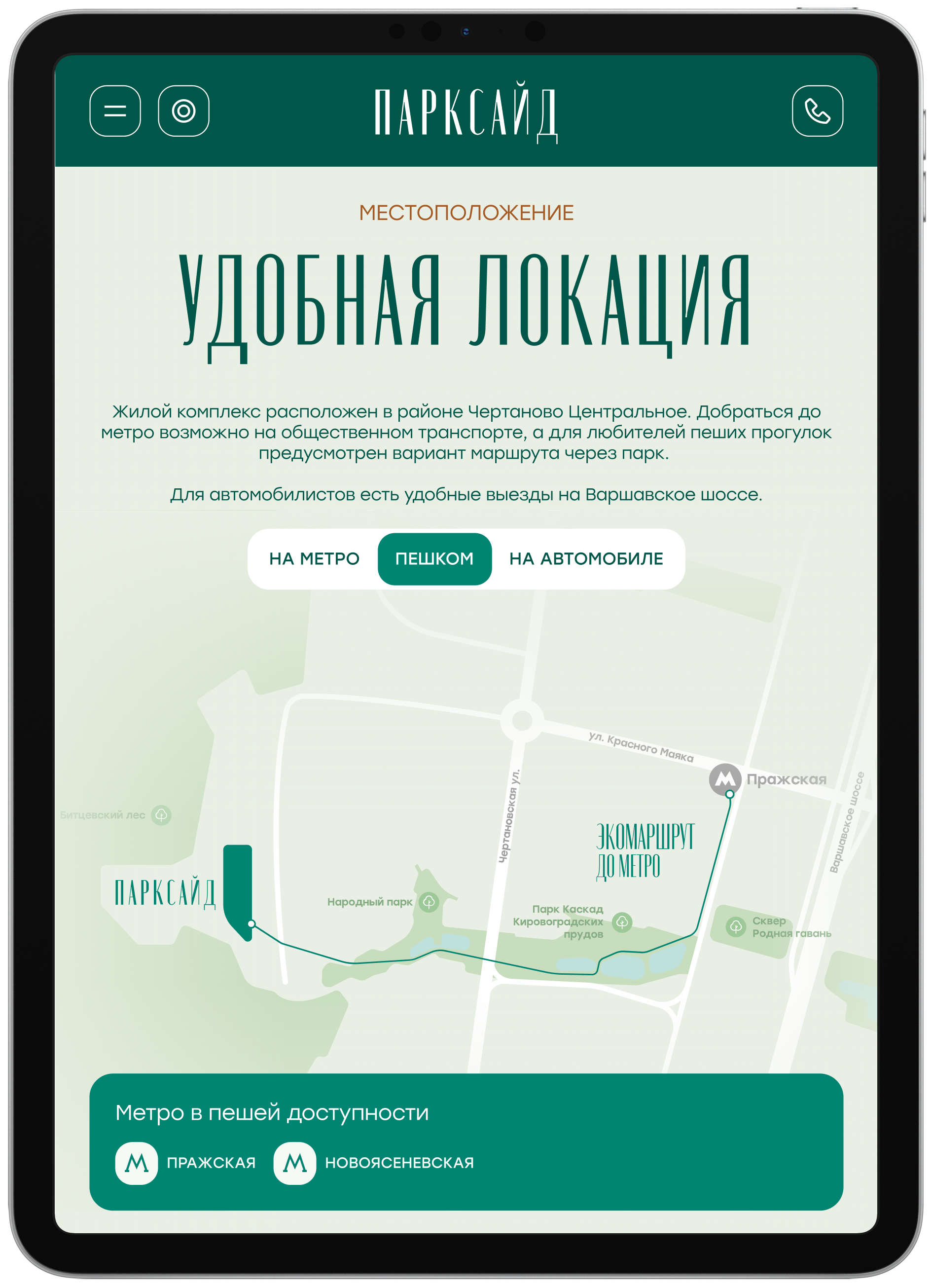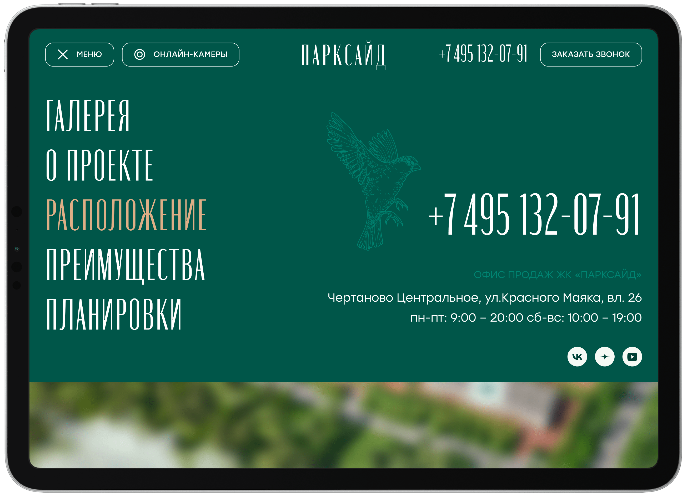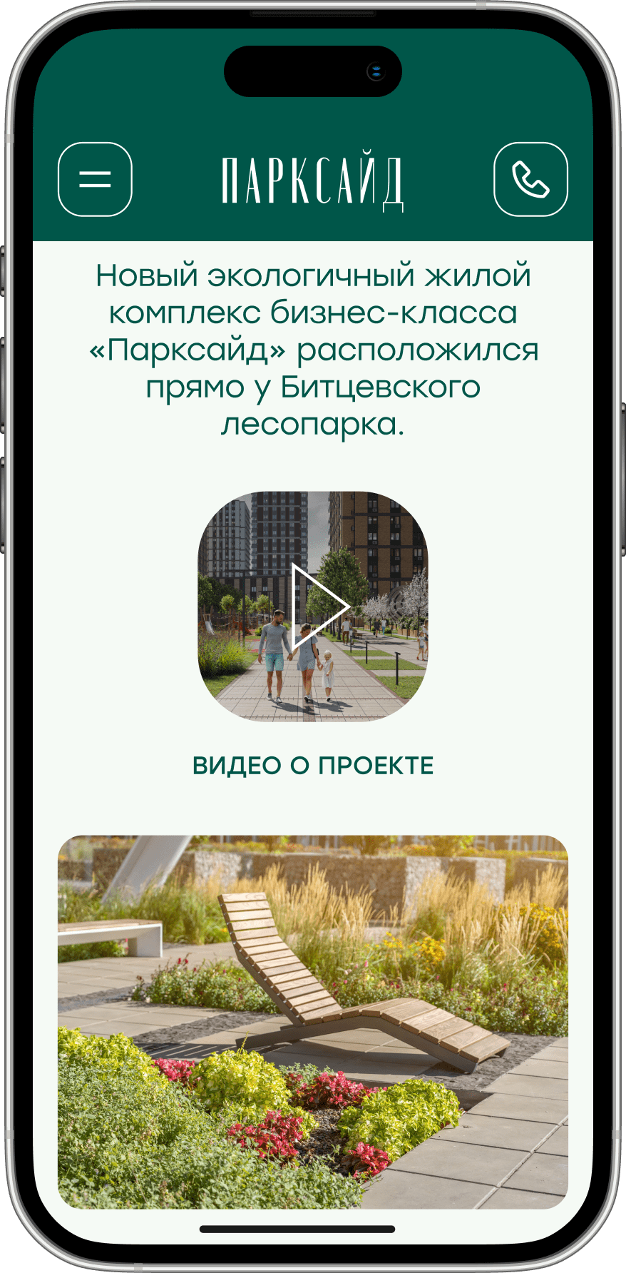 Мы разработали промо-сайт для жилого комплекса Парксайд, который расположился прямо у Битцевского лесопарка. Нам было важно раскрыть главное преимущества жилого комплекса — жизнь рядом с природой, и подчеркнуть его особенный фирменный стиль.