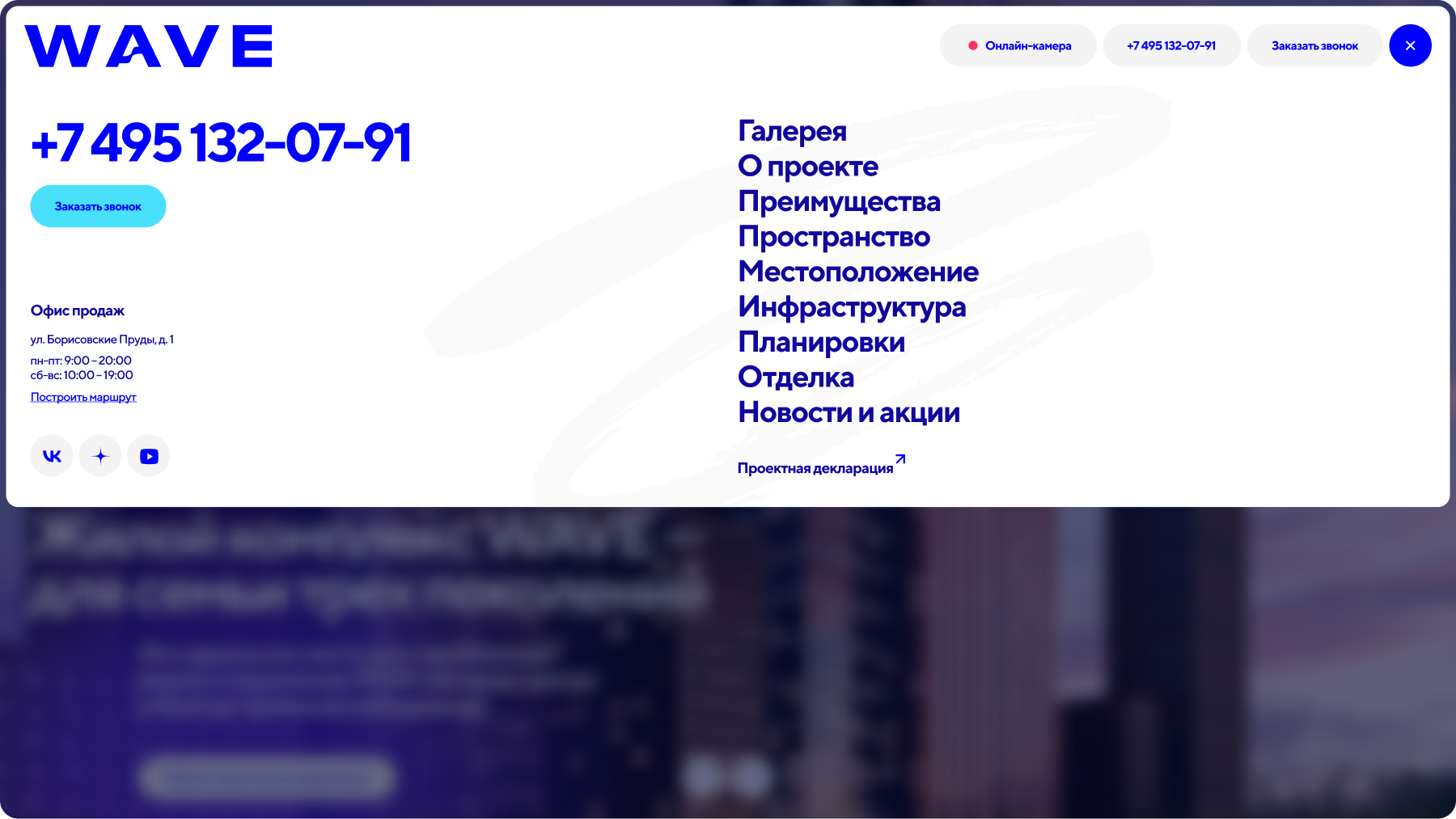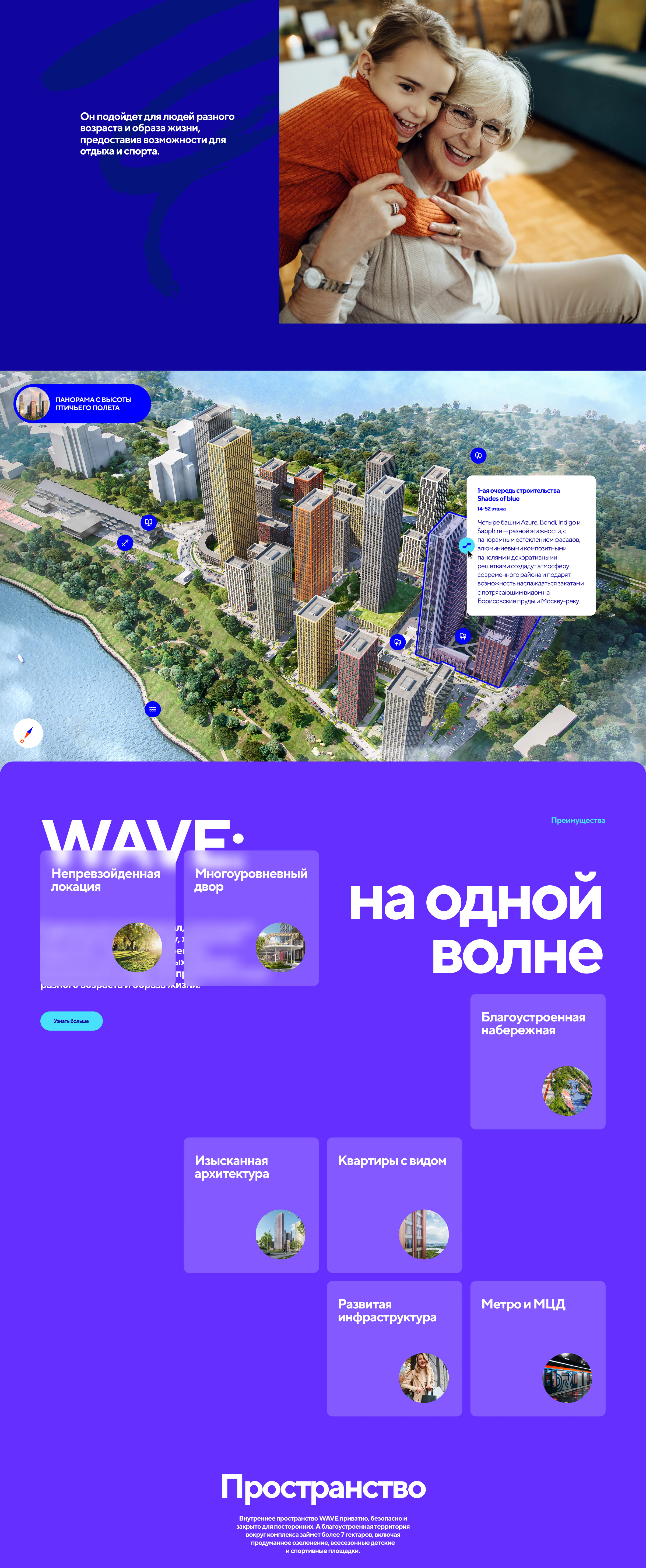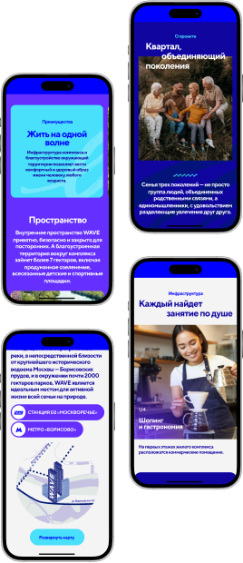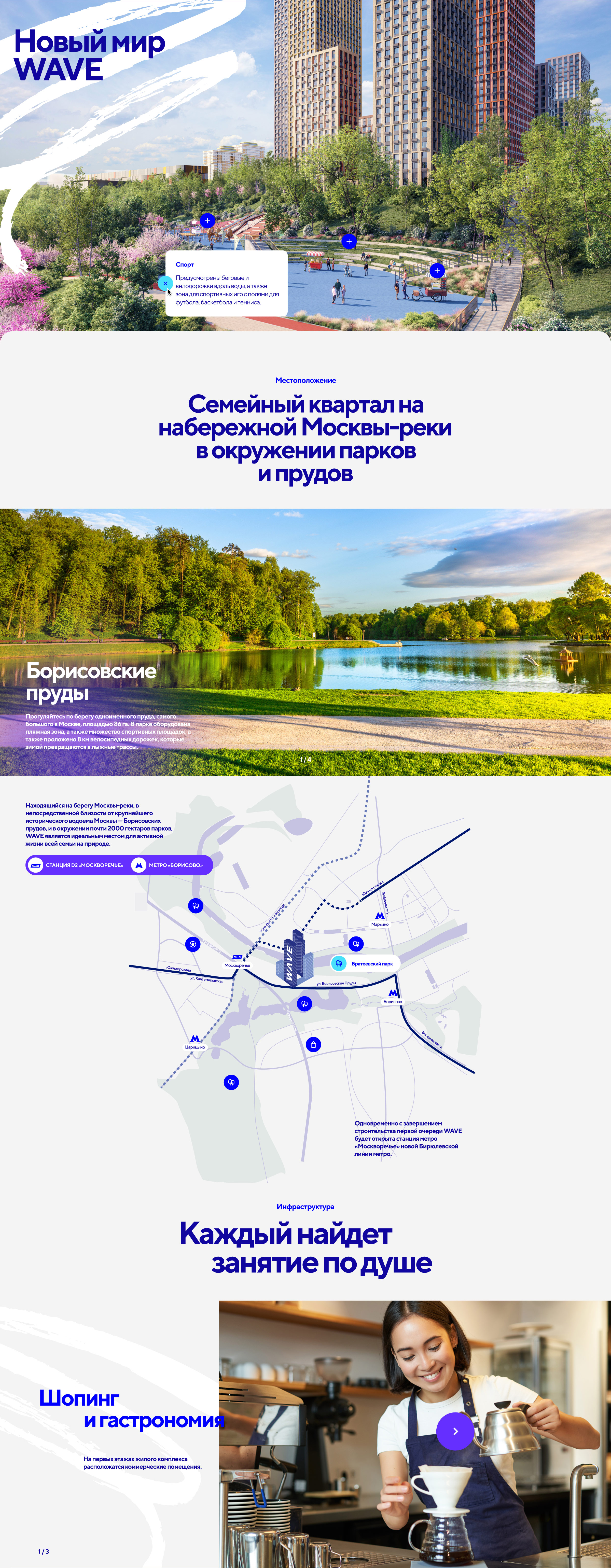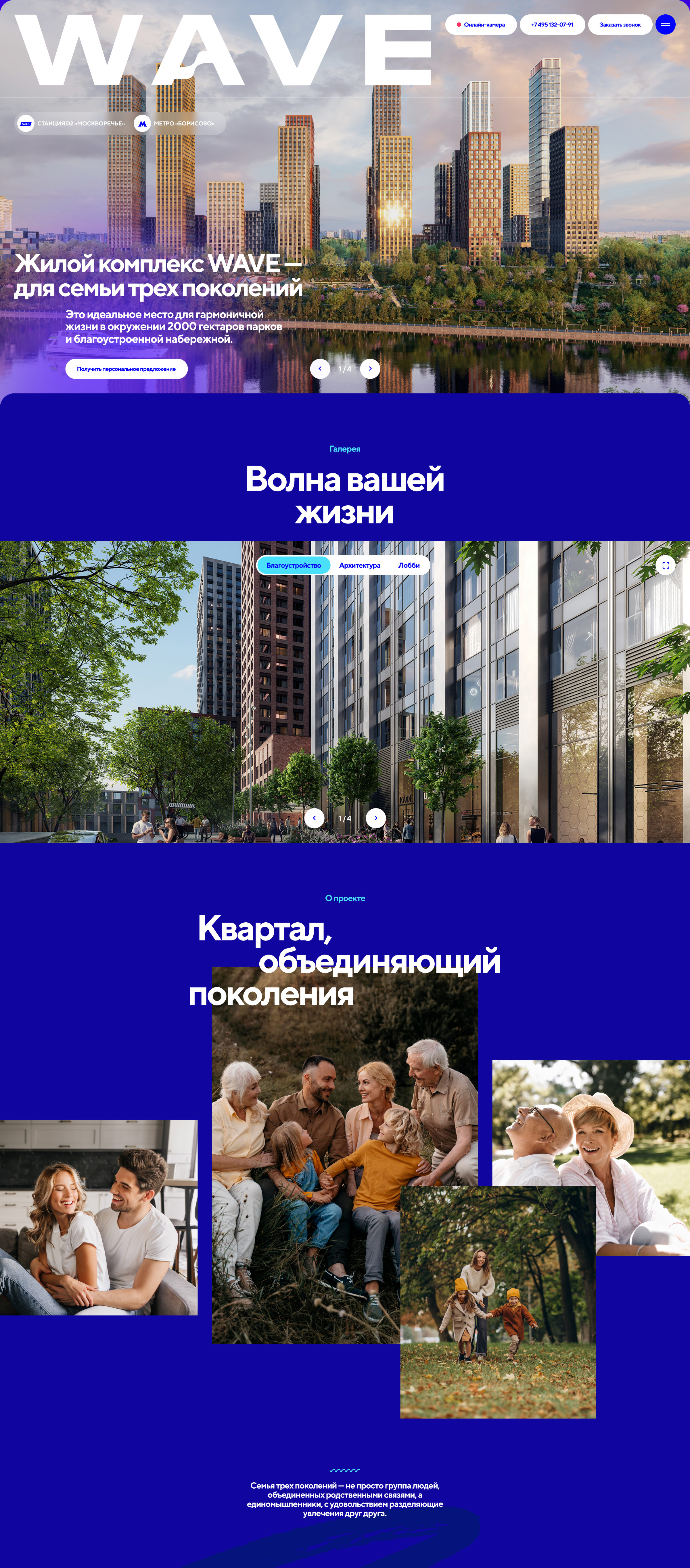 Мы разработали промо-сайт для жилого комплекса WAVE, который строится в Москве. Нам было важно раскрыть особенности и преимущества жилого комплекса и тем самым вызвать интерес у пользователей к проекту, а также подчеркнуть его особенный фирменный стиль.
