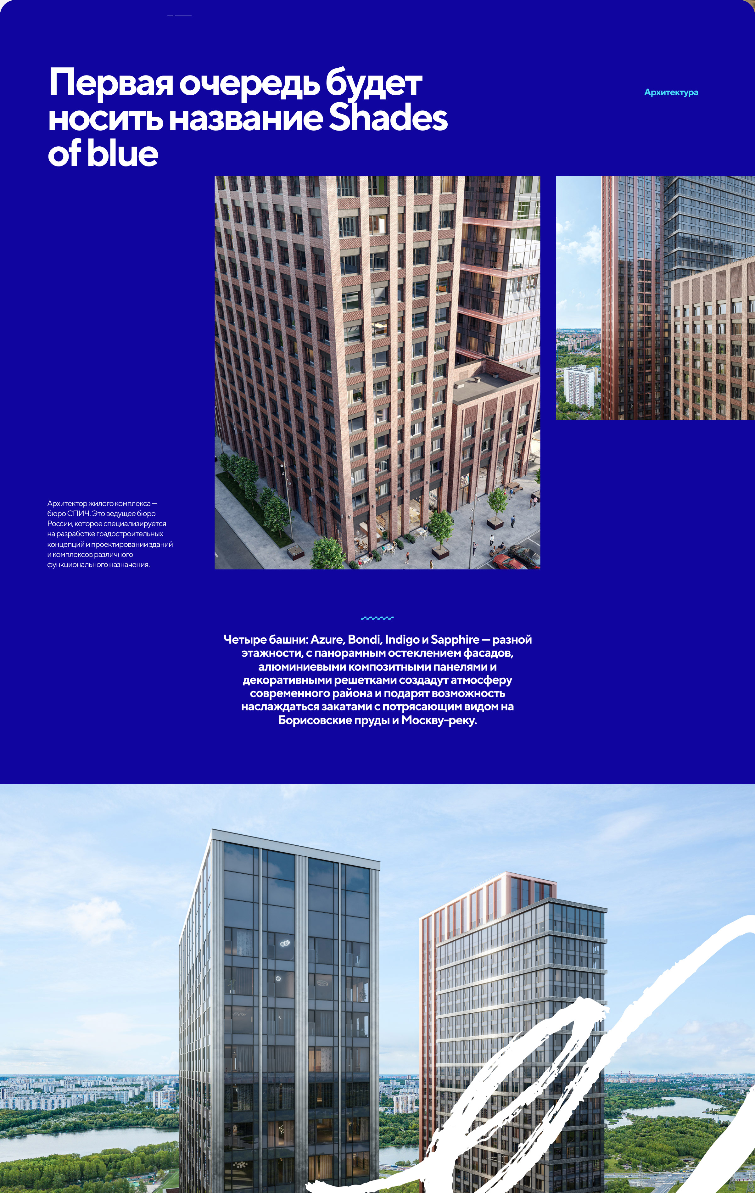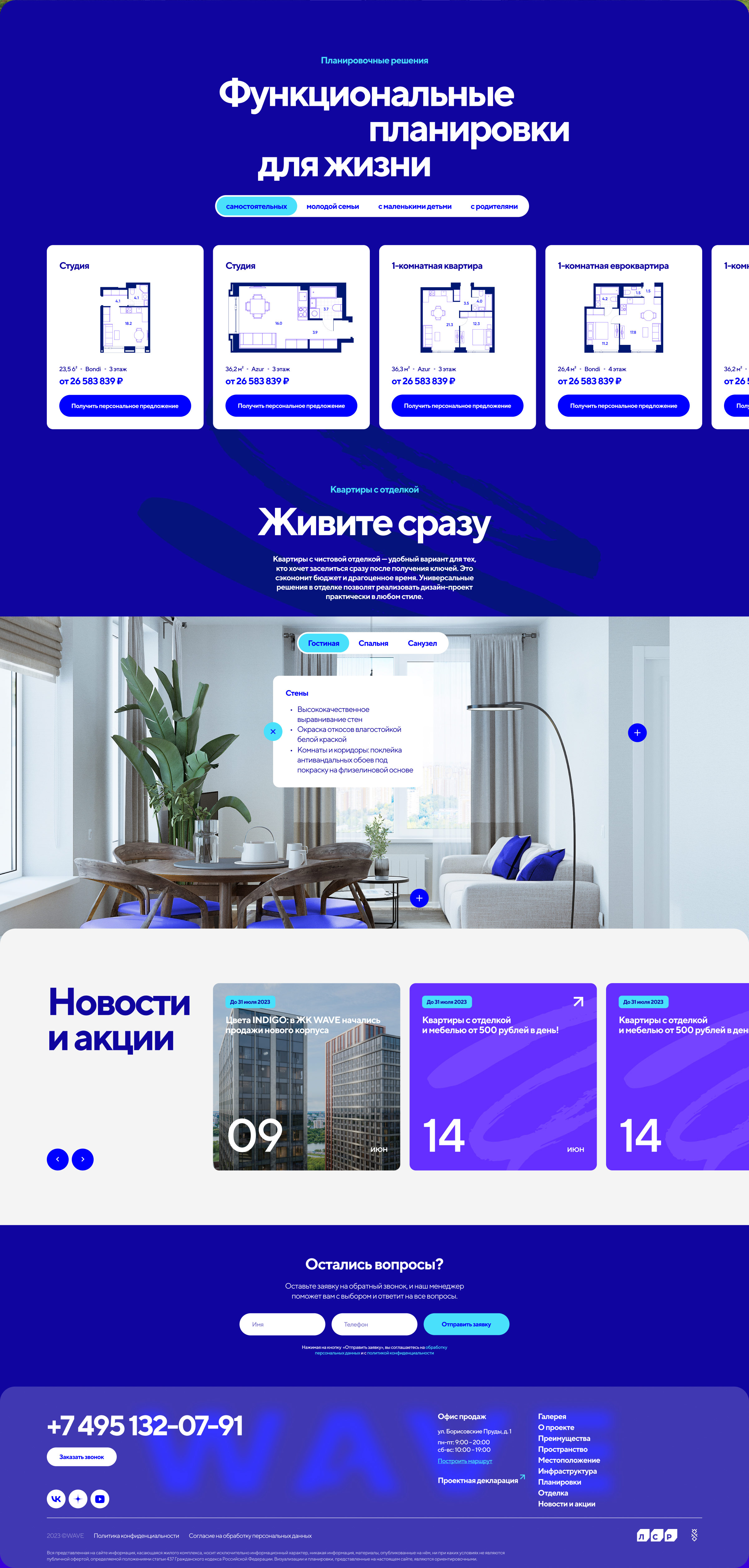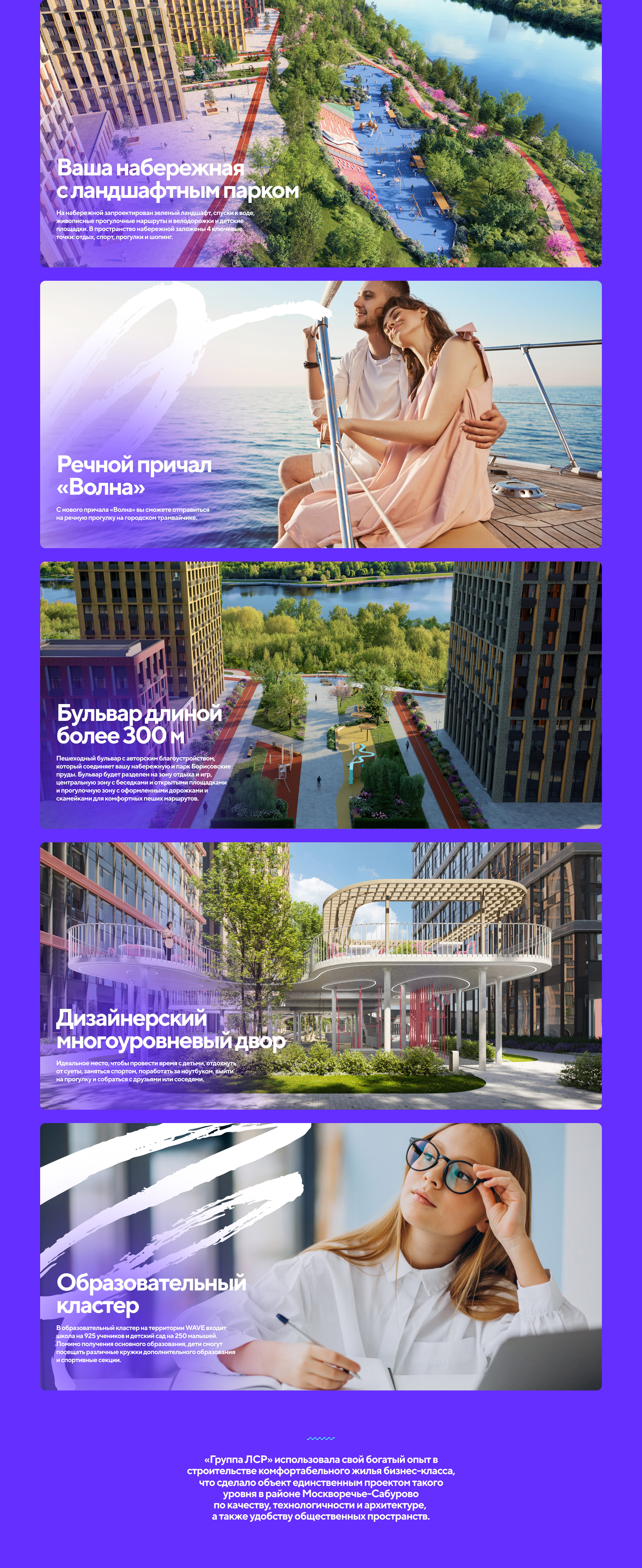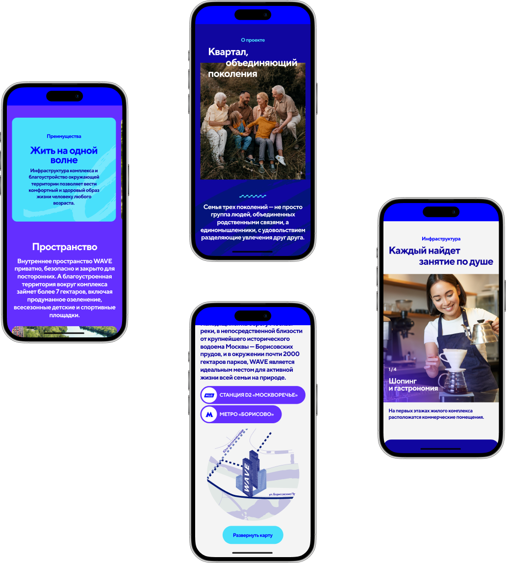 Мы разработали промо-сайт для жилого комплекса WAVE, который строится в Москве. Нам было важно раскрыть особенности и преимущества жилого комплекса и тем самым вызвать интерес у пользователей к проекту, а также подчеркнуть его особенный фирменный стиль.