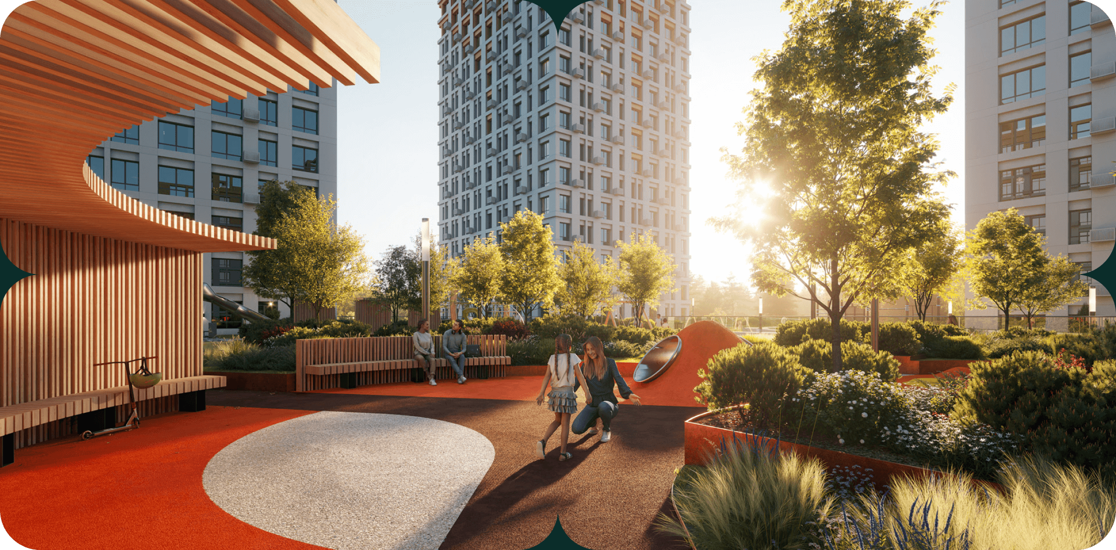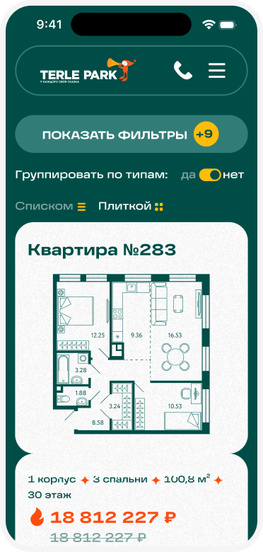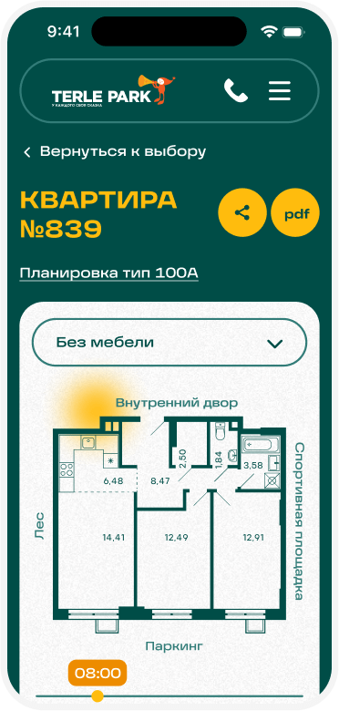 Страница квартиры и типовой планировки содержит всю необходимую информацию. Мы также внедрили особый механизм, позволяющий пользователю отслеживать движение солнца в течение дня вокруг квартиры. Так пользователь сможет лучше понять, где в квартире будет больше тепла и света.